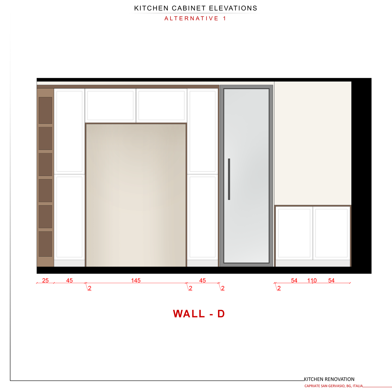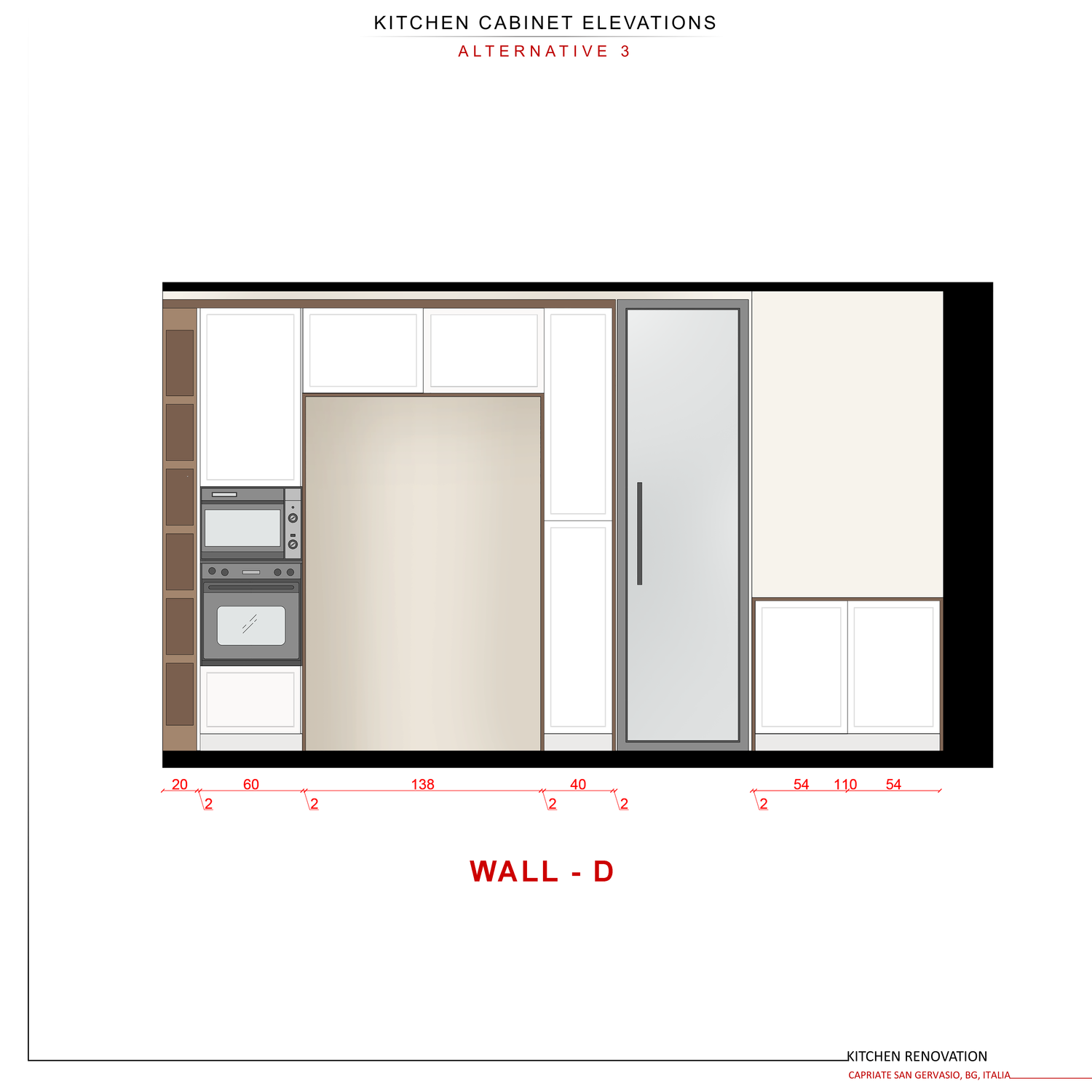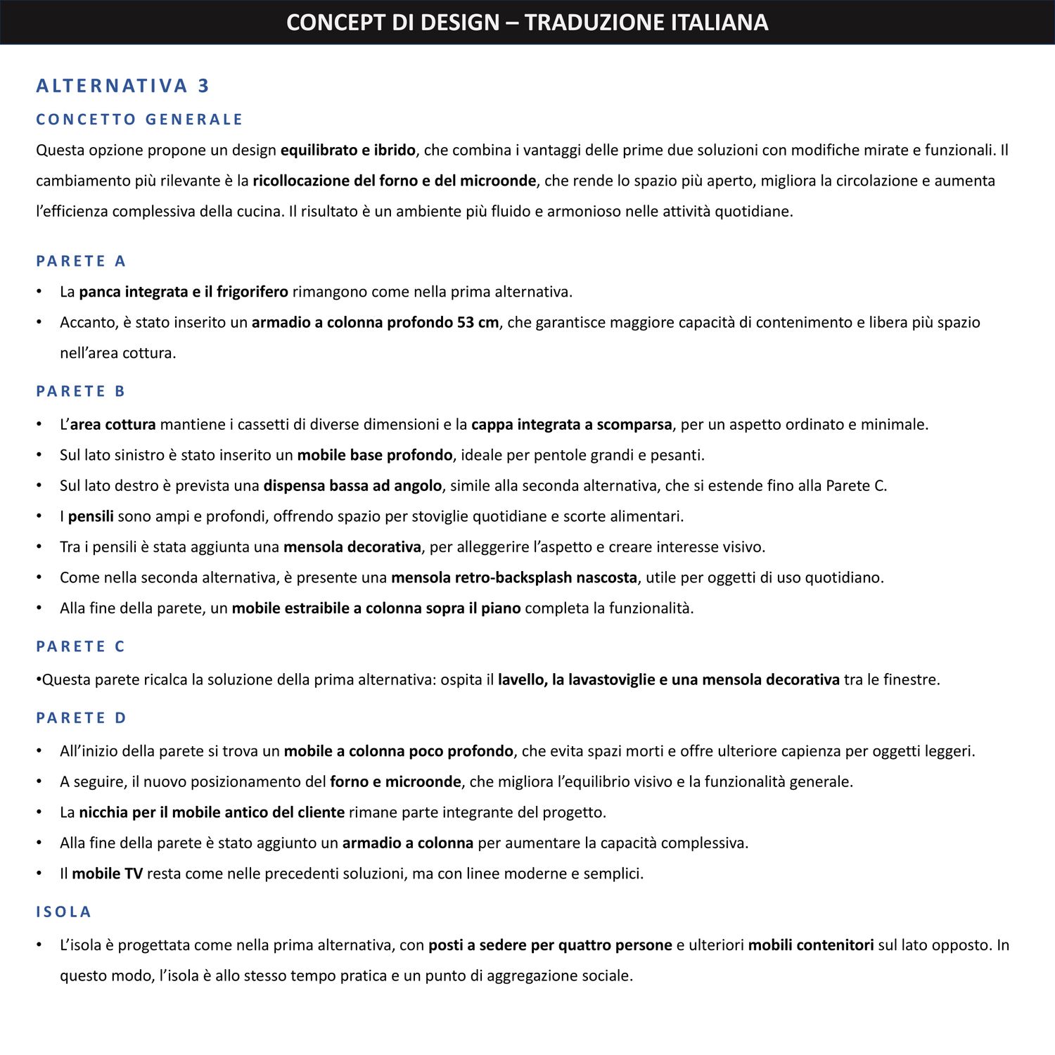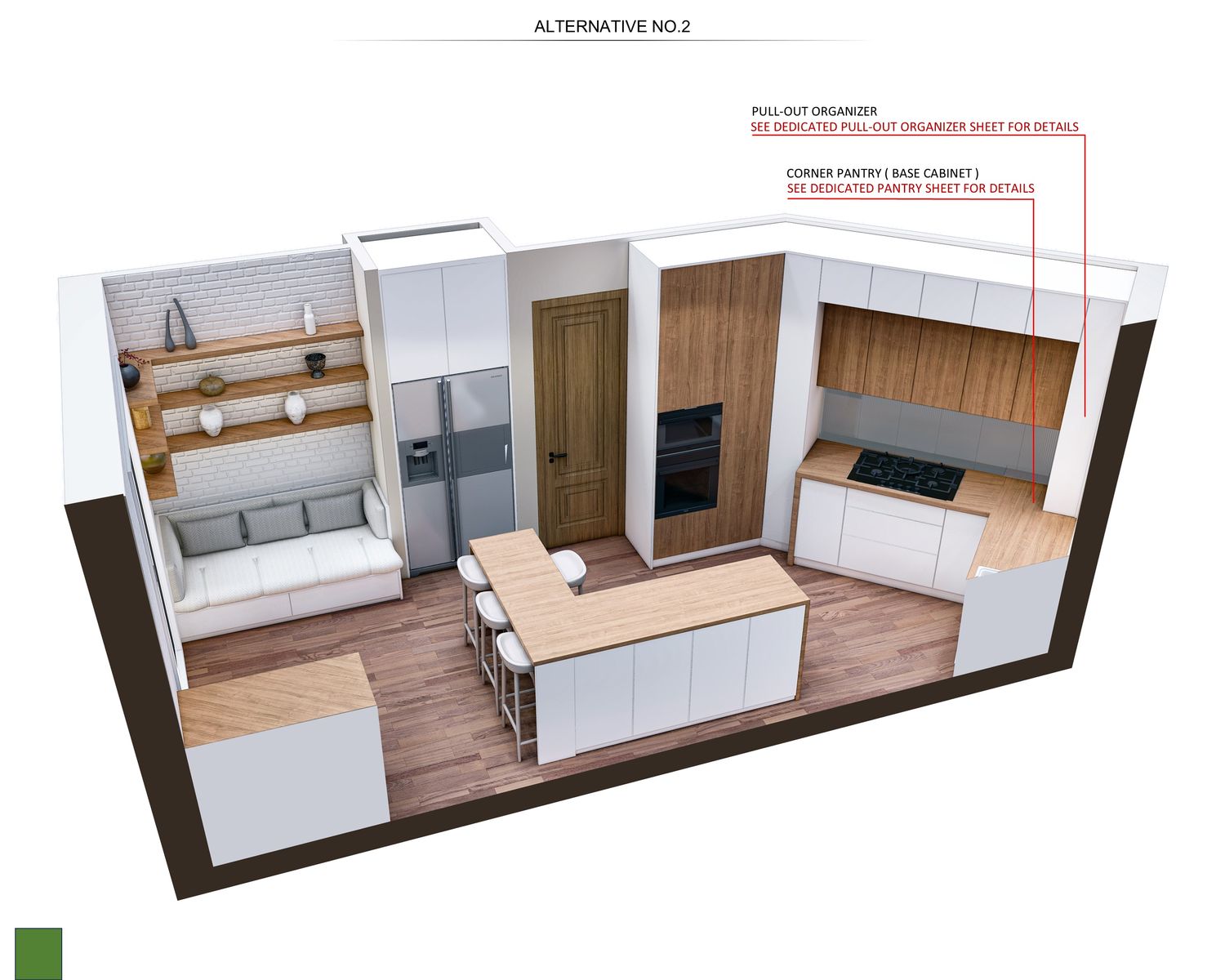 Considerando i vincoli esistenti, come la posizione fissa del frigorifero e il mantenimento del pavimento in parquet, e con l'obiettivo di risolvere sfide come lo spazio di stoccaggio insufficiente e l'accesso inadeguato ai pensili, abbiamo preparato tre concetti di design distinti ma completamente realizzabili. Ognuna di queste proposte offre un approccio diverso per creare uno spazio ideale in cui: