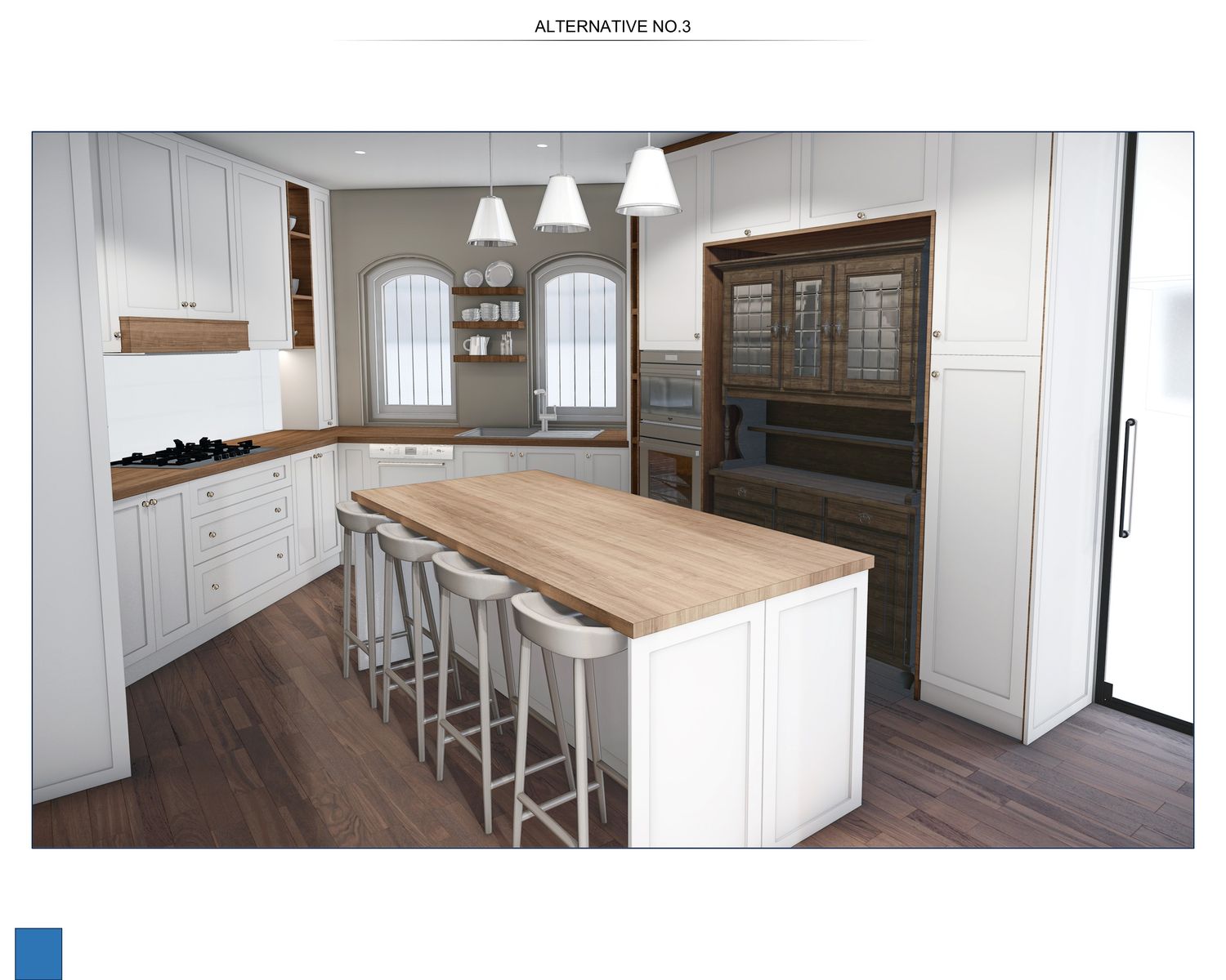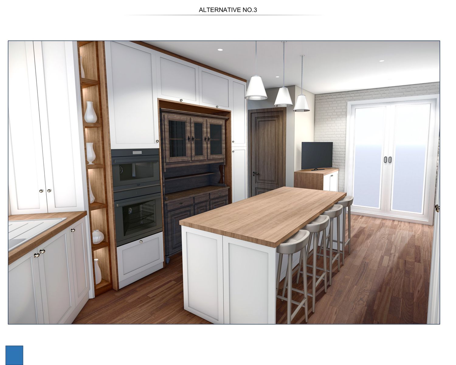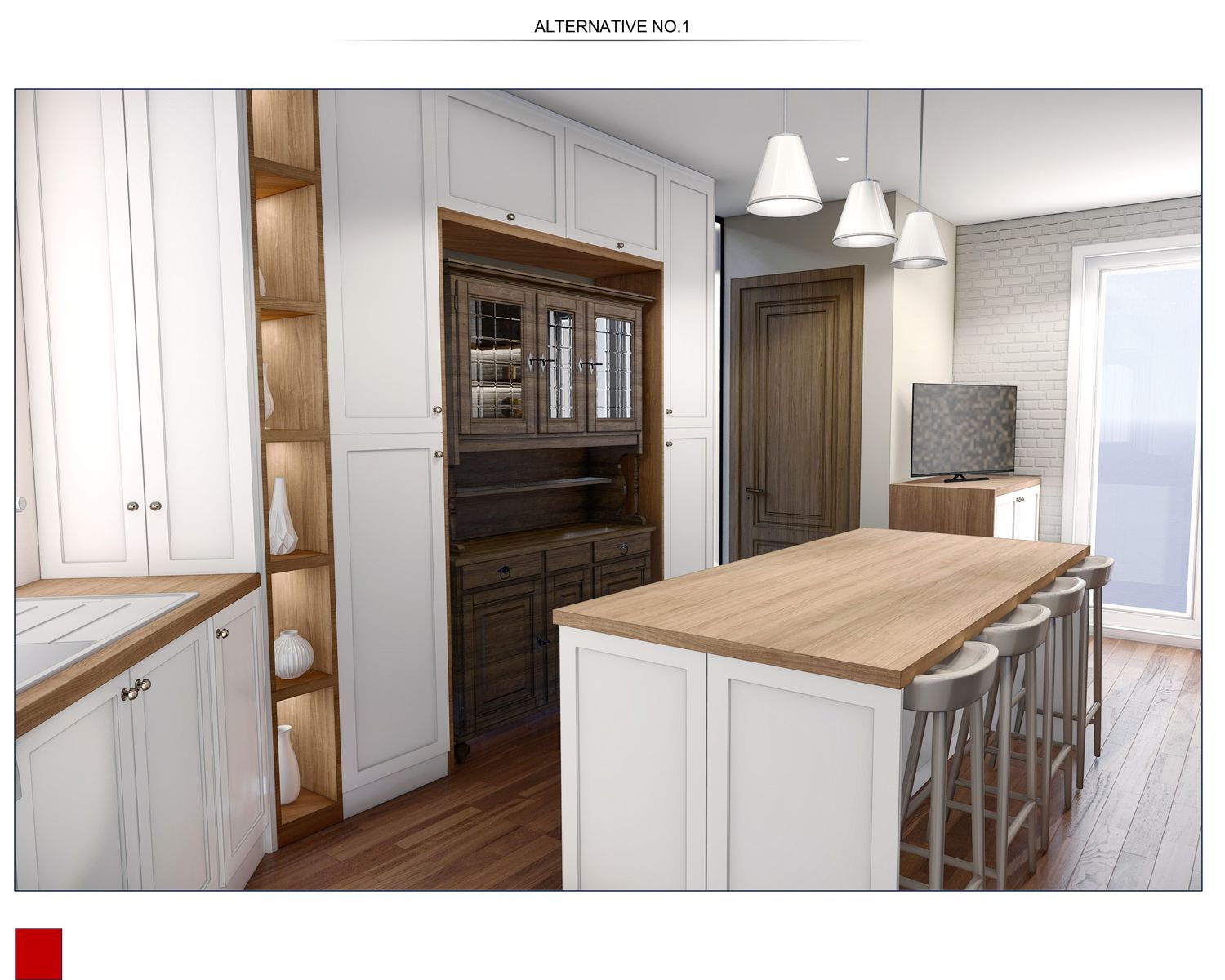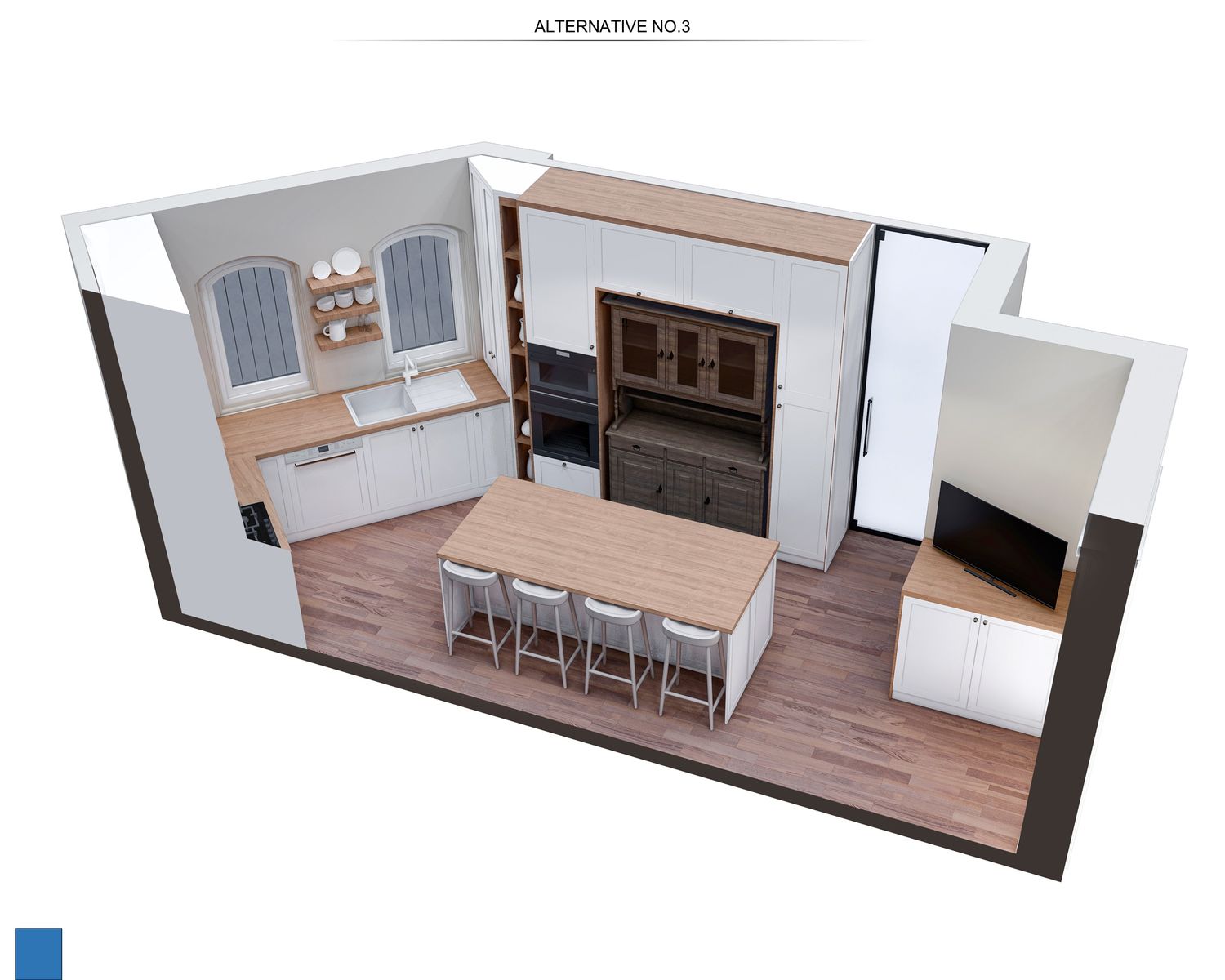 Our team has carefully and enthusiastically studied your request, gaining a deep understanding of your unique needs, challenges, and desires. We see the kitchen not just as a workspace but as the pulsating heart of the home and a gathering place for the family. We recognize the special importance you place on preserving elements like the cherished family heirloom sideboard and the comfortable sofa in this space.