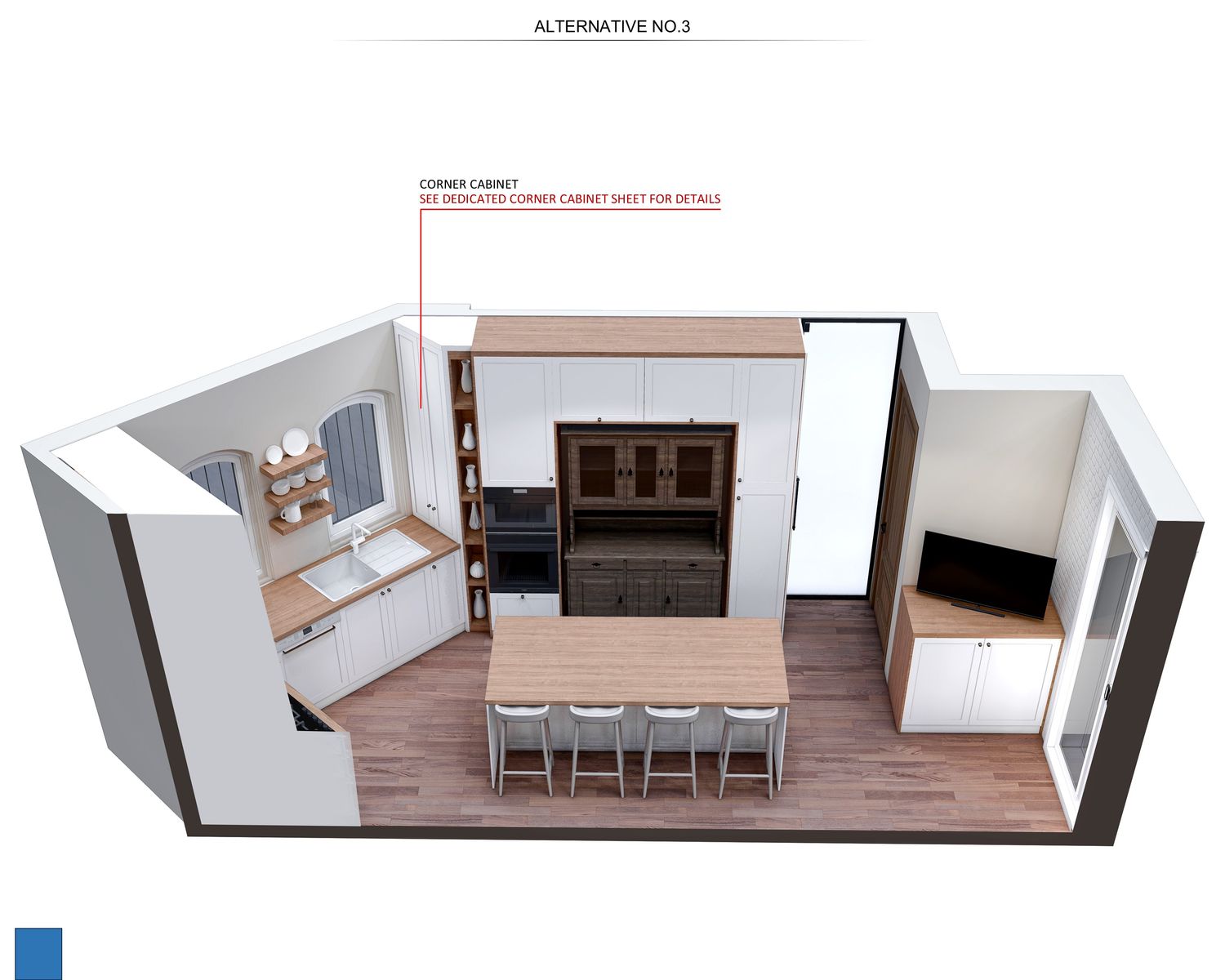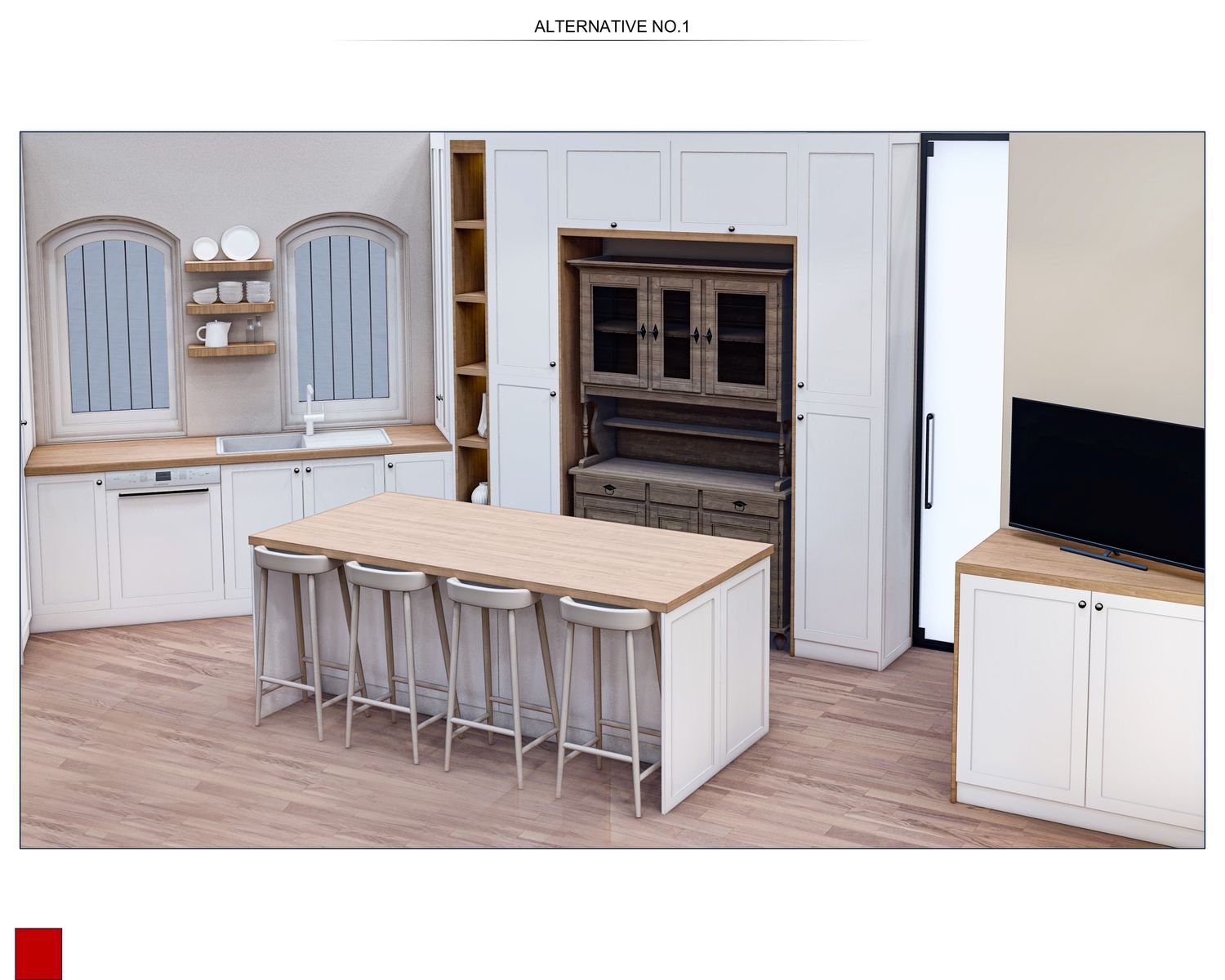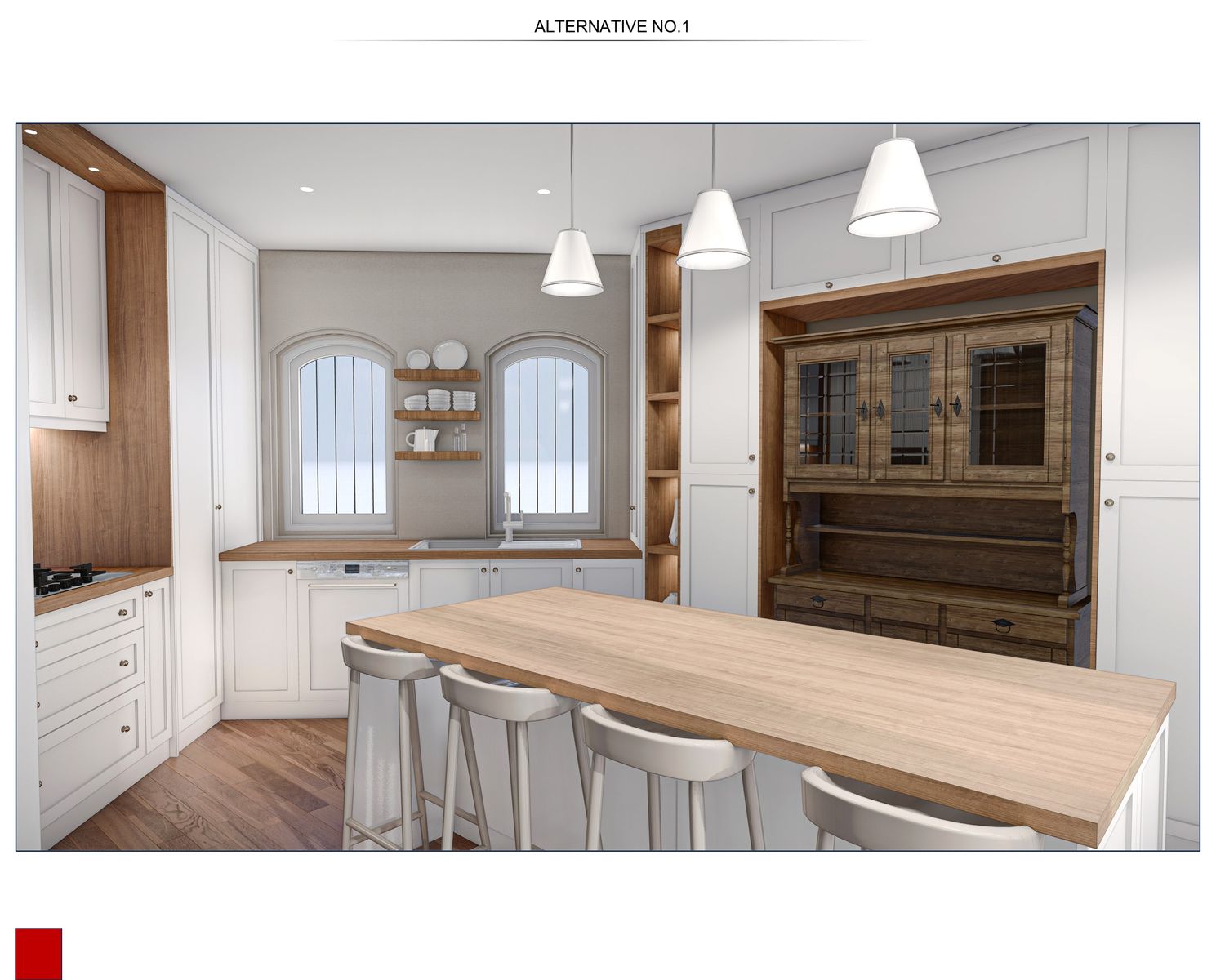 Our team has carefully and enthusiastically studied your request, gaining a deep understanding of your unique needs, challenges, and desires. We see the kitchen not just as a workspace but as the pulsating heart of the home and a gathering place for the family. We recognize the special importance you place on preserving elements like the cherished family heirloom sideboard and the comfortable sofa in this space.