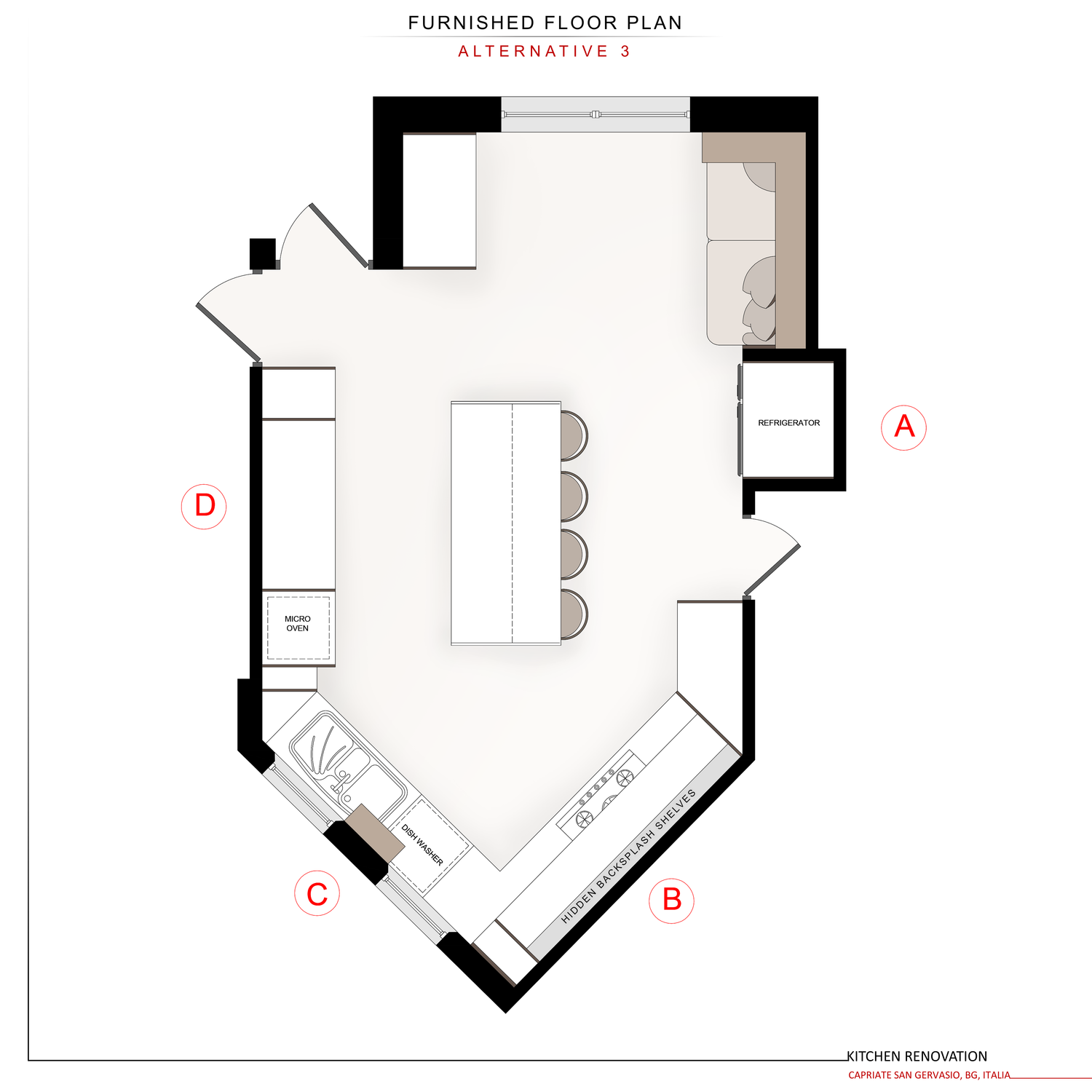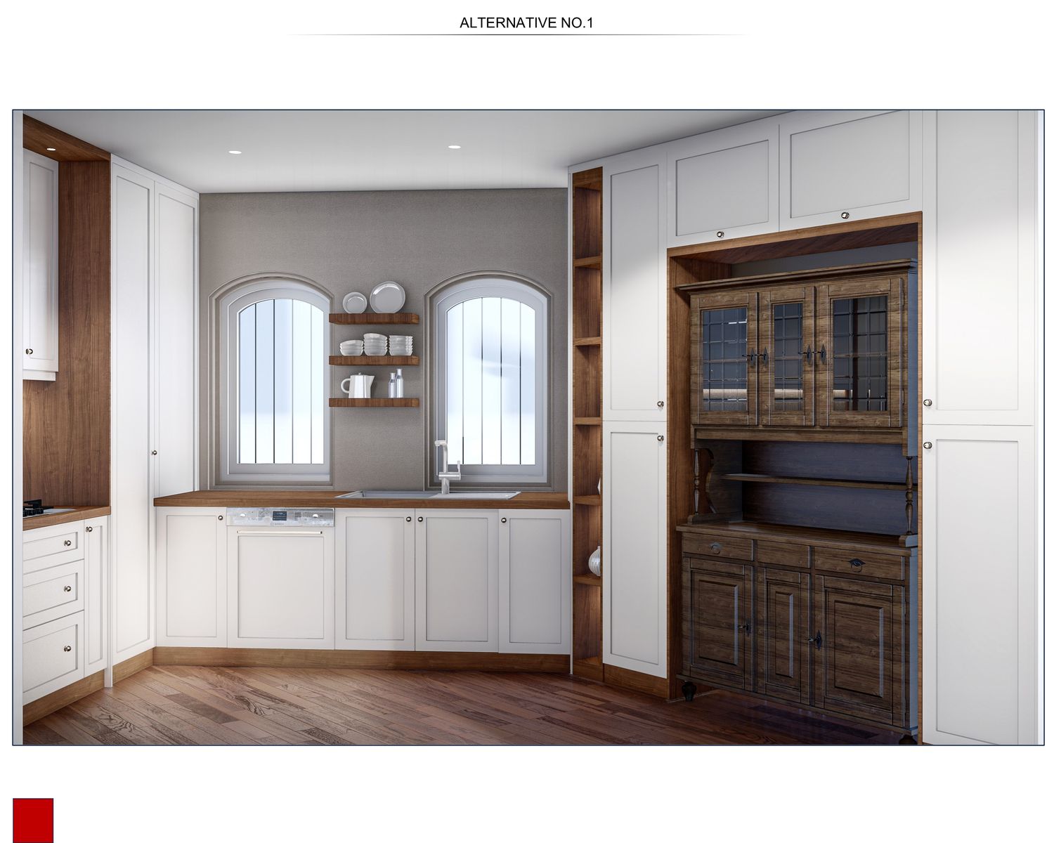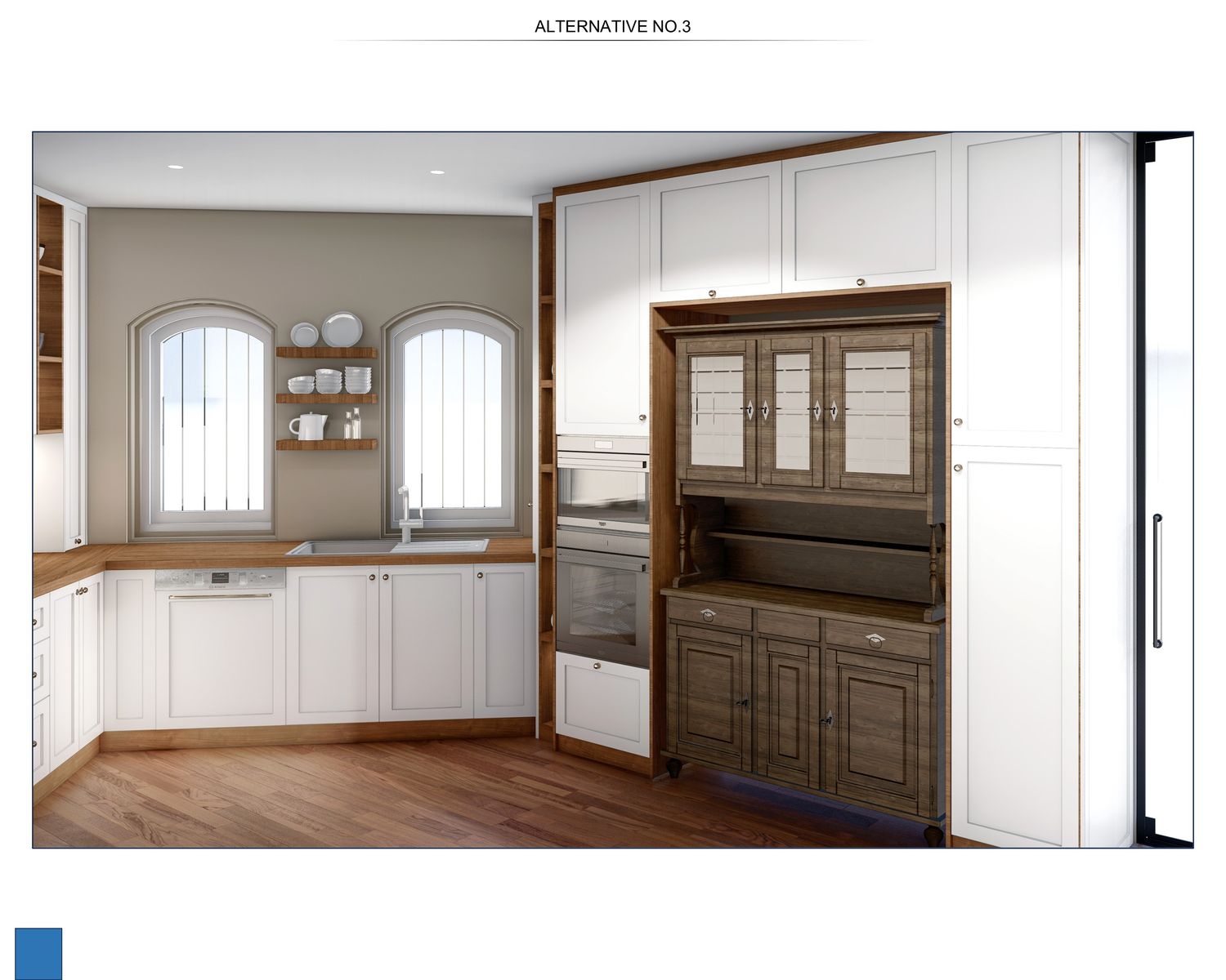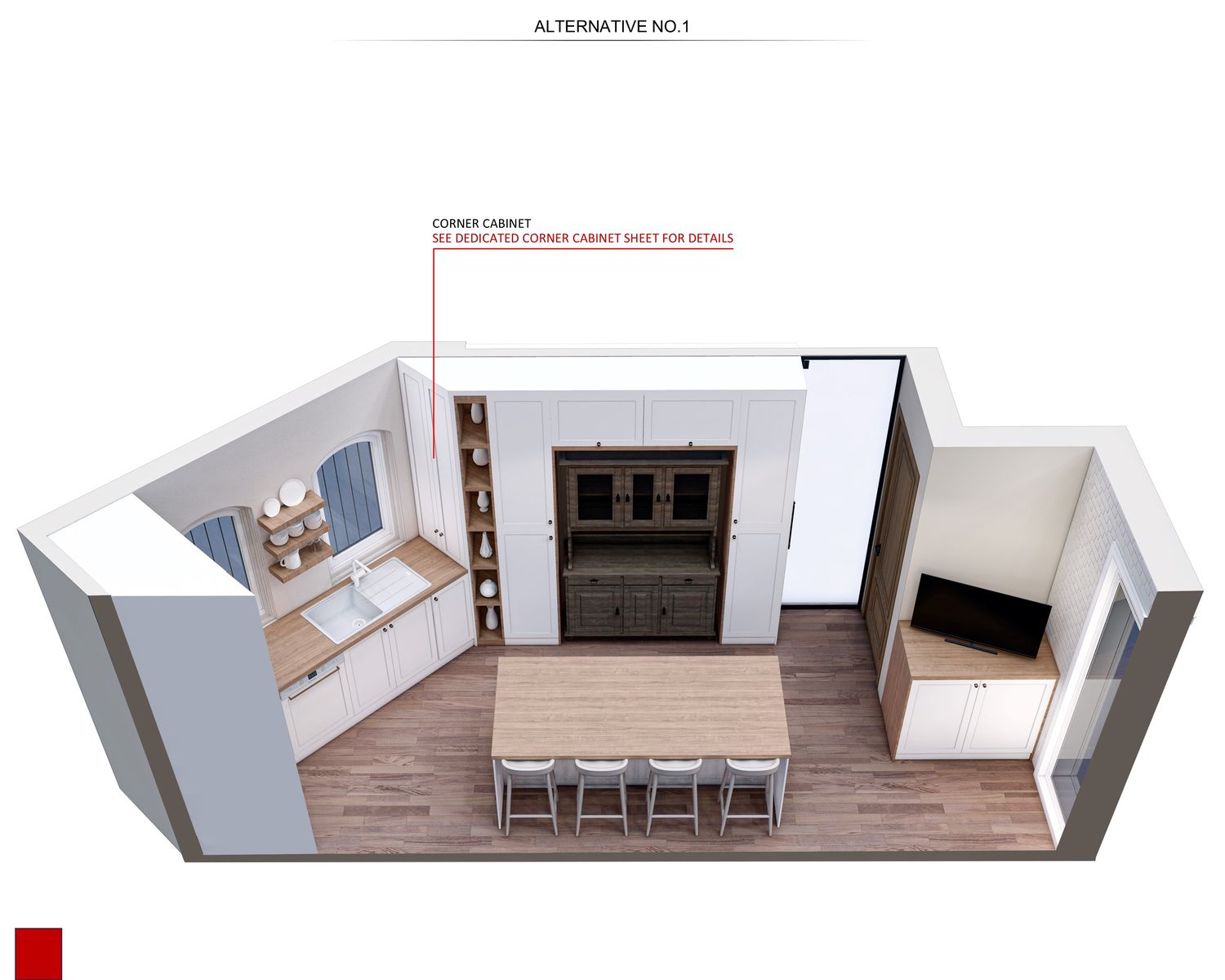 Our team has carefully and enthusiastically studied your request, gaining a deep understanding of your unique needs, challenges, and desires. We see the kitchen not just as a workspace but as the pulsating heart of the home and a gathering place for the family. We recognize the special importance you place on preserving elements like the cherished family heirloom sideboard and the comfortable sofa in this space.