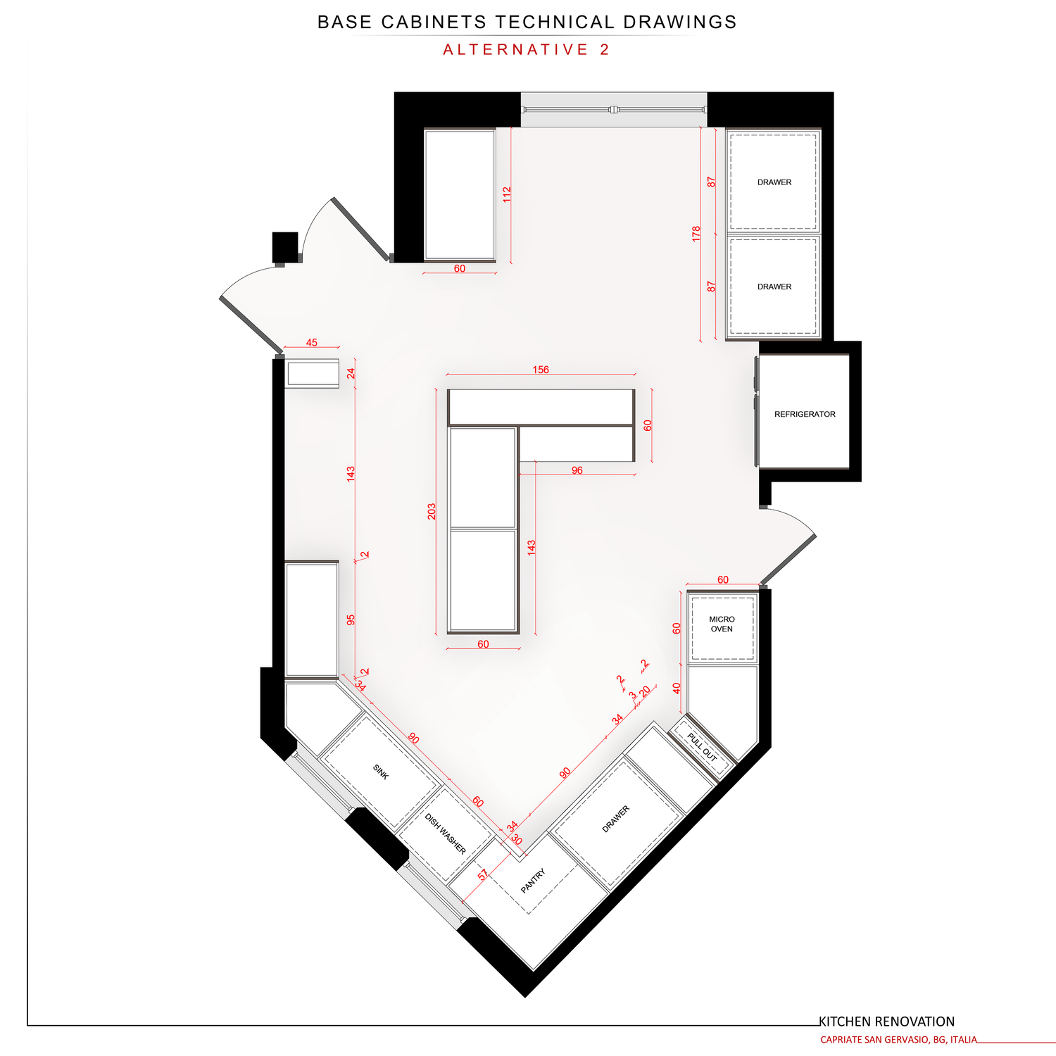 These designs align perfectly with your request for an industrial-style cooktop with 5 burners and a minimum width of 90 cm. To facilitate distinction, the renders and plans for each concept are marked with red (Option 1), green (Option 2), and blue (Option 3). All technical drawings and detailed execution plans are provided in their respective sheets. The Italian translation of the descriptions has also been included, either on the same sheet or a separate one, for your convenience.
