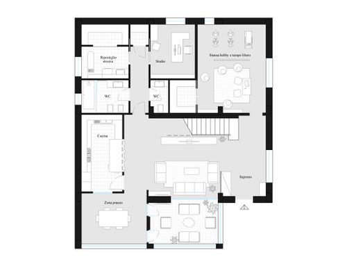 Sempre allo stato attuale la scala spunta direttamente nella living room. Sarebbe utile creare un disimpegno anche qui in modo che le stanze che vengono create sopra non risentono dei rumori provenienti dal piano inferiore.