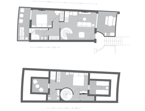 I would like to create a simple and functional environment. In the main room as soon as you enter there is the living room / kitchen. There is a hole in the floor, with a diameter of 180 to be used to install a straight, spiral or other staircase that connects the two floors. That hole would need to be narrowed or modified to reclaim as much space as possible upstairs to create a bedroom with wardrobes.