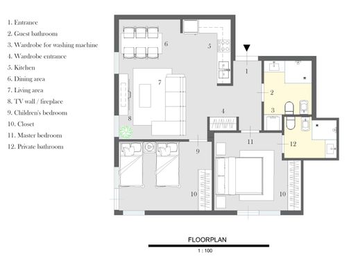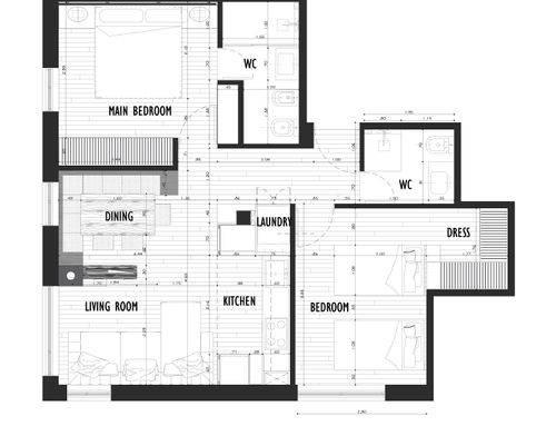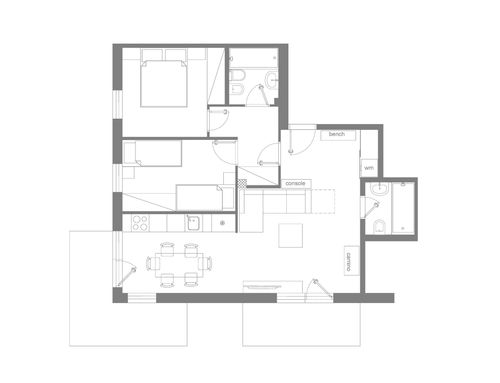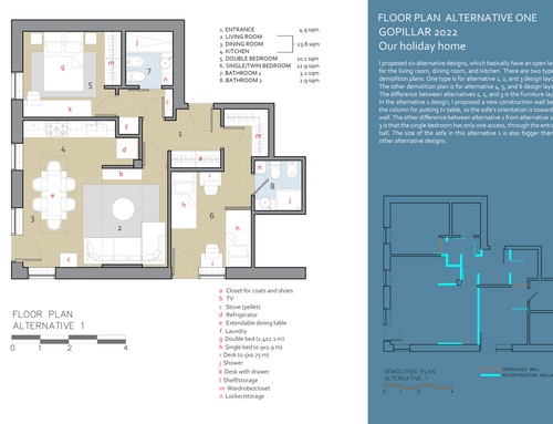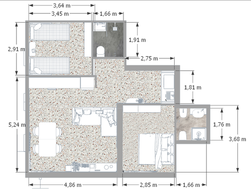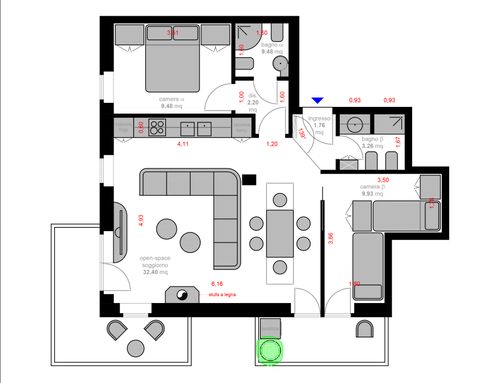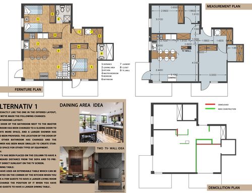 Somos una familia de 4 con dos hijas adolescentes y nos gustarĂa una casa de montaña, cálida y acogedora, evitando soluciones demasiado "pesadas" o llenas, con exceso de madera (paredes/revestimientos, acabado de cocina, techo, etc.). Nos gusta recibir amigos para comer y pasar las tardes juntos por eso nos gustarĂa un espacio "muy social", con un bonito sofá esquinero, una mesa de 6 plazas (ampliable a 10), una zona de cocina grande y funcional, abierta al Resto de la sala, quizás con un mostrador. Nos gustarĂa una vivienda práctica y funcional, con armarios y los espacios adecuados para guardarlo todo. El salĂłn es muy luminoso con dos ventanas y un tercer bloque de ventana + puerta francesa y nos gustarĂa que el sofá estuviera mirando hacia las ventanas y la tele a una distancia correcta del propio sofá. En el salĂłn es posible ubicar una estufa (imprescindible para nosotros) en tres posiciones diferentes que se indican en una tabla. Debe haber dos dormitorios, uno doble y otro doble con dos camas individuales (no literas), ambos con armario. Los dos baños ciegos no son grandes y conviene estudiarlos bien, ambos con ducha y taquilla, y al menos uno con bidĂ©. Para entender dĂłnde poner la lavadora. La zona de entrada es muy/demasiado grande y conviene aprovecharla al máximo, incluso previendo una zona de guardarropas. Desafortunadamente, hay un pilar entre la entrada y la sala de estar. Hoy uno de los dormitorios tiene una pared corrediza que, por supuesto, se convertirá en una pared estándar. Todos los muebles en las fotos, excepto quizás el sofá, necesitan ser reemplazados, y con la renovaciĂłn se pueden mover las paredes, rehacer los baños y reemplazar el piso. Los accesorios son nuevos. Entre los archivos subidos, hay algunas de mis hipĂłtesis de diseño (soy un arquitecto fracasado ;-)