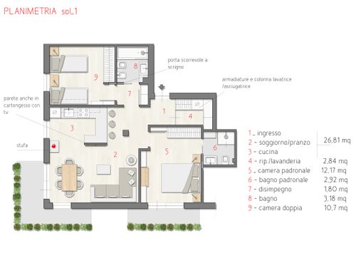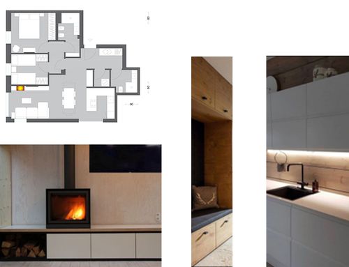 We are a family of 4 with two teenage daughters and we would like a mountain house, warm and welcoming, avoiding solutions that are too "heavy" or full, with excessive wood (walls / panelling, kitchen finish, ceiling, etc.). We like to receive friends to eat and spend afternoons together so we would like a "very social" space, with a nice corner sofa, a 6-seater table (extendable to 10), a large and functional kitchen area that is open to the rest of the living room, perhaps with a counter. We would like a practical and functional home, with wardrobes and the right spaces to store everything. The living room is very bright with two windows and a third block made of window + French door and we would like the sofa to be facing the windows and the TV to be at a correct distance from the sofa itself. In the living room it is possible to locate a stove (essential for us) in three different positions which are indicated in a attached table. There must be two bedrooms, one double and one twin with two single beds (not a bunk bed), both with wardrobe. The two blind bathrooms are not large and should be studied well, both with shower and locker, and at least one with bidet. To understand where to put the washing machine. The actual entrance area is too large and should be exploited to the fullest, even providing a wardrobe area. Unfortunately there is a pillar between the entrance and the living room. Today one of the bedrooms has a sliding wall which will, of course, be made a standard wall. All the furnishings in the photos, except perhaps the sofa, need to be replaced, and with the renovation the walls can be moved, the bathrooms redone and the floor replaced. The fixtures are new. Among the uploaded files, there are some of my design hypotheses (I'm a wanna be architect ;-)