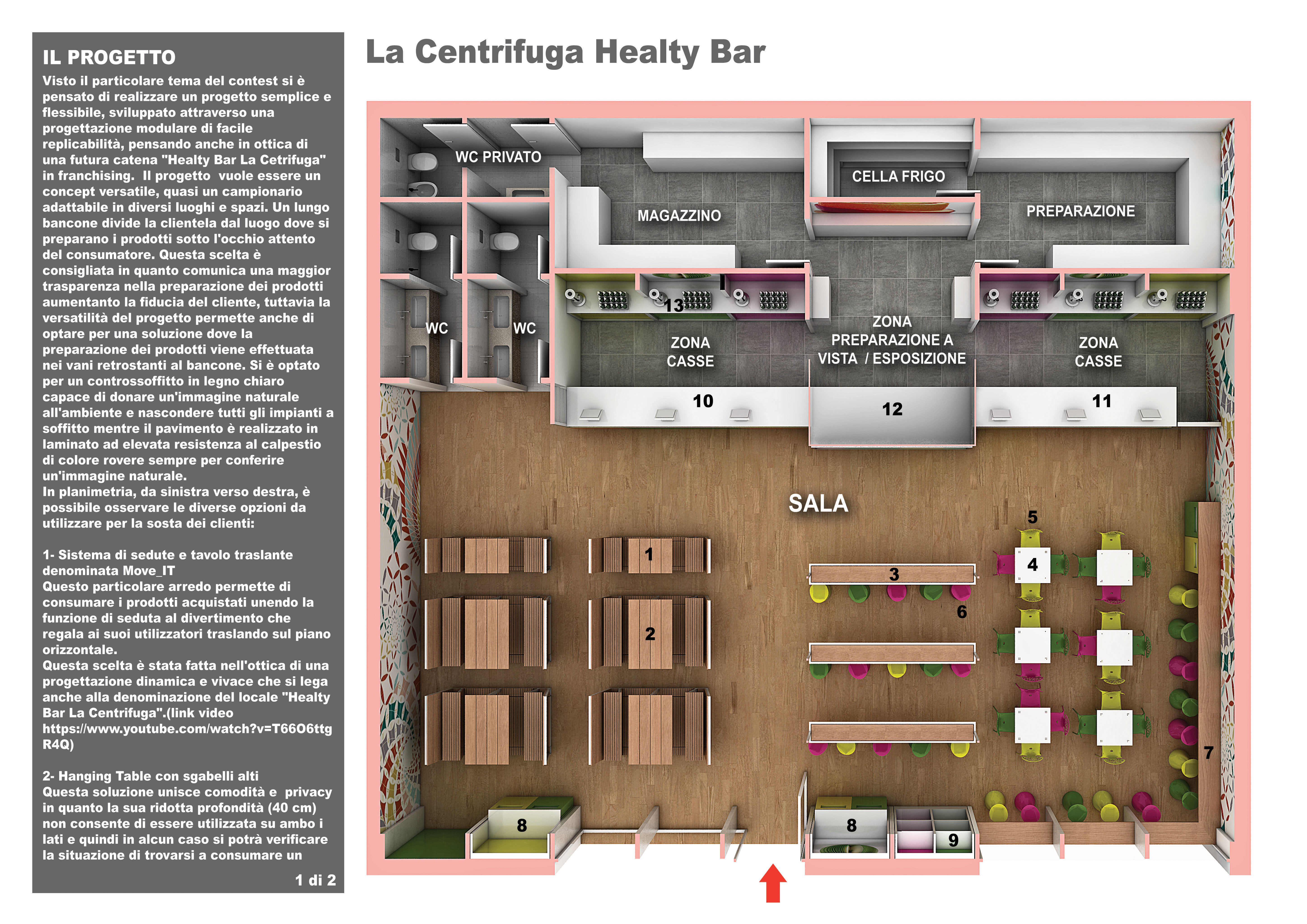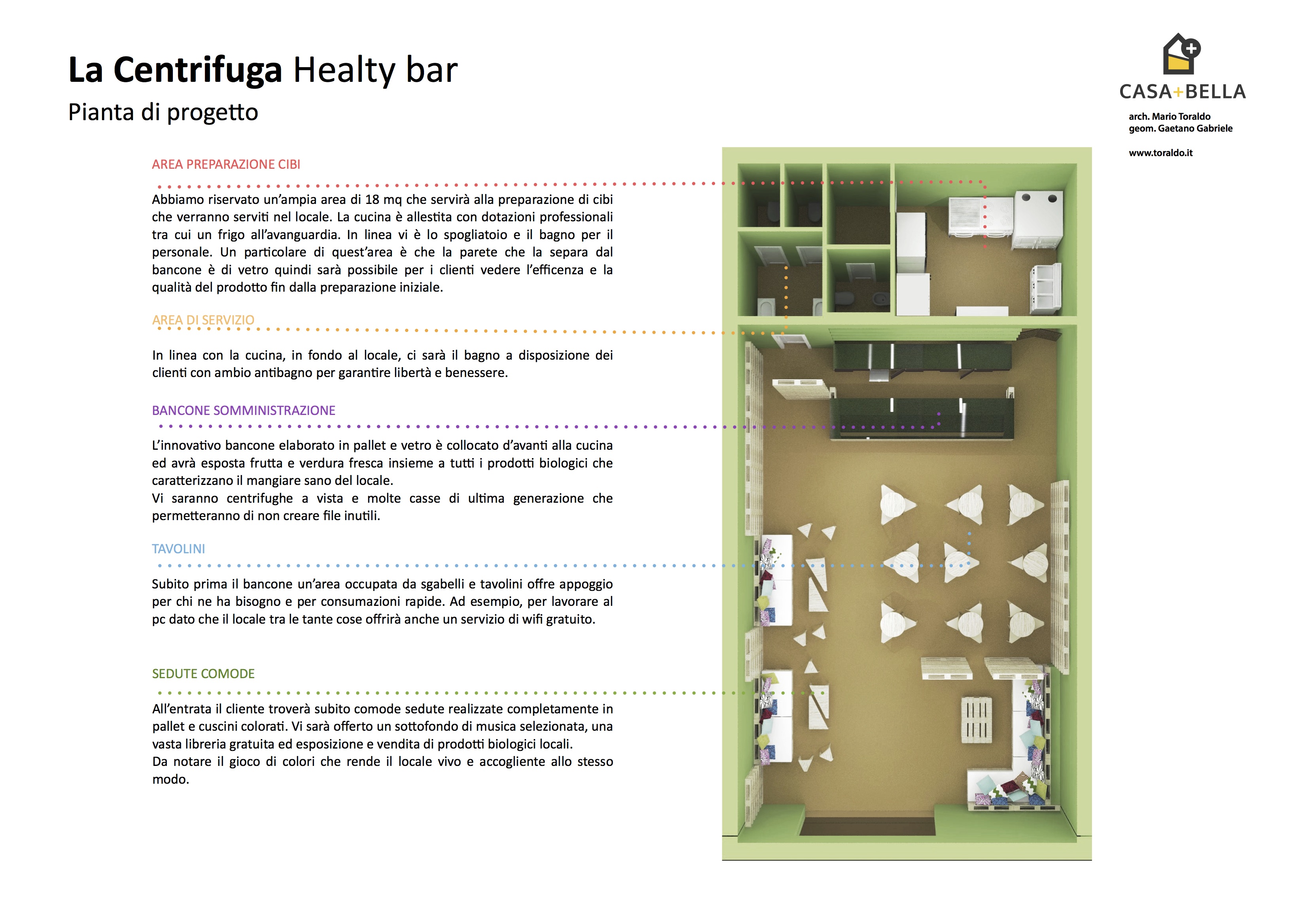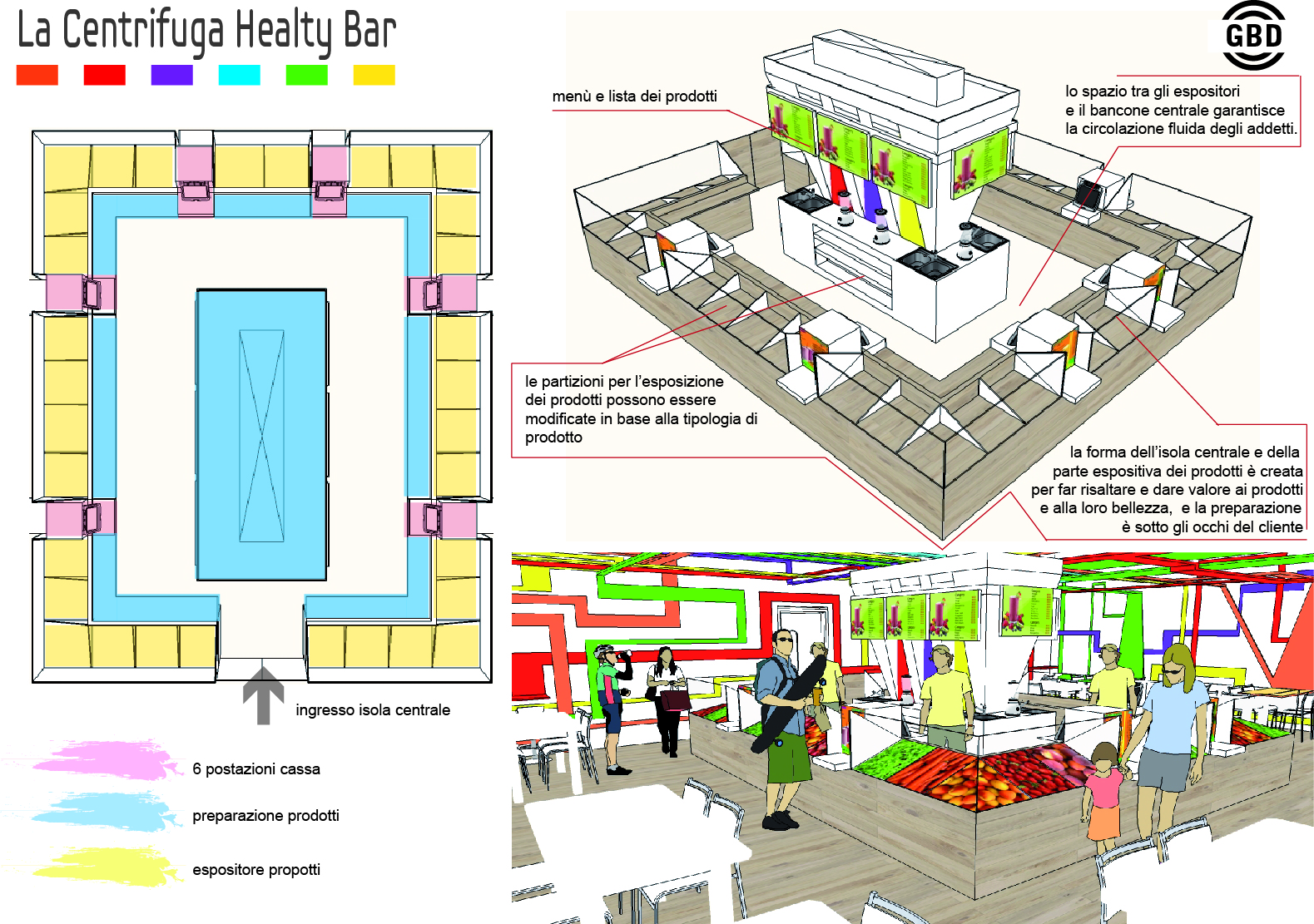 Vorrei ottenere un posto accogliente che comunichi benessere e salute. Il green. "La centrifuga" e' il prodotto centrale attorno al quale ruotano insalate, vitaminix, frutta slice, etc, barrette energetiche vegan, etc. Il posto e' sia seduti che take away. L obiettivo e' il Mc Donald della salute, quindi il suo contrario, ma mantenendo quella efficienza nell' offerta che lo caratterizza: con piu' casse sul bancone, zero fila. Rapidita' di preparazione con un concept quasi industriale. Tra i valori chiave la semplicita' in generale, la bellezza dei prodotti e del trattarsi bene mangiando bene, e del design. mi ispiro a http://www.jambajuice.com/    sia dal punto di vista dell organizzazione commerciale sia per l efficienza degli spazi etc