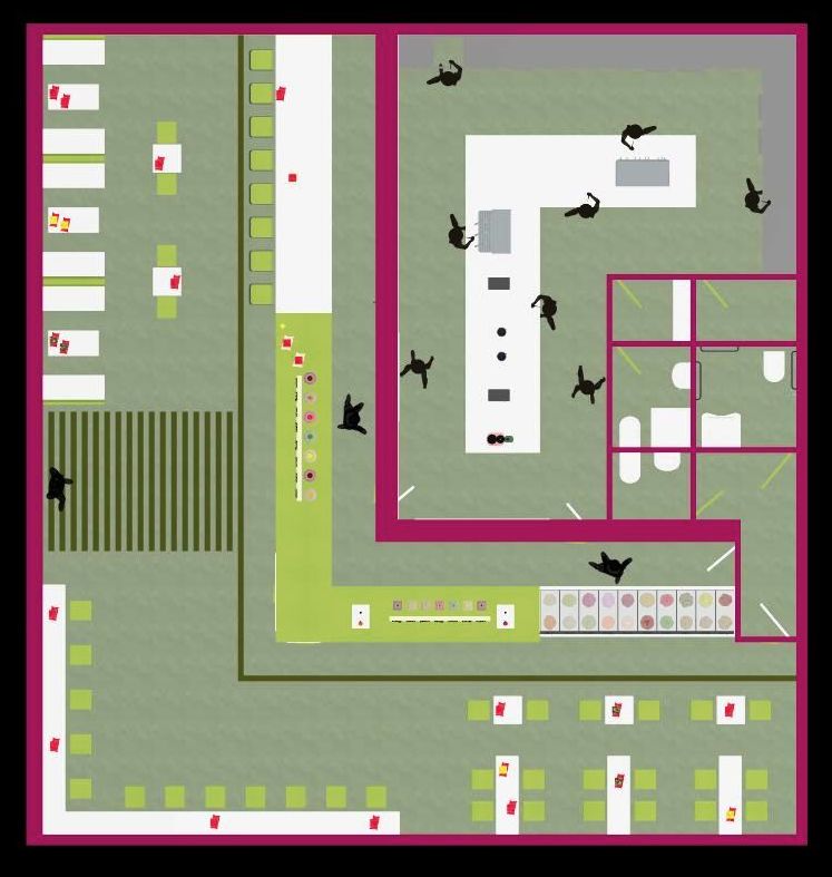 What I’m aiming for is a welcoming place, which transmits wellbeing and health. Green. Everything is centered on the mixer, salads, vitaminix, fruit slices, vegan energetic bars and so on. We’ll offer take away service too. The idea is becoming an healthy Mc Donald’s: efficiently served (multiple check-outs, no queue) healthy food. A sort of food “assembly line”. Key values: simplicity, product beauty, refined designs and staying  healthy eating healthy. I used  http://www.jambajuice.com as a reference, both for how the space has been efficiently  organized and  for the commercial approach.
