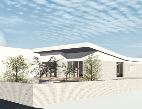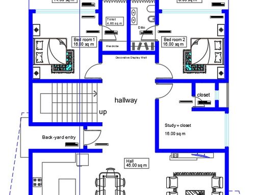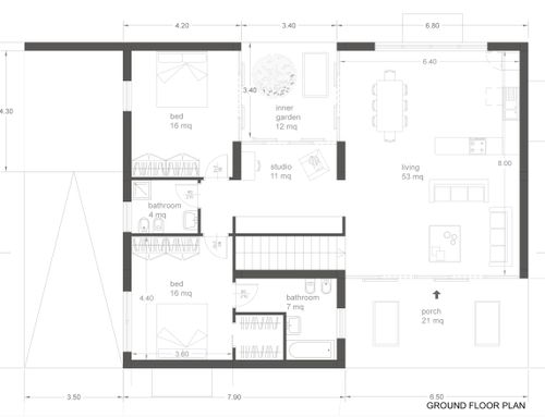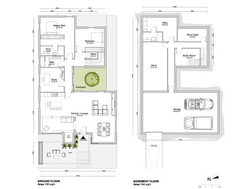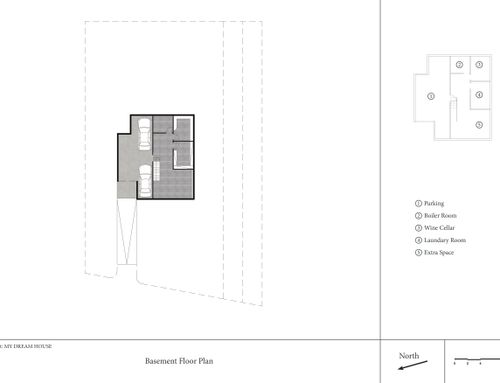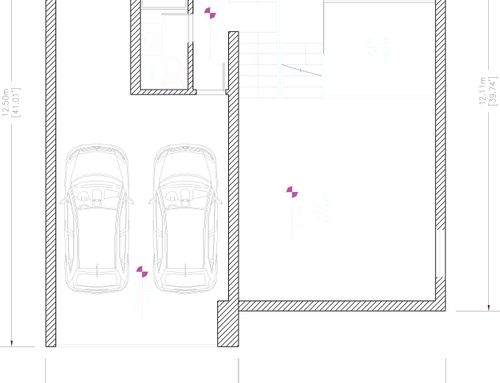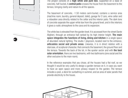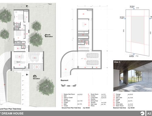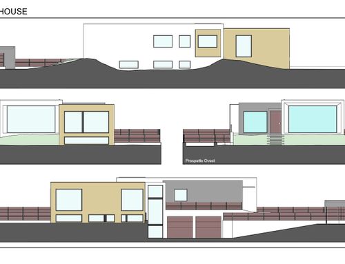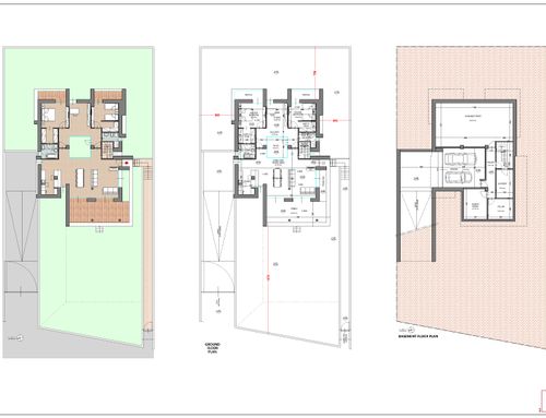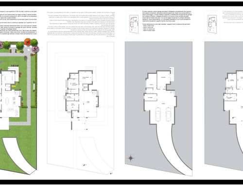 The surface of each floor must be around 150 square meters. On the ground floor there must be two bedrooms of at least 16 square meters each, two bathrooms, one study/break room, one closet, one open space living room and kitchen, and one porch of about 18 sqm built towards the entrance facing Dante Alighieri St. The main entrance and driveway must be facing Dante Alighieri St. In the basement I need one garage for two cars, laundry, wine cellar and boiler room.