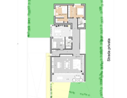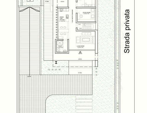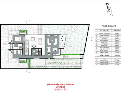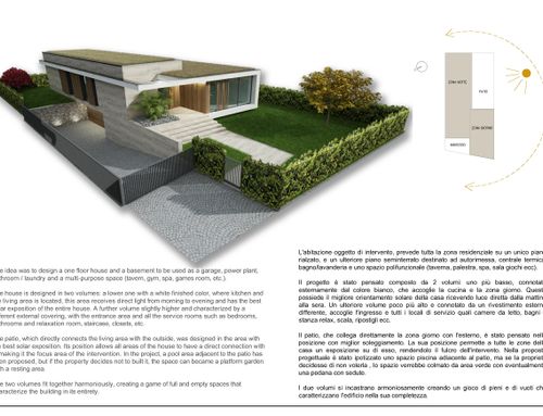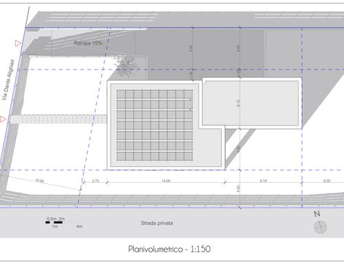 La superifice di ciascun piano deve essere circa 150 metri quadri. Al piano fuori terra devono essere realizzate due camere di almeno 16 metri quadrati ciascuna, due bagni, una stanza studio/relax, ripostiglio, soggiorno e cucina non separati da tramezze, un portico realizzato verso l'ingresso su via Dante Alighieri di circa 18 metri quadrati. L'ingresso pedonale e carraio devono essere rivolti verso via Dante Alighieri. Nel seminterrato devono invece essere realizzati, un garage per due posti auto, lavanderia, cantinetta e locale caldaia.