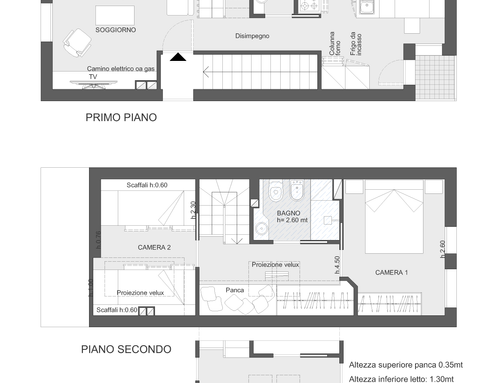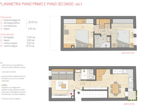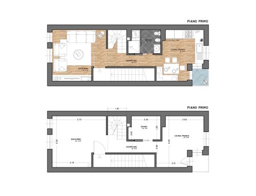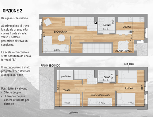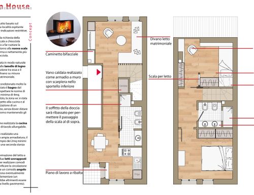 Vorrei uno stile un po’ rustico creando zona giorno al primo piano e notte al secondo. Sfrutterei il soffitto a falda del piano superiore e vorrei creare una casa che può contenere almeno 5/6 posti letto da poter anche affittare. C è una scala chiocciola che vorrei eliminare perché mi sembra un po’ scomoda .. la richiesta è quella di sfruttare al massimo gli spazi tutti da riorganizzare in quanto attualmente l’appartamento è quasi completamente sventrato. Bisogna prevedere un posto per la caldaia avendo riscaldamento autonomo. Sono indecisa sulla possibilità di avere un piccolo caminetto.
