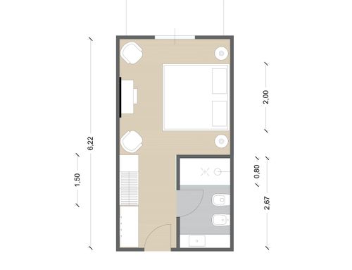 La habitación de un hotel de 4 estrellas tiene un área promedio de 16m² mientras que el baño relativo de 4m²