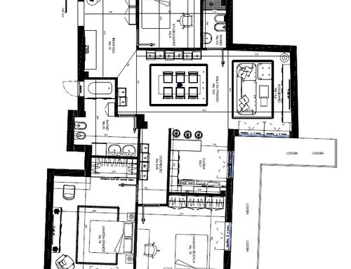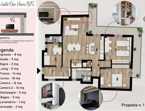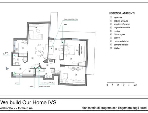 info:1)Tra il bagno, la sala da pranzo ed il disimpegno abbiamo un grosso pilastro che condiziona la divisione degli spazi. 2)Le finestre in corrispondenza della dispensa, dell'entrata e del bagno principale affacciano su una chiostrina. 3)dobbiamo cercare di ricavare due bagni ed una camera armadio.4) La cameretta dovrebbe avere una dimensione di 14 mq almeno. 5)Nella camera matrimoniale intendiamo montare un armadio ad L di dimensioni 2,6mx2,6m.