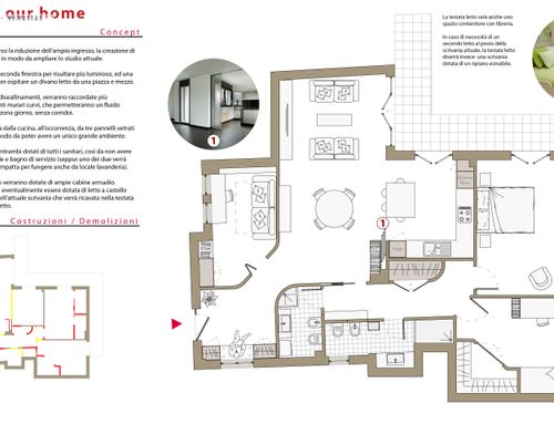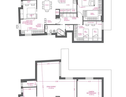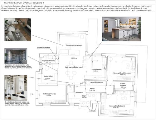 info:1)Between the bathroom, the dining room we have a large pillar that affects the division of spaces.2) The windows in correspondence of the Pantry, the entrance and the big bathroom overlook a small cloister.3) We need to obtain two bathrooms and a walk-in closet.4) The second bedroom should have a size of at least 14 square meters. 5)In the big bedroom we intend to install an L-shaped closet of size 2.6mx2.6m.6)The windows facing south and west overlook the cloister