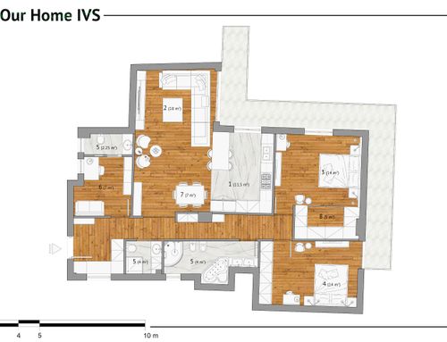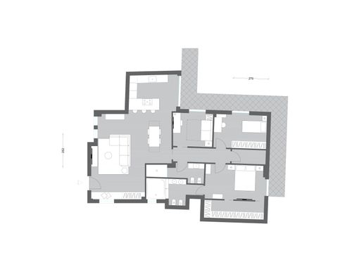 info: 1) Entre el baño, el comedor y el pasillo tenemos un gran pilar que condiciona la división de espacios. 2) Las ventanas en correspondencia con la despensa, la entrada y el baño principal dan a un pequeño claustro. 3) Debemos intentar conseguir dos baños y un vestuario 4) El dormitorio debe tener un tamaño mínimo de 14 metros cuadrados. 5) En el dormitorio principal pretendemos montar un armario en forma de L de 2,6mx2,6m.