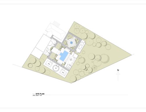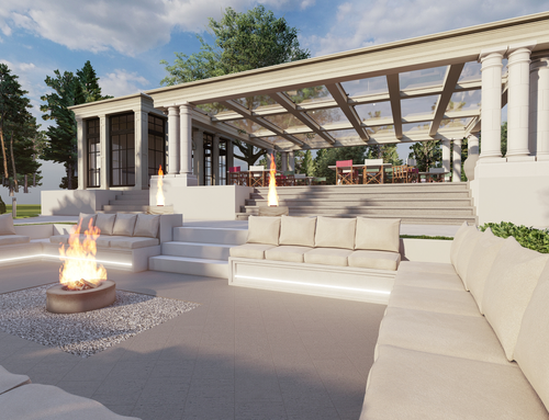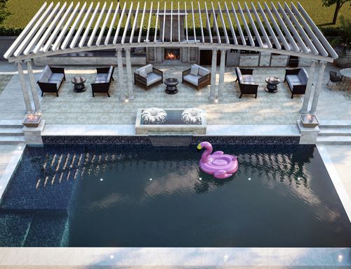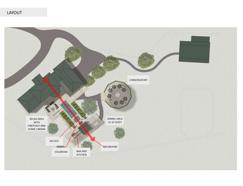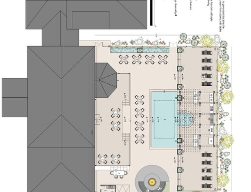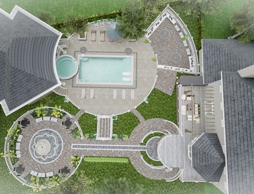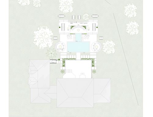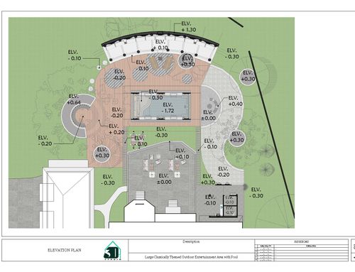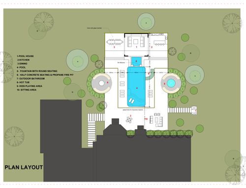 Zona de ocio al aire libre en la parte trasera de una casa clásica. Dirección para buscar en Google Earth para la medición: 5705 Hillbrook Dr, Crestwood, KY 40014, EE. UU. Queremos hacer un diseño que mantenga esa temática. Nos gustarÃa tener capacidad para 50 personas cómodamente. La siguiente vista general parte de la casa y se aleja de ella en el patio trasero. A la izquierda, una fuente con asientos y plantas. A la derecha, una zona de hoguera con asientos alrededor. A continuación, una piscina de 16 pies de ancho y 35 pies de largo, rectangular. Luego, subiendo unos escalones desde el nivel de la piscina, imaginamos una casa de piscina en forma de media luna con columnas corintias, cubierta de sombra y una bañera de hidromasaje que desemboca en la piscina. ¡Todo esto se puede cambiar si se tiene una gran idea! Realmente estamos buscando la mejor manera de hacer esto y continuar con el tema de la casa. Habrá fotos representativas y dimensionales adjuntas. Las siguientes son algunas ideas sobre las áreas principales: