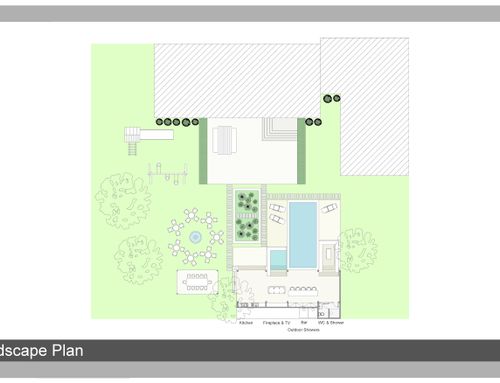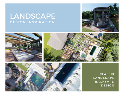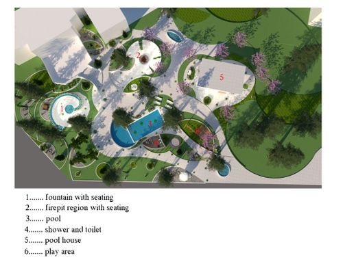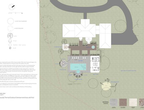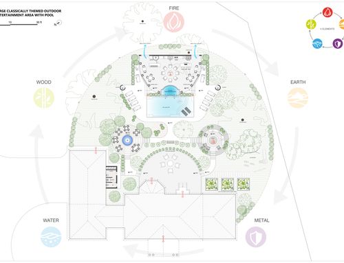 Outdoor entertainment area on the back of a classical home. Address to look up on Google Earth for measurement: 5705 Hillbrook Dr, Crestwood, KY 40014, USA. We want to do a design that keeps with that theme. We would like to have seating for 50 people to be accommodated comfortably. The following overview starts out from the house and moves away from it in the backyard. On the left, we envision a fountain with seating and plants. On the right, we imagine a firepit region with seating around it. Then, a pool that is 16 ft wide and 35 feet long, rectangular. Then up a few steps from the pool level, we imagine a half moon pool house with Corinthian columns, shade covering, and a hot tub pouring into the pool. All of this is changeable if you have a great idea! We are really looking for the best way to do this and keep with the theme in the house. There will be representative and dimensional pictures attached. The following are some thoughts about the major areas:
