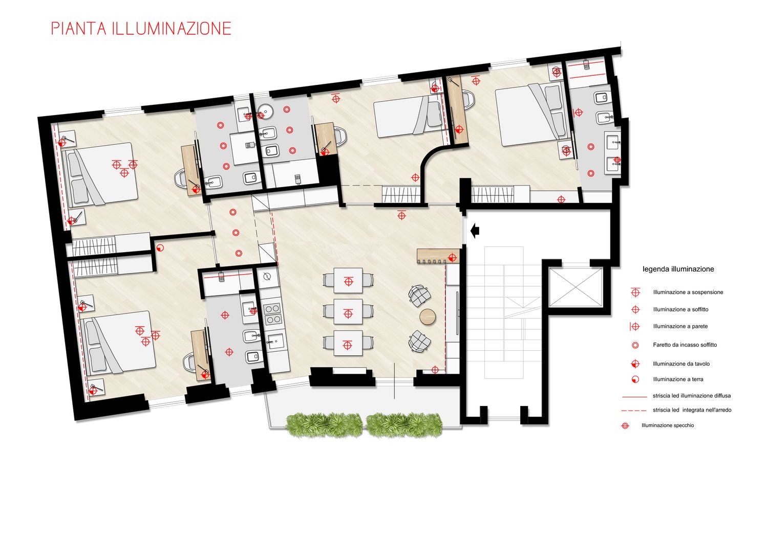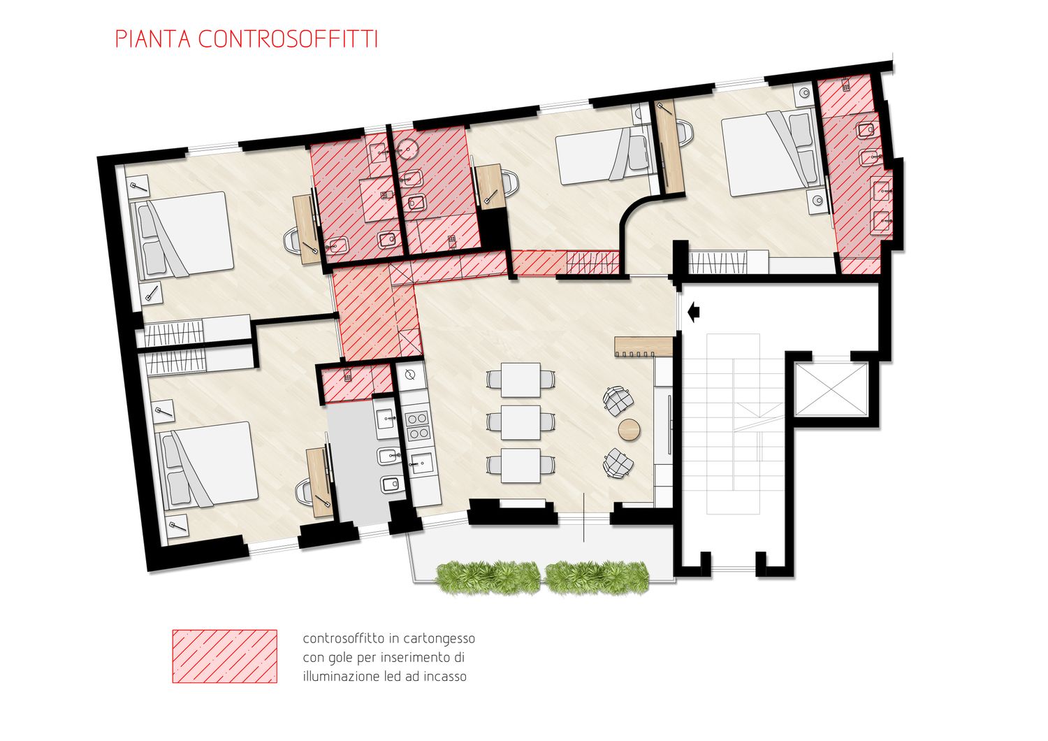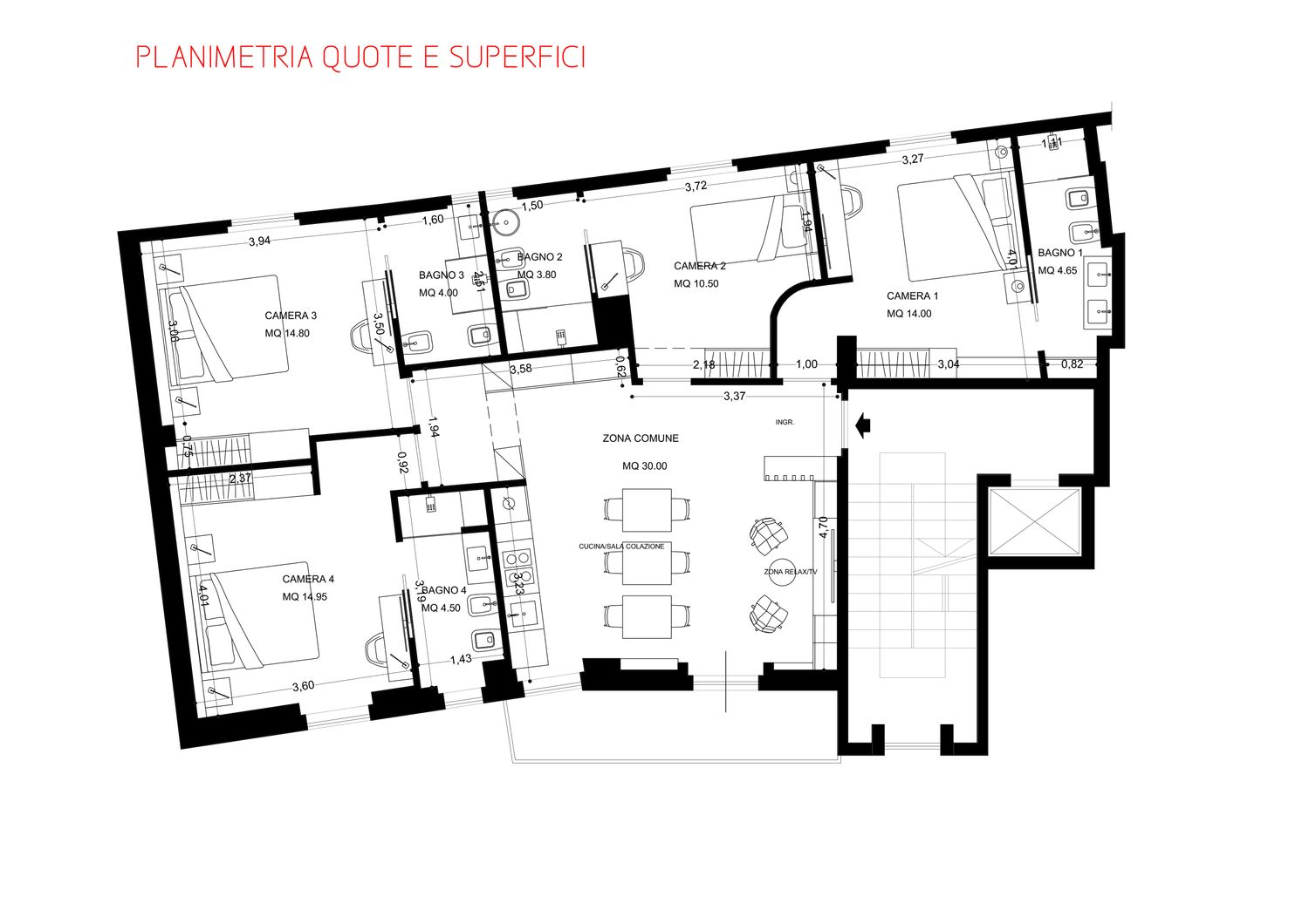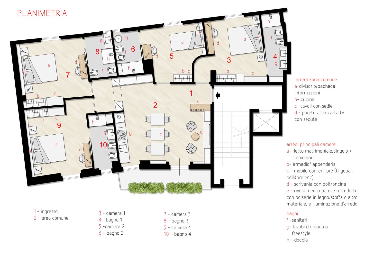 La soluzione offre quattro camere al cui interno trovare tutto quanto necessario; ogni camera ha il proprio bagno e come visibile dalla planimetria sono stati rivisitate per offrire un maggiore confort. Nella sala principale trovano spazio oltre alla cucina i tavoli per la colazione che posso essere anche uniti in base alle esigenze e una zona relax con tv e poltroncine. Gli arredi sono semplici e lineari con toni neutri abbinati a dettagli dai colori più forti per valorizzare l’intero ambiente. E’ stato ricavato poi lo spazio per comodi armadi porta biancheria ed eventuale lavanderia e infine uno spazio dedicato al deposito bagagli sempre utile e ricercato in soluzioni di questo genere.