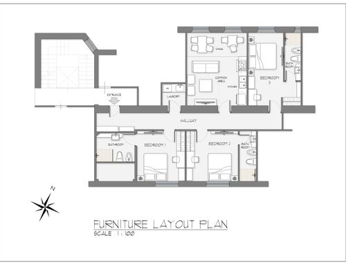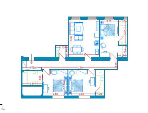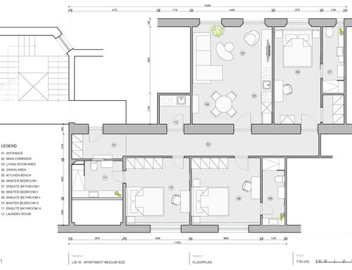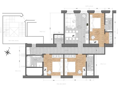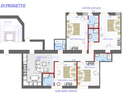 ENGLISH: Aim of the project is to make an basement flat very attractive for either students or Airbnb, brightening up the mood of the side which is at basement level (the flat has 2 rooms at floor basement level. On the other side of the corridor, other 2 rooms at floor +1). The flat is located at the border of the city pedestrian historical centre and is part of a 1940 rationalist building. The restoration must be cheap due to the investment nature of the real estate. The goal is to have 3 guest rooms with a double bed and an own bathroom each, plus a shared living area. The style is preferably modern and contemporary, but I am open. I like the idea of a color code for each room, but this is not a constrain. The key requirement is to do something with a robust style: robust over time and in respect to different people living in it. Also materials/forniture has to be robust, given the nature of the occupants. I therefore imagine to play more with colours, lighting, decorations and materials rather than with complex works. Regarding foniture, if not lighting, should be very cheap, possibly from convenient stores like IKEA, Aliexpress etc: maybe design itself accomodating standard products/sizes like IKEA etc. Ceilings are very high but in the basement rooms windows do not allow countertops. I would expect good focus on lighting to create a good atmosphere, but using standard and cheap spotlights, light strips like at Leroy Merlin etc. The budget, excluding forniture, for works is expected to remain within 30/40k€. Main works are new floor, new bathrooms. I have also attached an idea of space remodelling (very simple), quotes, idea of forniture location etc but please consider this as a potential suggestion, not a constrain. The only real constrains are the pipes of the WC and the cost of the works. The names of the uploaded images have cross-references to the flat map. DWG uploaded.