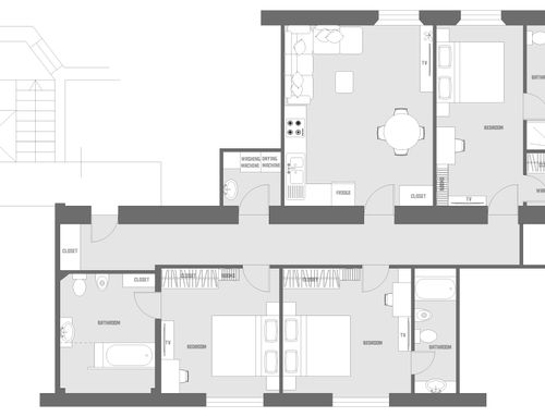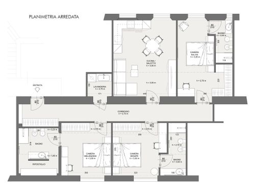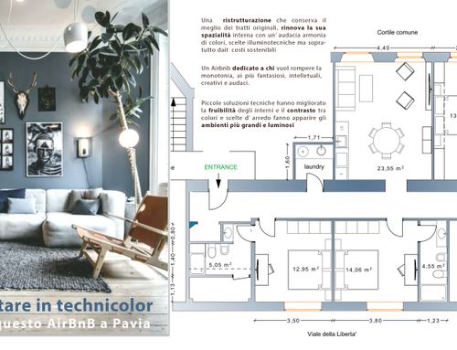 ITALIANO (English below): lo scopo del progetto e' di rendere attraente un appartamento di Pavia che per un lato e' seminterrato, per locazione a studenti o AirBnB. L'appartamento si sviluppa su di un corridoio, da un lato 2 stanze al piano seminterrato, dall'altro 2 stanze al piano +1. L'appartamento e' ubicato al bordo del centro storico di Pavia, in un condominio degli anni '40 di stile razionalista. La ristrutturazione dovrà essere economica per via della natura di investimento dell'immobile. Lo scopo e' di avere 3 stanze per ospiti, ciascuna con un bagno in camera e un letto matrimoniale, oltre ad un salotto/cucina comune. Lo stile e' preferibilmente moderno e contemporaneo, ma sono aperto a suggerimenti. Mi piace l'idea di un "color code" per ognuna delle tre stanze, ma non e' un vincolo. Il requisito chiave e' di avere uno stile "robusto", in termini di durata nel tempo e di gradimento alle diverse persone che potrebbero abitarci. Anche i materiali e i mobili devono essere robusti, data la frequentazione di esterni. Immagino quindi di giocare soprattutto con colori, luci, decorazioni e materiali piu' che con lavori complessi. Per quanto riguarda i mobili e anche il lighting, dovrebbe essere economico possibilmente anche da catene comode come IKEA, Aliexpress etc. Addirittura le misure di alcuni spazi (guardaroba etc) potrebbero essere in funzione dei mobili commerciali. L'altezza del soffitto e' notevole (3,5 m), prevedo un controsoffitto sicuramente nel corridoio. Nelle stanze al lato seminterrato non e' possibile un controsoffitto per via delle finestre a bordo soffitto. Gli infissi sono gia' doppivetri cambiati di recente. Mi aspetto molta attenzione alle luci per creare una buona atmosfera, utilizzando prodotti il piu' possibili commerciali e semplici (faretti, strisce di luce tipo Leroy Merlin etc). Il budget complessivo, esclusi i mobili, dovrebbe rimanere sotto i 30/40 k€. I lavori principali sono la creazione dei 3 bagni, oltre agli impianti elettrici etc. Ho allegato una prima idea di ristrutturazione degli spazi e disposizione mobili, ma consideratela come un'idea non necessariamente vincolante. I soli veri vincoli sono gli scarichi dei WC (indicati nelle planimetrie) ed il costo dei lavori di ristrutturazione. I nomi delle foto/piantine allegate hanno riferimenti incrociati fra di loro. DWG allegato.