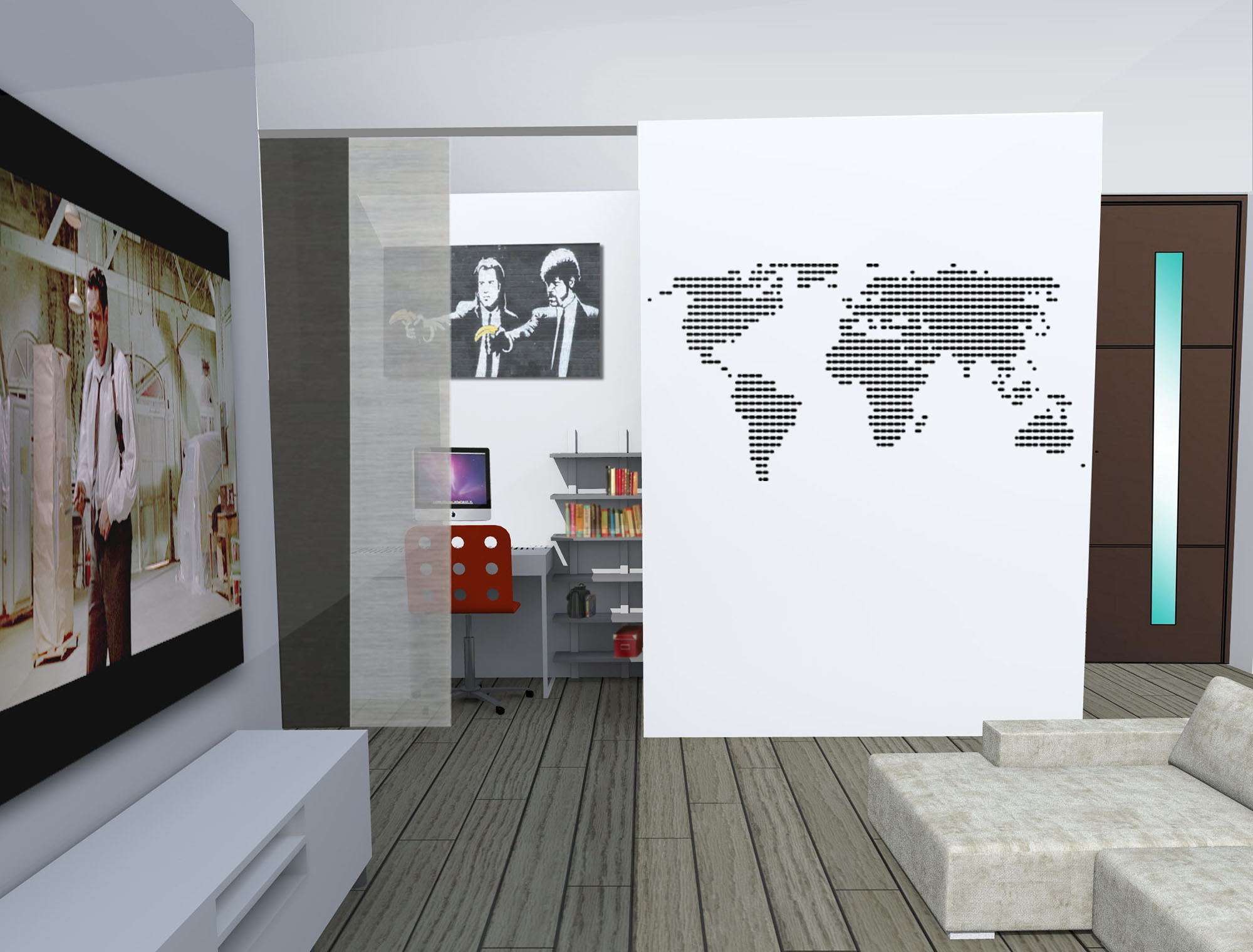 Hello to all, the aim of this contest is to redesign my living room. It’s a pretty big space around 60 sqm. I’m 30 years old and I live alone, what I’m looking for is a modern and cool living, to have dinner with friends watch movie with the projector and do parties. The living room takes the sun light all evening and I’m looking for new interesting ideas and solution be creative just keep in mind the budget. Objective: * Redesign living room in two main areas * dinner area with long (extendable) table and sideboard * relax area with couch and projector (no TV) What I love: * warm lights/space * modern furniture * minimal and cool space * wooden-like floor with BIG and LONG planks (from IKEA or Leroy Merlin) * no television (I'll use a projector, the reason of white walls) * white walls (mainly be) * no skirting What I like (NOT mandatory): * a bar angle next to the kitchen (on the low wall of the kitchen) * I've just bought the bookshelf of IKEA I'd like to keep (http://www.ikea.com/it/it/catalog/products/70201811/#/80071319), but it's not mandatory * I use to put my drying rank in the living room next to the window but honestly I’m looking for a new position because I don’t really like to have it there I would like to have a specific place more hidden. * monochromatic roll curtains for the big rounded windows Constraints/problems: * I haven't TV, I'll buy a projector that I want to project on the biggest wall (or maybe where the IKEA bookshelf is). * I've just bought a sofa that obviously I want to keep (http://www.chateau-dax.it/it/#/giorno/divani-in-tessuto-sfoderabile.html/milton.html), it is the same of the picture but lightgrey colored. * I need to install curtains to the big rounded windows but it’s very hard to find the right solution to use standard dimensions curtains. The IKEA roll curtains are not of the correct size. * My budget is NOT SO HIGT so I would like to find cool IKEA furniture. I hope I was clear. I did not put references to not influence your creativity. :)