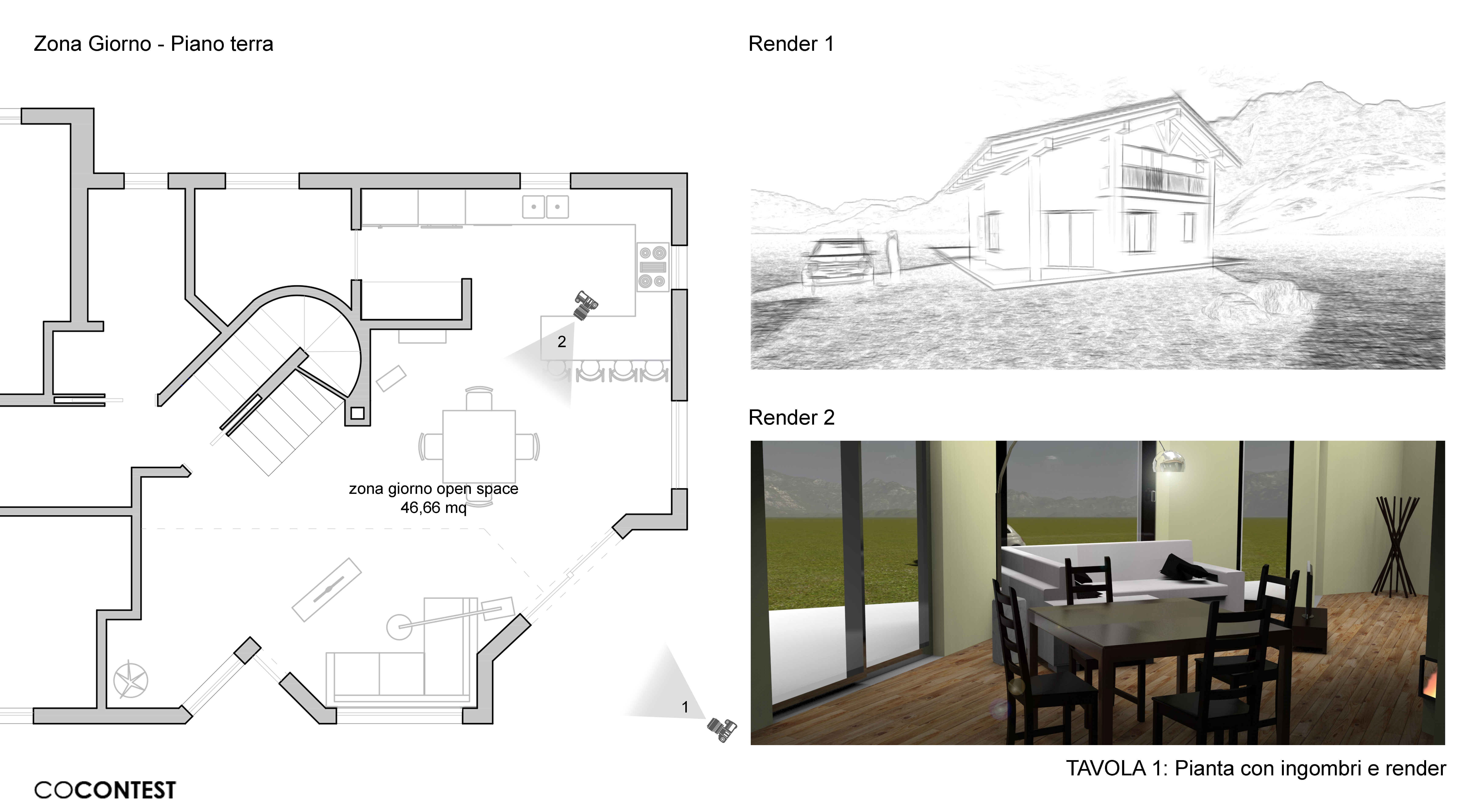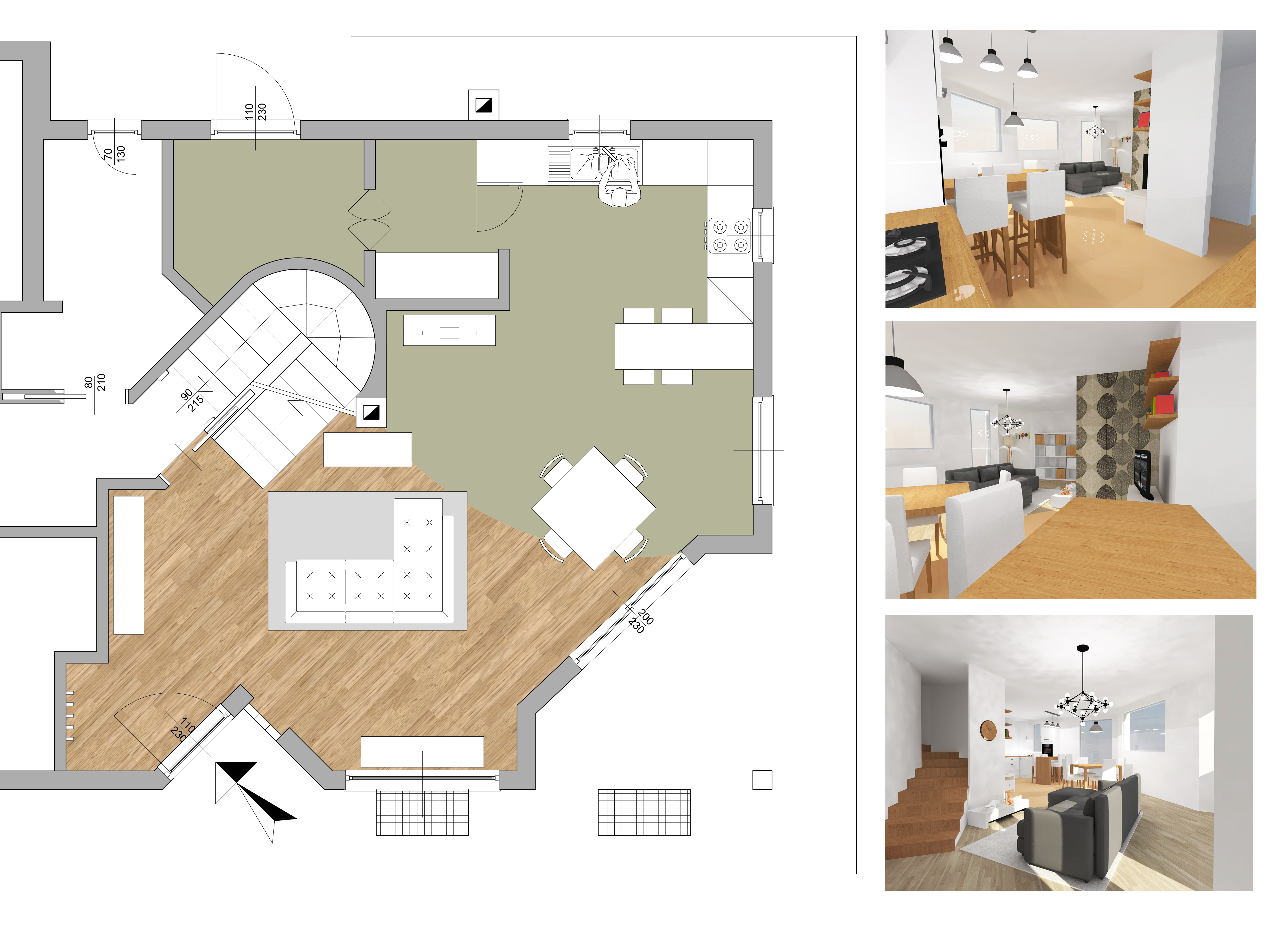 La zona giorno della nostra casa è formata dall'ingresso, le scale a vista che salgono al soppalco, il soggiorno e la cucina. L'arredamento attuale è quello recuperato dalla precedente abitazione e vorremmo cambiarlo a seguito di un progetto organico di allestimento dell'intera zona. L'esposizione a est e sud permette alla luce, tanta luce, di entrare fin dal primo mattino sul lato cucina per spostarsi sul lato soggiorno che rimane illuminato fino al tardo pomeriggio attraverso due ampie finestre, una porta finestra ed un serramento fisso a tutta altezza a fianco della porta di ingresso. La cucina è illuminata da est e nord con due piccole finestre utili anche per il ricambio dell'aria durante la preparazione dei pasti. A fianco della cucina abbiamo attrezzato il corridoio che porta alla lavanderia con un banco da lavoro inox che vogliamo rimanga per ospitare gli elettrodomestici. Nella zona centrale del soggiorno è stata predisposta una canna fumaria per un caminetto o stufa, comunque con fuoco a vista ma senza funzione primaria di riscaldamento. Il riscaldamento è a pavimento e la casa è in classe A+. Il soffitto sopra la cucina è in travi di legno a vista sul quale c'è il soppalco che guarda il sottostante soggiorno attraverso una balconata. Sfruttando la luce che illumina abbondantemente il locale vorremmo colorare le pareti con tinte calde ed accoglienti, sostituire la cucina con una dal taglio moderno, integrando una penisola per i pasti di 4 persone, inserire un tavolo restaurato, quadrato in legno, da utilizzare con gli ospiti, inserire un punto fuoco caminetto/stufa di piccole dimensioni senza funzioni di riscaldamento, attrezzare un divano per 4 persone con angolo tv.