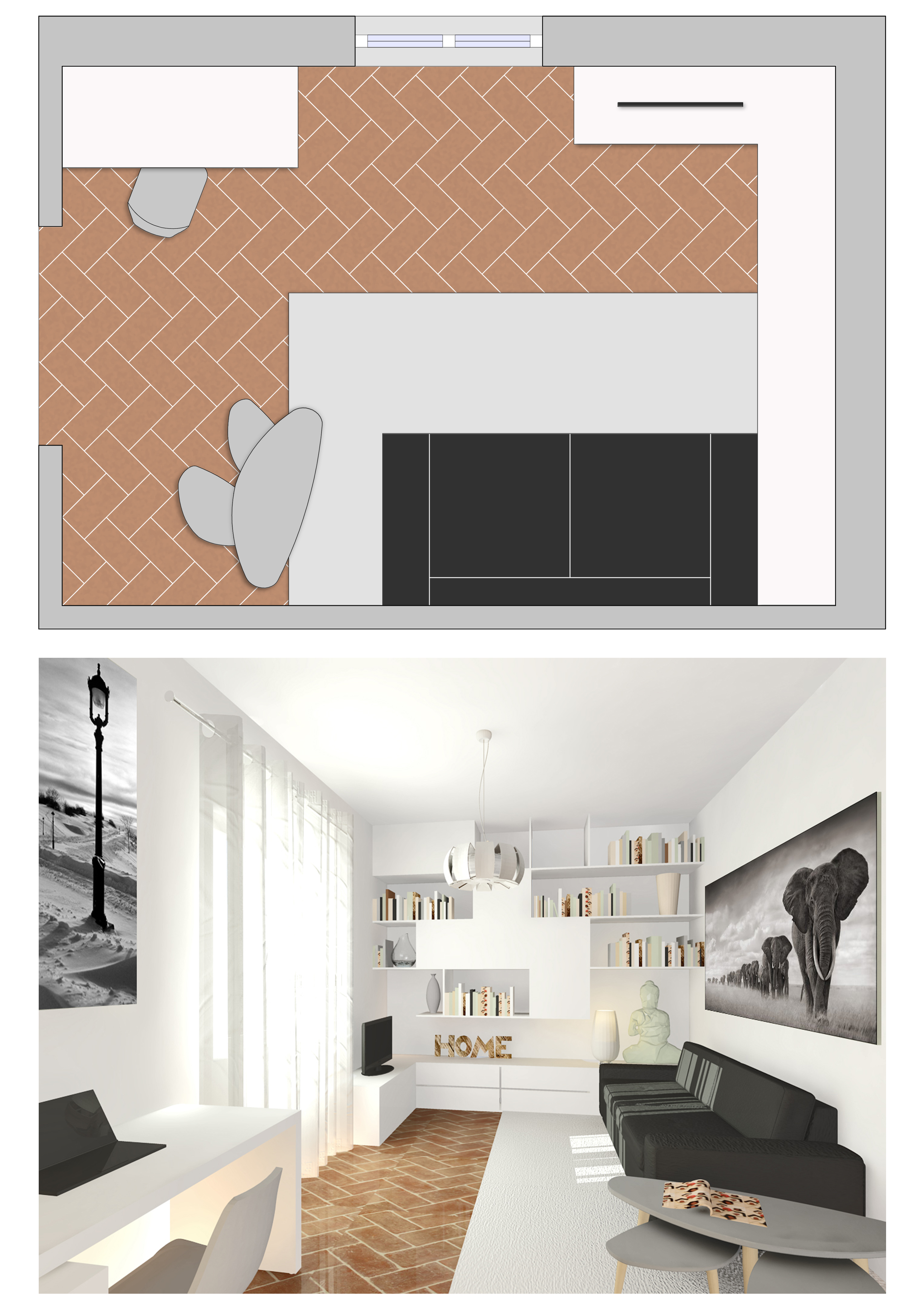 Soggiorno con libreria con spazi aperti per libri e chiusi con ante. Dovrebbe esserci una scrivania.