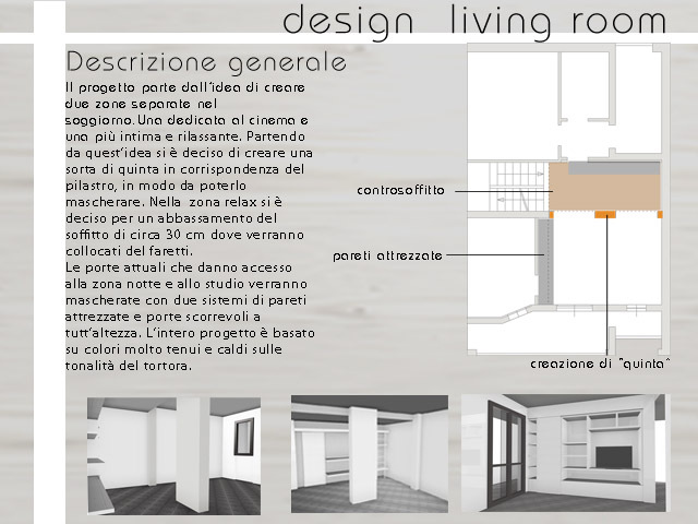 Ciao a tutti, siamo Vincenzo e Silvia e abbiamo bisogno del vostro aiuto per realizzare una sala che lasci tutti senza parole. La nostra è una villetta a schiera del 2005 e si sviluppa su tre piani di complessivi 300 metri quadri. La sala è orientata a sud-ovest dove è presente una grande porta finestra che da sul balcone e che si affaccia sul giardino. Adiacente, c'è una stanza (nella cartina indicata come cucina) dove realizzeremo un piccolo studio. Il risultato che vorremmo è una zona relax funzionale, accogliente e moderna dove poter guardare la tv insieme agli amici o leggere un bel libro. Non ci occorre un tavolo da pranzo, in quanto al piano inferiore abbiamo una grande cucina. E' importante che nel progetto si consideri tutto quanto necessario per un grande televisore, con consolle giochi e un sistema home theater composto da amplificatore e più diffusori. La cosa che più penalizza la nostra sala è la colonna. Vorremmo quindi dei progetti che ci aiutassero a scegliere e capire come meglio sistemare gli arredi (mobile tv, divano, libreria, lampadario ecc.), ma sopratutto valorizzare/mimetizzare la colonna. Ci piacerebbe anche valutare delle soluzioni con il cartongesso o con particolari luci, colori e effetti alle pareti. Lo stile che preferiamo è quello moderno non troppo minimalista che giochi sul contrasto colori chiari e scuri. Nelle vostre proposte ci piacerebbe ritrovare alcune chicche di design che rendano la nostra sala unica. Al momento non pensiamo di effettuare alcuna modifica strutturale a muri, pavimenti e infissi. Se fosse però necessario al progetto, potremmo valutare dei piccoli lavori come ad esempio il cartongesso. Come vedrete dalle foto il pavimento è un gres porcellanato sul rosa che poco si sposa con la nostra idea di moderno. Un'altro ricordo dei precedenti proprietari è la porta che separa la sala dalla zona notte. Ci piacerebbe cambiare il vetro con un qualcosa di abbinato al progetto. Il nostro budget è di 10.000 euro (che non comprendono tutta la parte tv e home theater). Per capire meglio le vostre proposte ci aiuterebbe tanto avere dei render 3D. Contattateci per qualsiasi info!!! Grazie per tutti i contributi che ci saprete dare!!! Silvia e Vincenzo