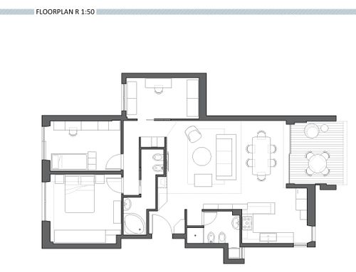 2. Living room - We'd like to have two "virtually separated" areas, one with sofa, TV etc. and one with the dinner table. For this reason, we were thinking to change the current position: one option could be to move the TV to the opposite big wall (by turning the sofa), where we would like to have a bookcase, a piece of furniture and a bio fireplace...but is just our idea, please feel free to suggest a different point of view! Then the right table, chairs, etc. Ah, if it can help the white "cube" you can see in the picture has the ceiling in Plexiglas; you can see it from the bathroom.