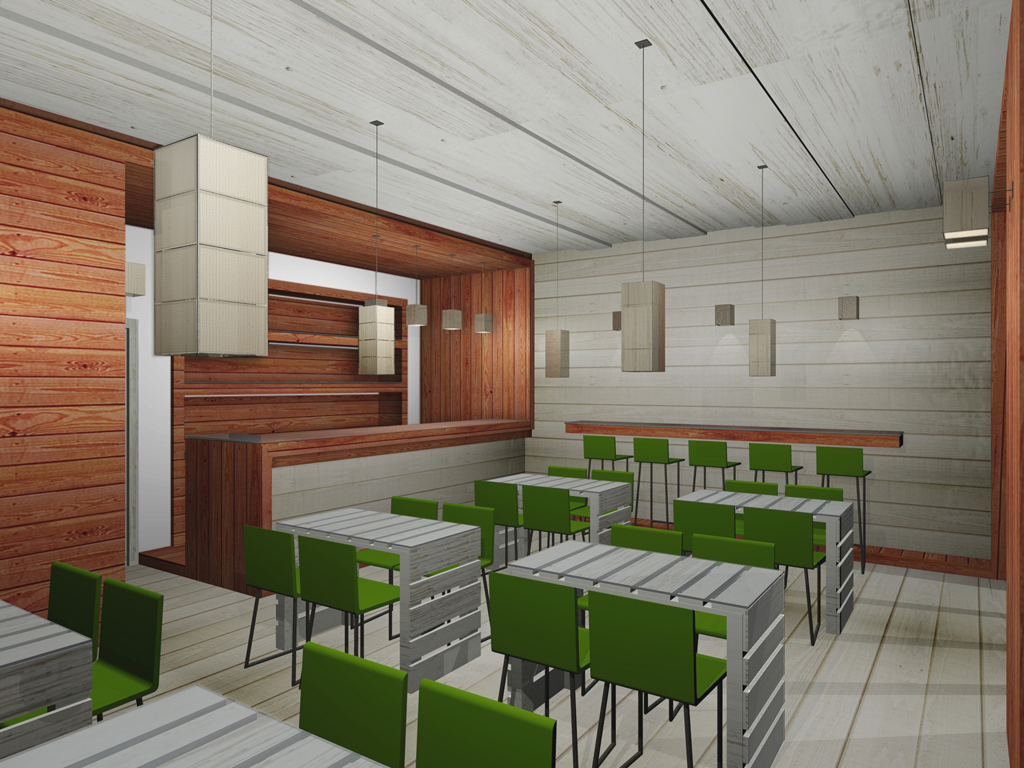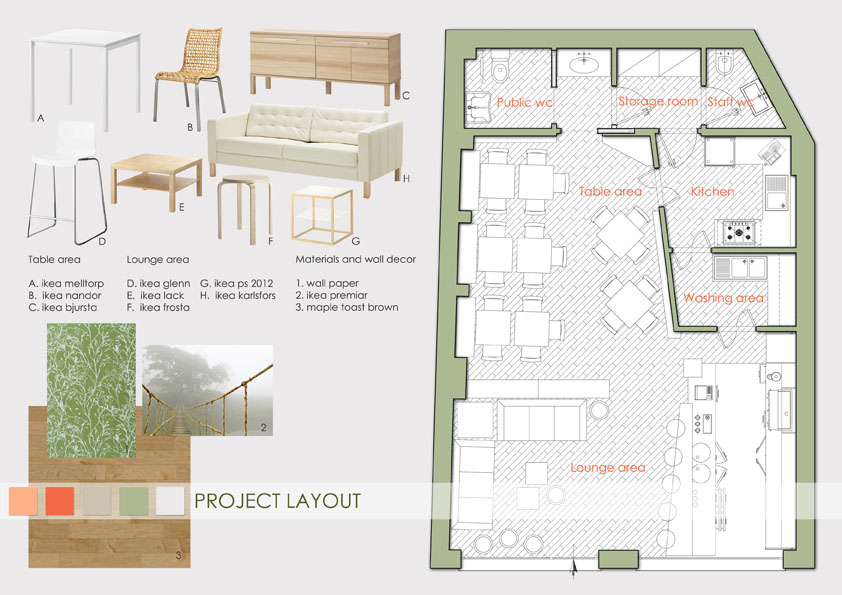 We like wood and green we would like something like ecofriendly. It needs a handicap-wc for law. The kitchen needs to have a wash area separate by the other part and a storage room where we have to put also the changing area.