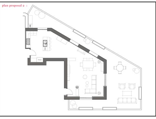 We know it s not a 200 sqm open space, so we understand if we have to Leave things aside. But we trust in your more open view/suggestions and “tricks” to Make This strange geometry a super open space.