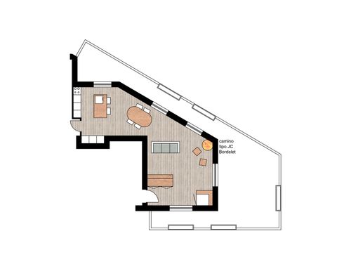Nos gustaría tener una cocina con isla, espaciosa, para disfrutar y con una posible área de refrigerios, lo importante para nosotros también es la disposición de la mesa de manera funcional, queremos solo una mesa mediana-grande que siempre pueda usar. Finalmente nos gustaría recoger la sala de estar y hacerla más íntima. Todo debe organizarse para aprovechar al máximo la terraza del apartamento. Nos gusta el estilo moderno / esencial, escandinavo, limpio, con predominio del blanco / gris / madera / vidrio. Sería la mejor forma de tener una chimenea de doble cara, si es posible, ser admirado tanto desde el comedor como desde el sofá.