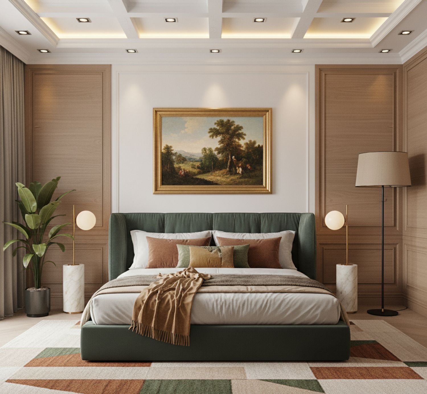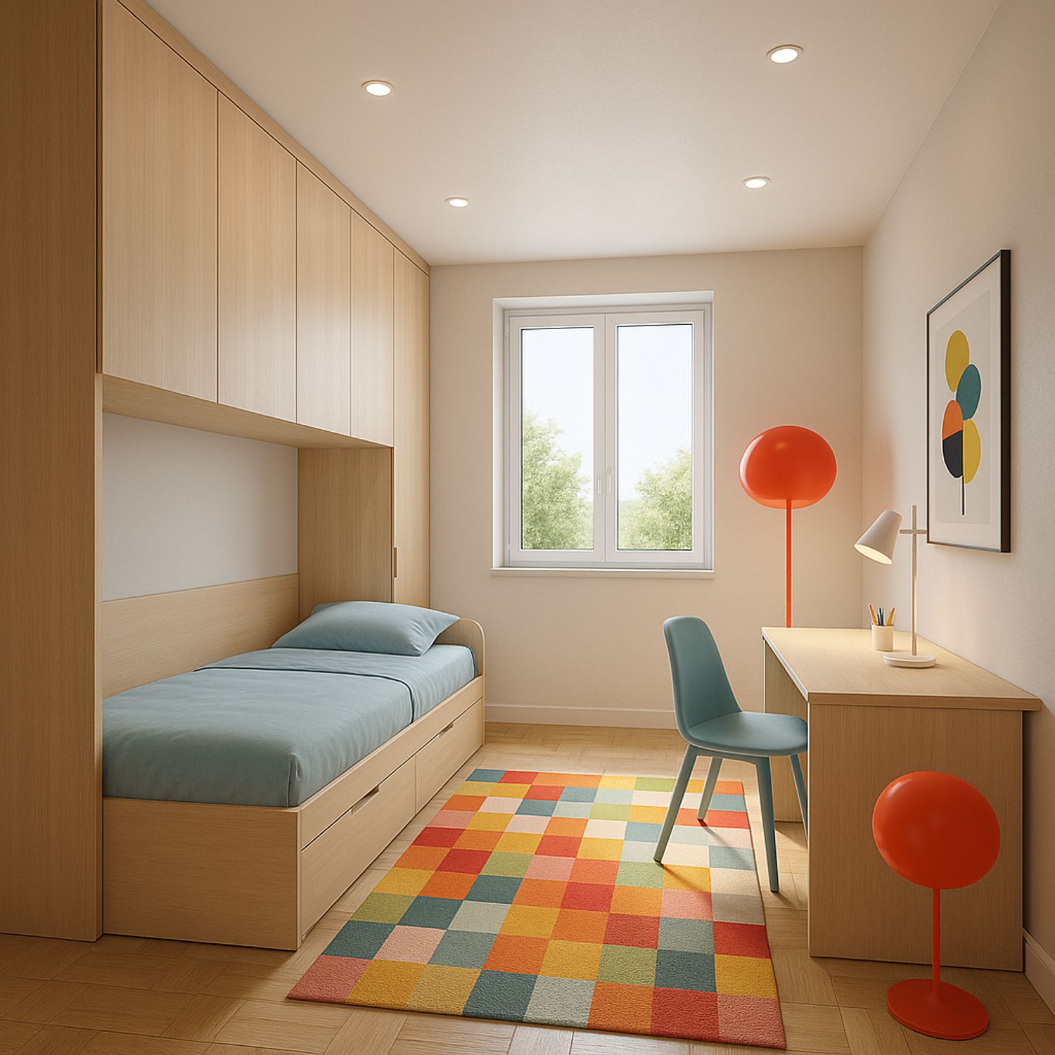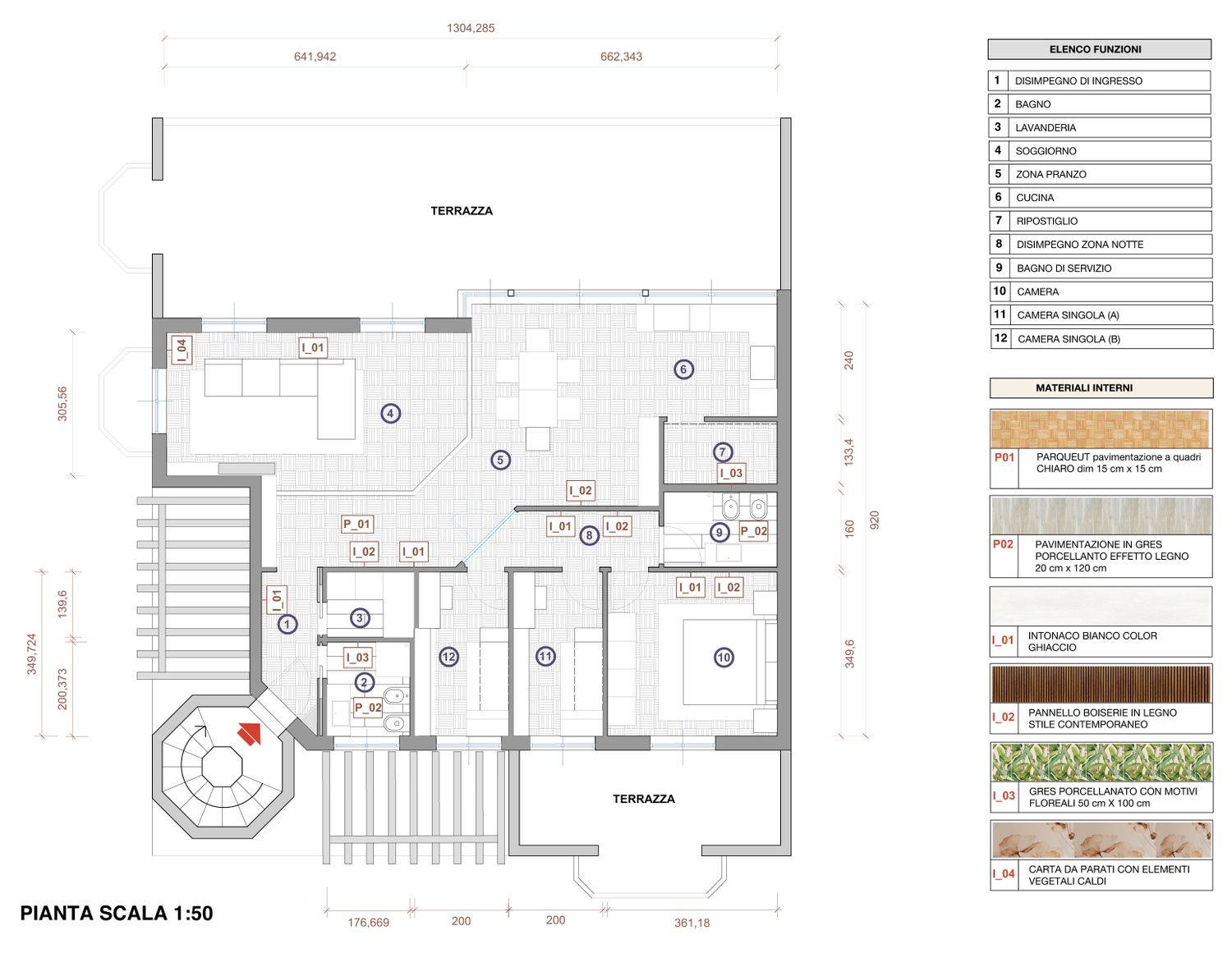 Il medesimo taglio diagonale ha permesso la creazione di un disimpegno funzionale che distribuisce la zona notte, composta da due camerette, una camera padronale e un bagno. La scelta dei materiali coniuga contemporaneità ed eleganza attraverso l'uso di linee semplici e colori caldi.