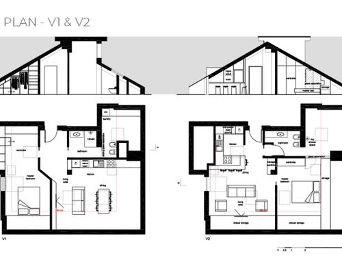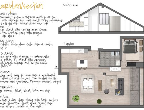 Dear designer, I'd like to transform this attic in a cozy living space with 2 people. We often have guests stay with us and we'd like few internal divisions.