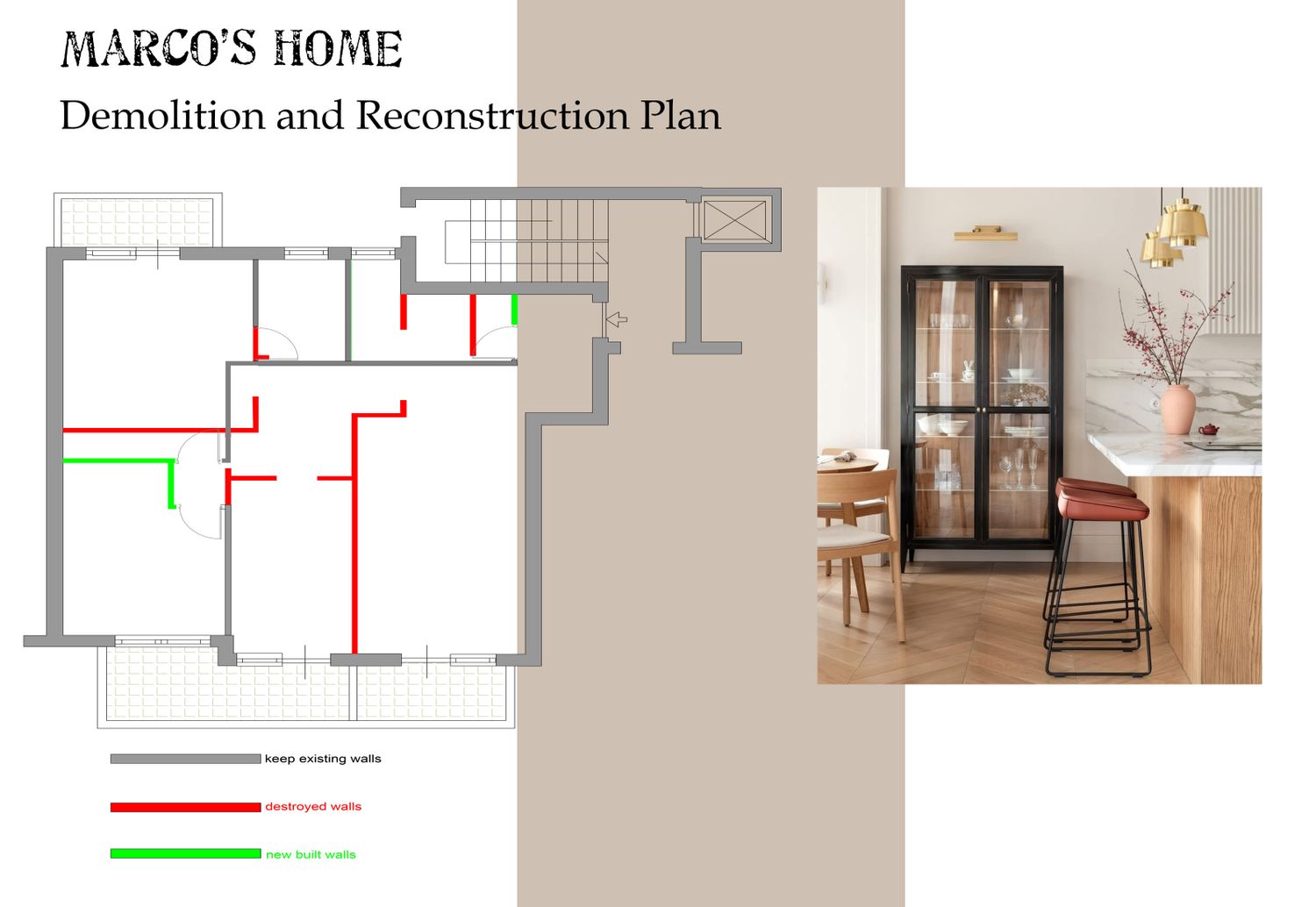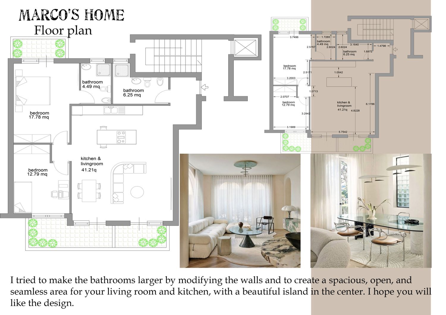 I tried to make the bathrooms larger by modifying the walls and to create a spacious, open, and seamless area for your living room and kitchen, with a beautiful island in the center. I hope you will like the design.