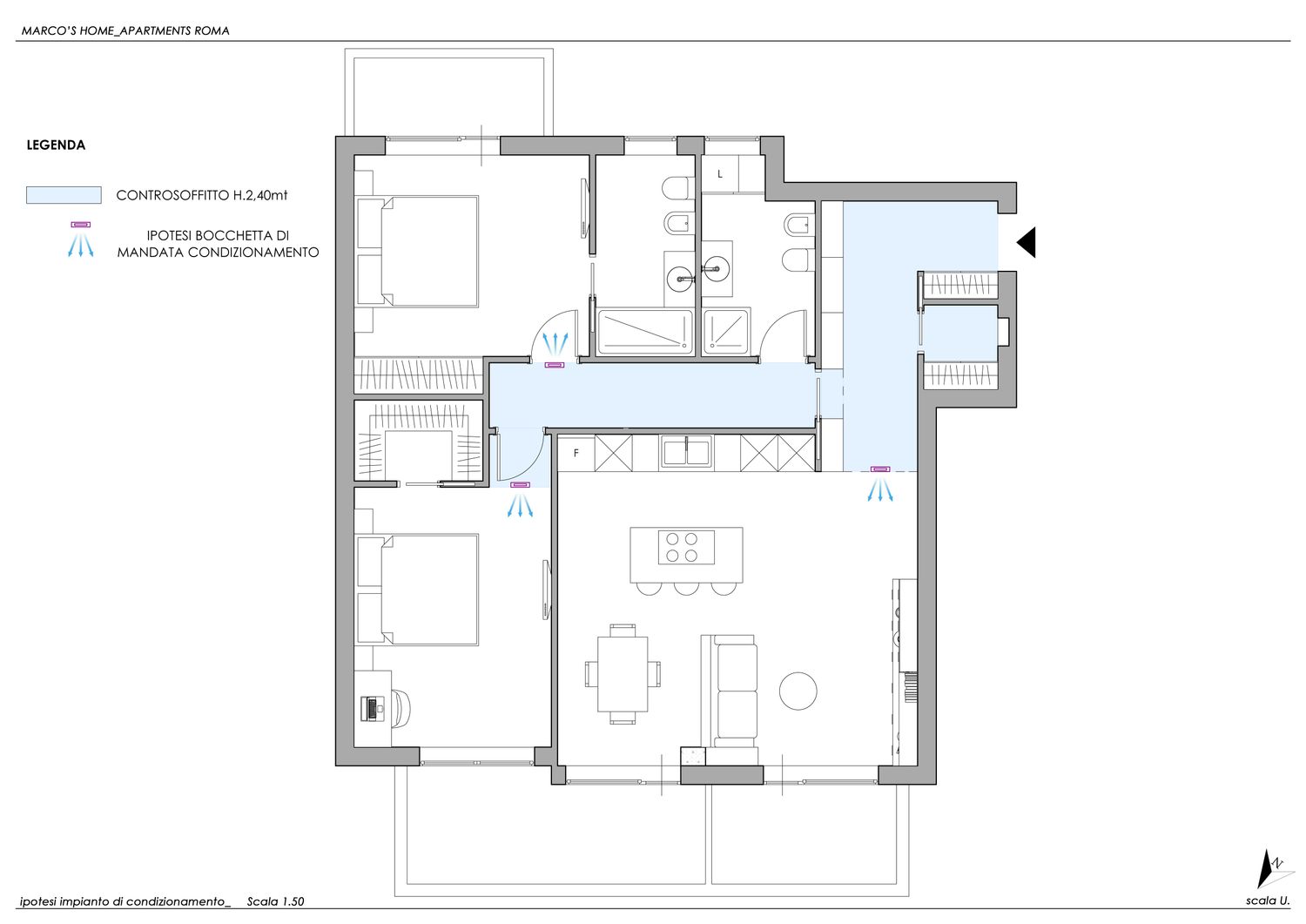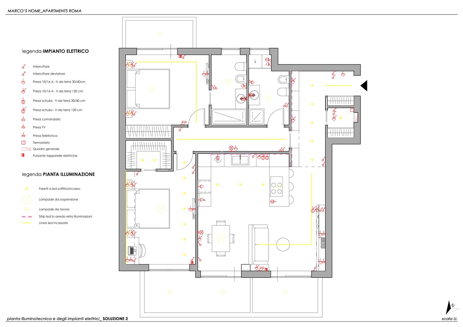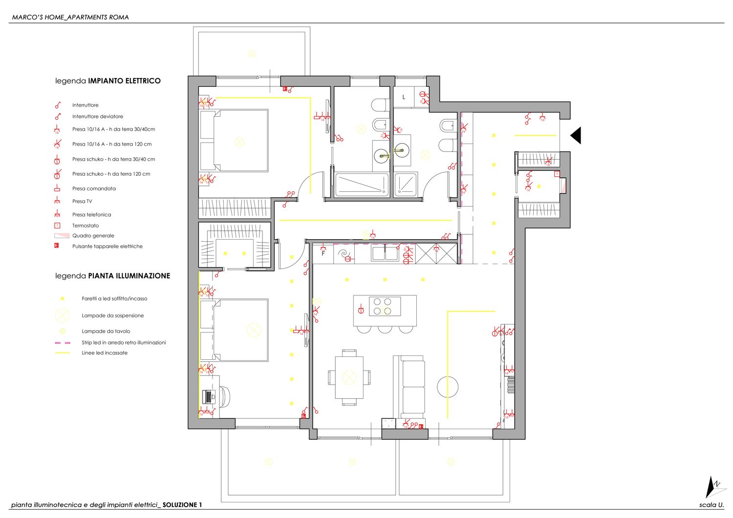 In fase di progettazione, sono stati dettagliati tutti gli aspetti tecnici, incluse le prese elettriche, le posizioni delle luci e gli splitter per i condizionatori.