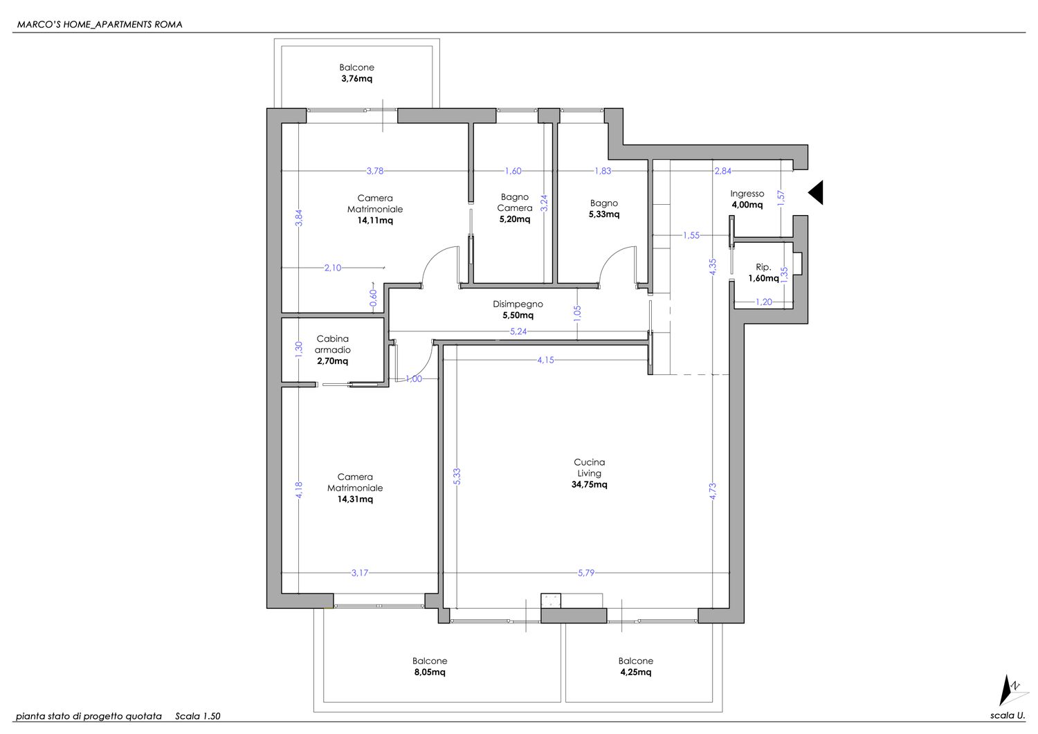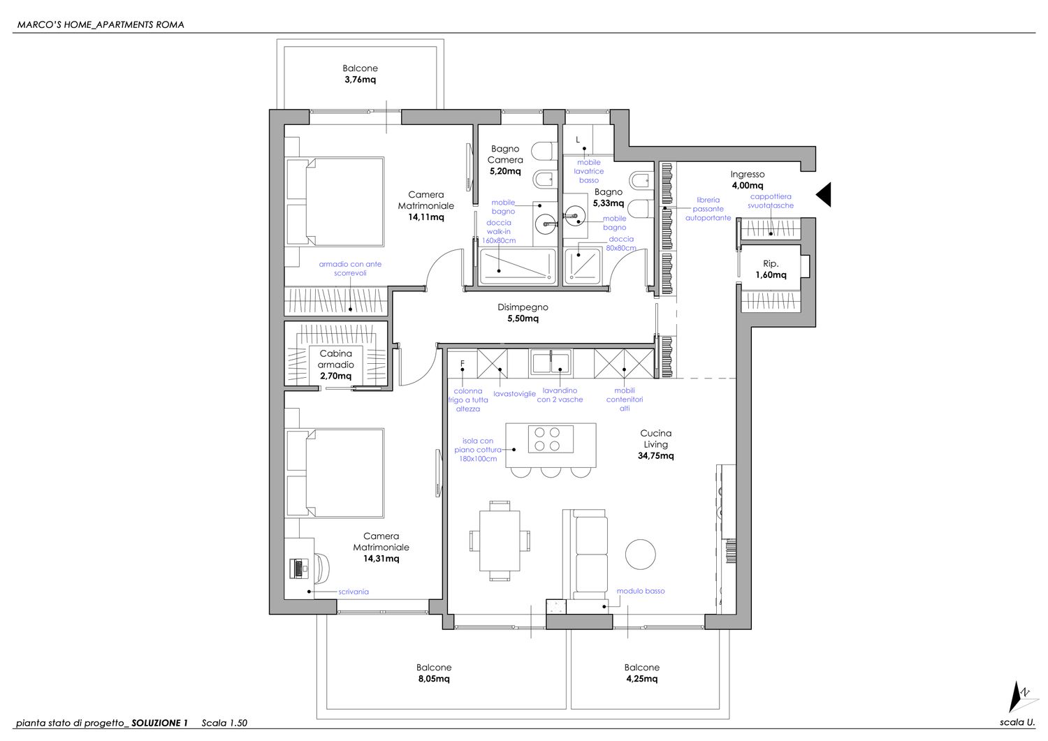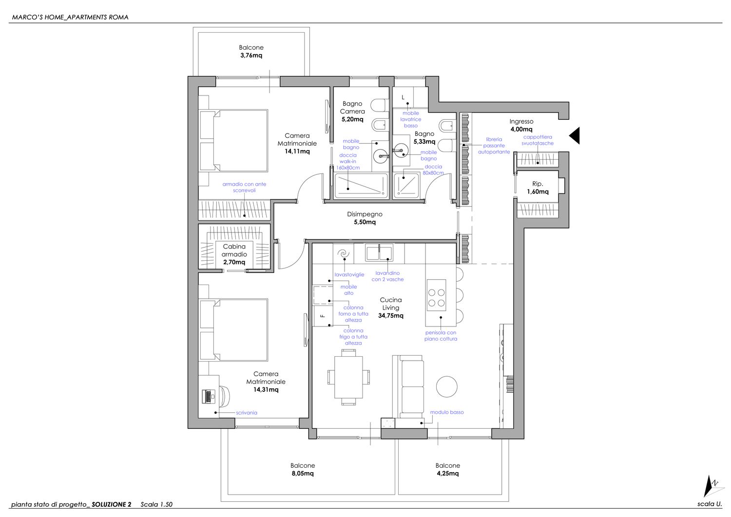 In fase di progettazione, sono stati dettagliati tutti gli aspetti tecnici, incluse le prese elettriche, le posizioni delle luci e gli splitter per i condizionatori.