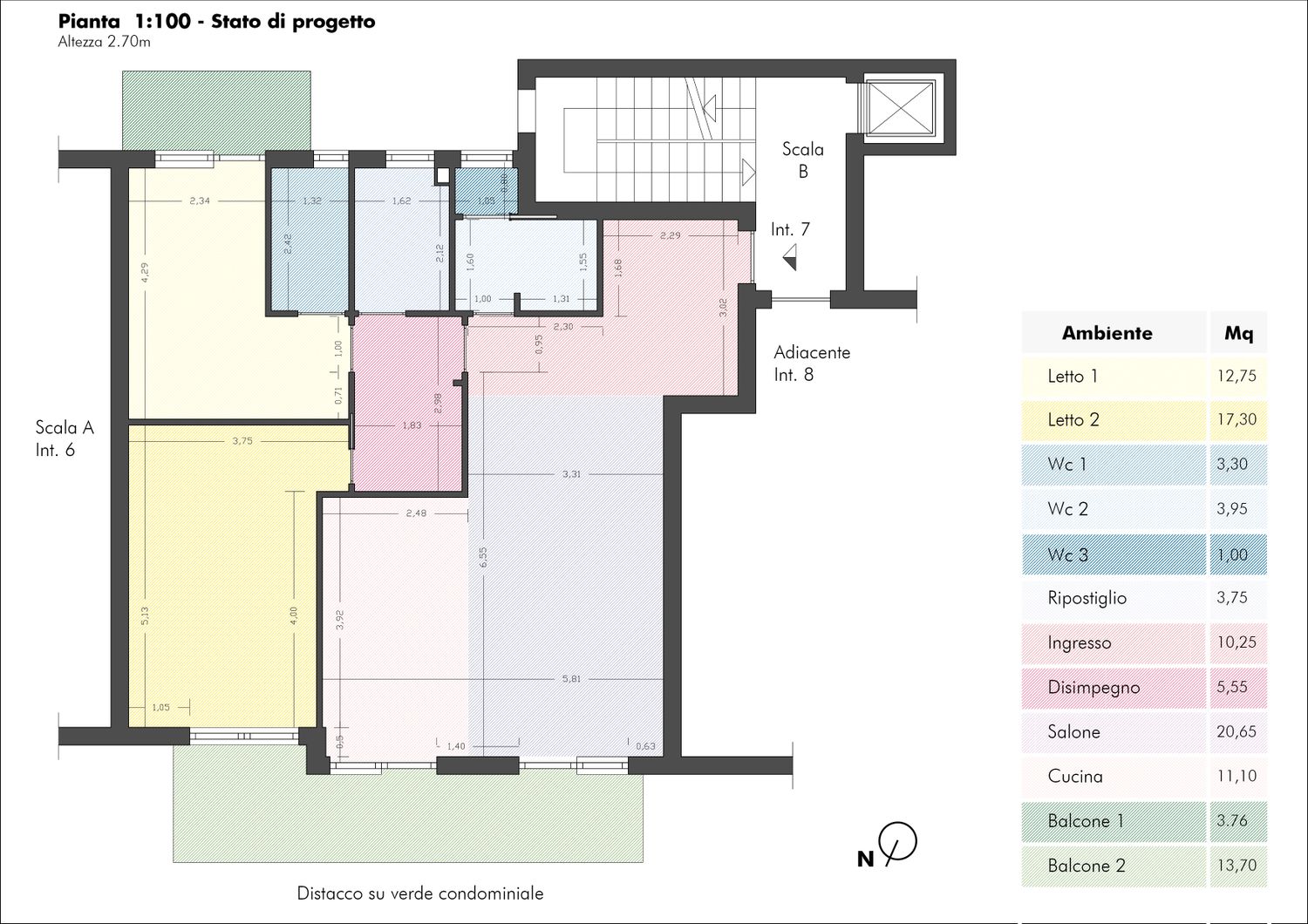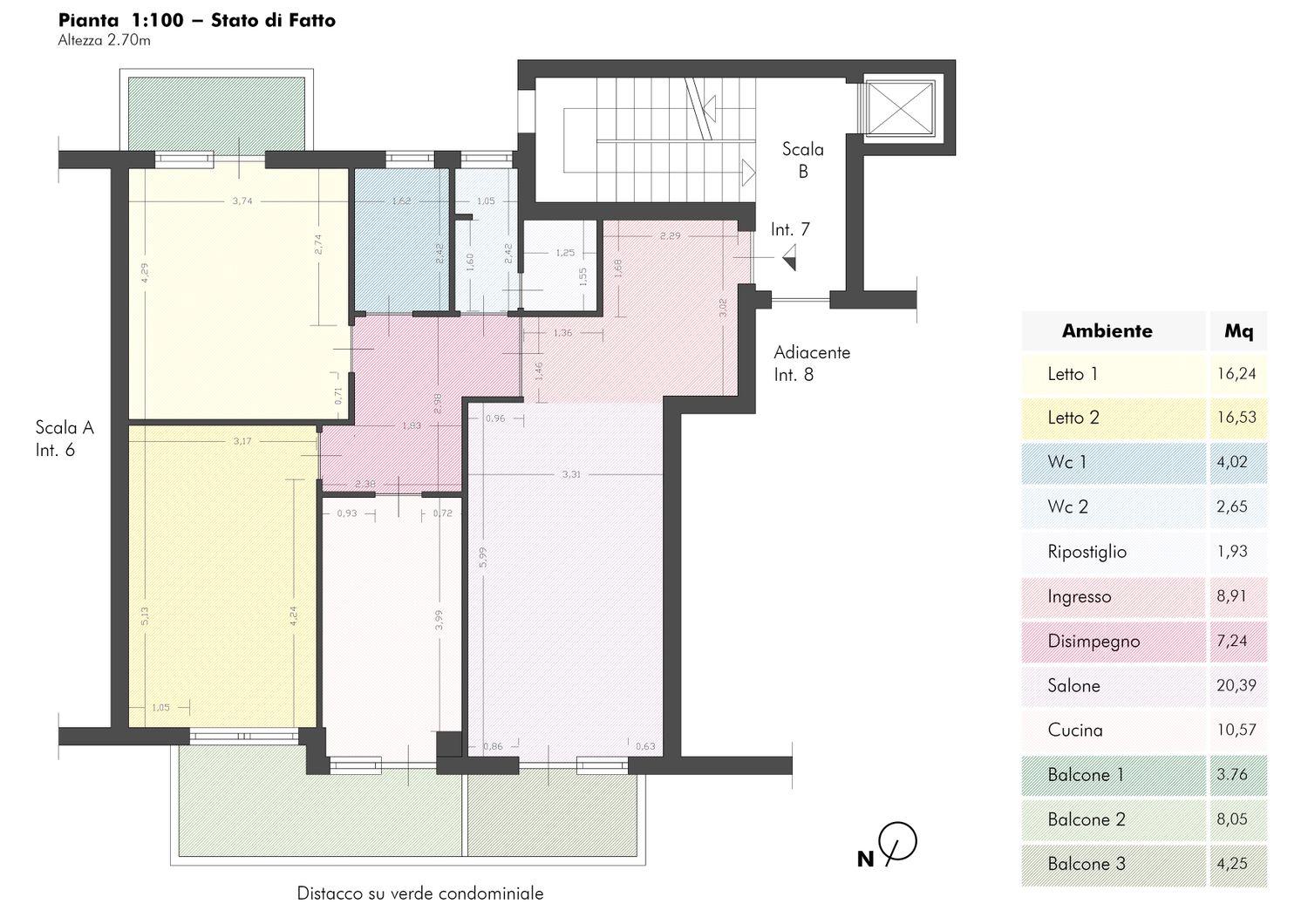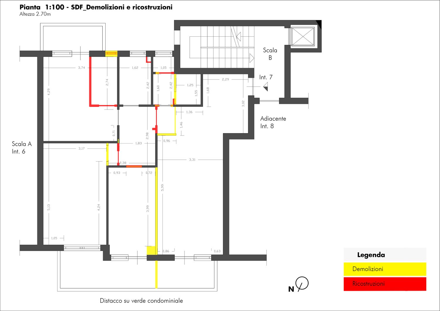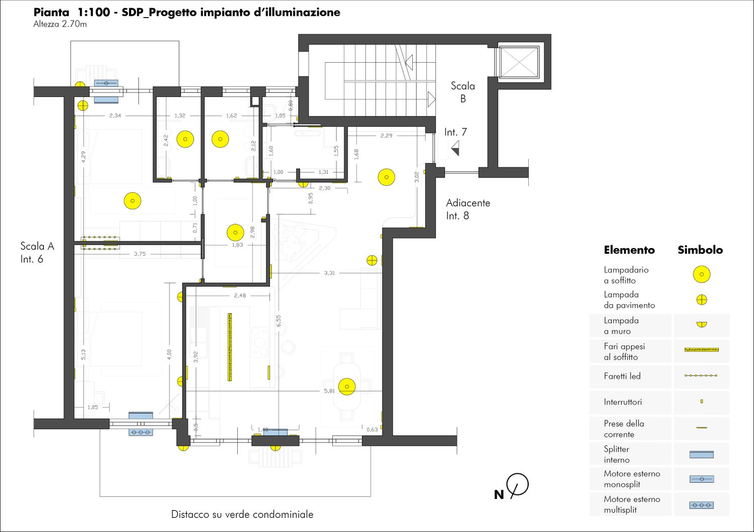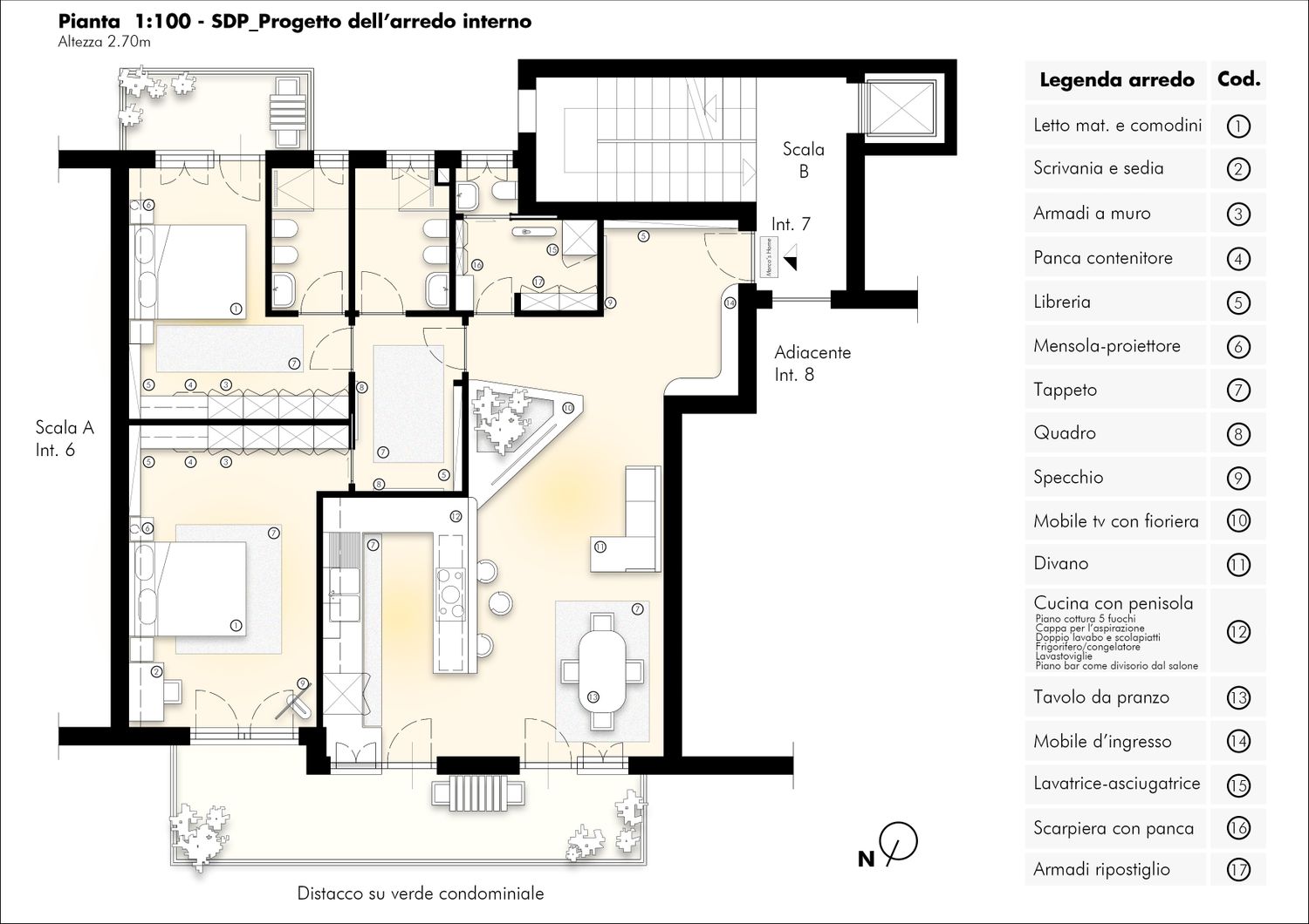 Con l'obiettivo si rispondere a tutte le esigenze, sono partito con l'unire cucina e salone, ricavando lo spazio per la realizzazione di una cucina con penisola che comunicasse con il salone, sfruttando il piano lavoro e la cappa posizionata sopra come elementi di filtro tra i due ambienti. Successivamente ho deciso di ridistribuire lo spazio dedicato al disimpegno della zona notta, ottenendo maggior spazio per l'ingresso e per il salone, in particolare per un bel mobile tv ampio e comodo. Questa ridistribuzione mi è servita anche per aumentare la superficie della seconda camera da letto, cosi da ricavare lo spazio per delle armadiature a muro ed ogni elemento potesse servire per la camera. Nella camera patronale ho realizzato un bagno privato, sfruttando la vicinanza con il bagno esistente, cosi da facilitare lavori di impiantistica, mentre l'attuale " Bagno 2" è diventato un bagno funzionale per ospiti, e zona lavanderia/ripostiglio. Infine per quanto riguarda la parte impiantistica, nelle due camere saranno presenti degli splitter con macchina esterna e proiettori per la riproduzione video/audio, nel salone-cucina un unico splitter con macchina esterna, mentre per la riproduzione video/audio una smart-tv.