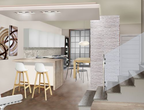 Togliere arco in muratura che divide cucina/soggiorno. Togliere anche muretto divisorio e in soggiorno pareti con pietre a vista