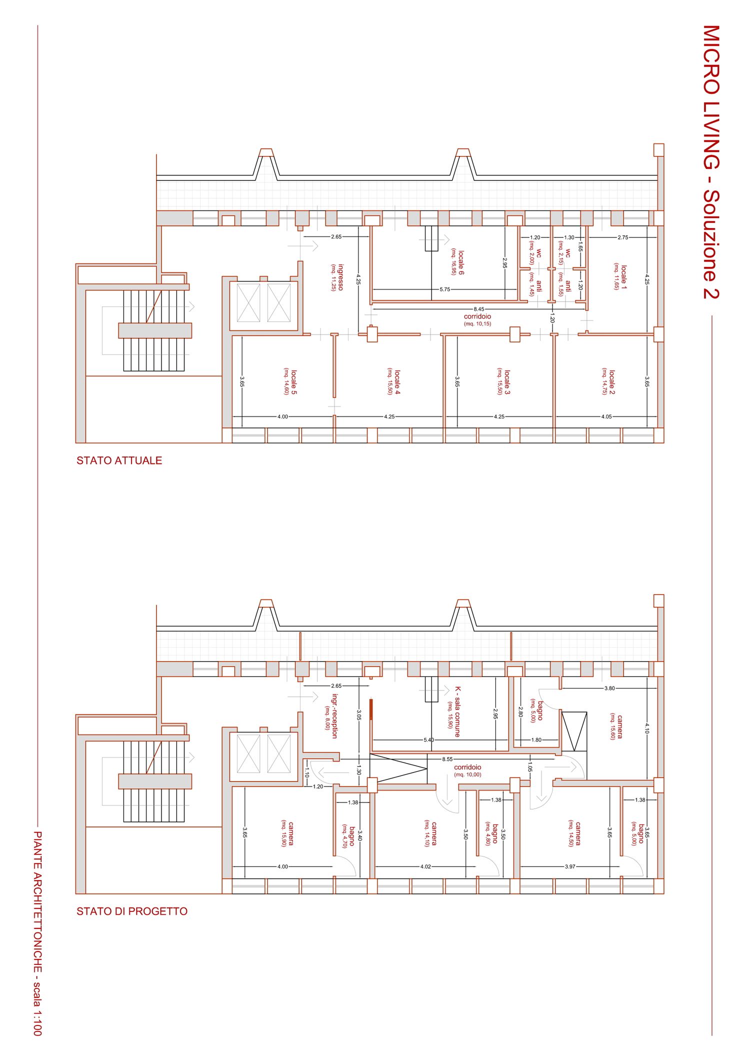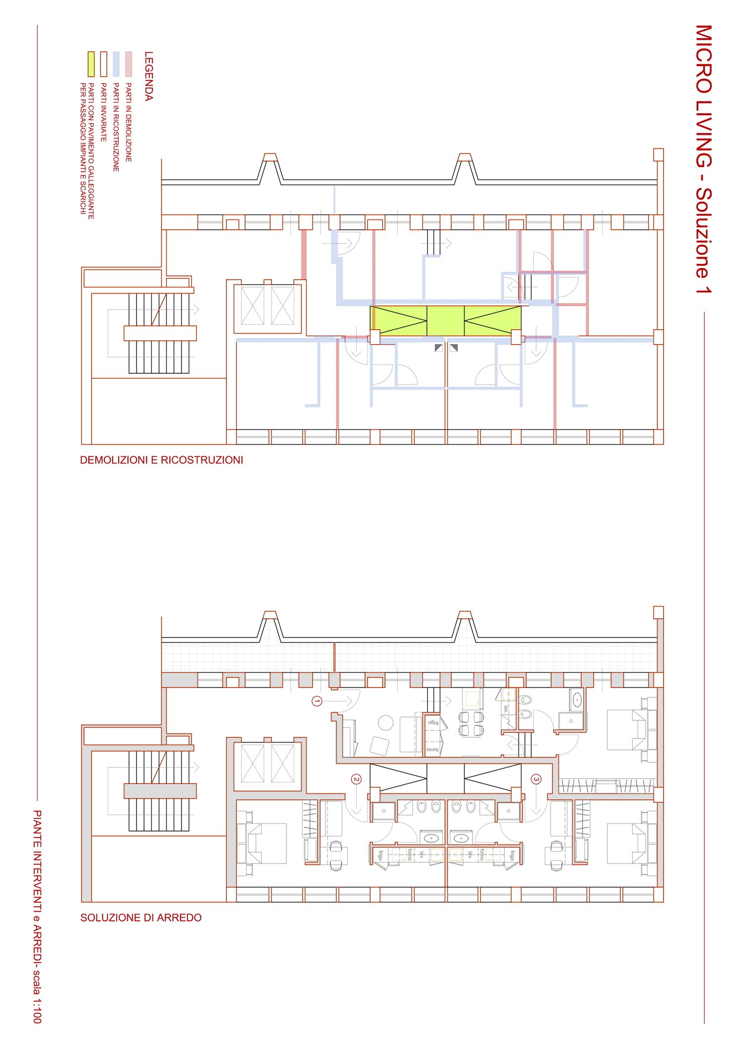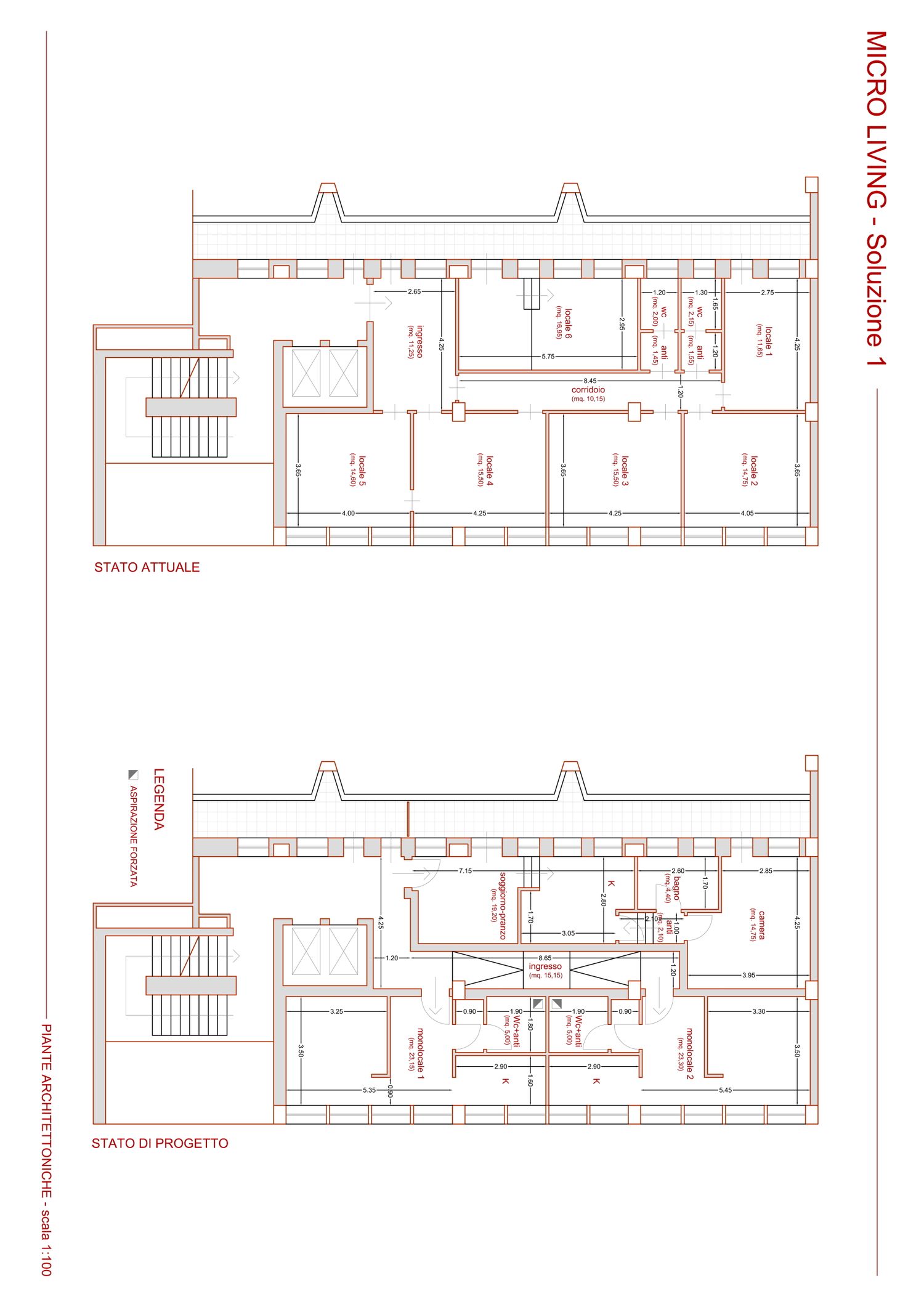 SOLUZIONE 1 (Monolocali): Il progetto prevede la realizzazione di n° 2 monolocali pressoché identici, in luogo delle stanze poste sul lato destro del piano, dotati di spazio soggiorno pranzo, cucina, letto e wc con antibagno. Si prevede altresì di ricavare un appartamento bilocale sugli spazi posti a sinistra del piano comunicanti con l’adiacente balcone; lo stesso sarà dotato di ingresso soggiorno, spazio cucina-pranzo, camera matrimoniale e bagno.