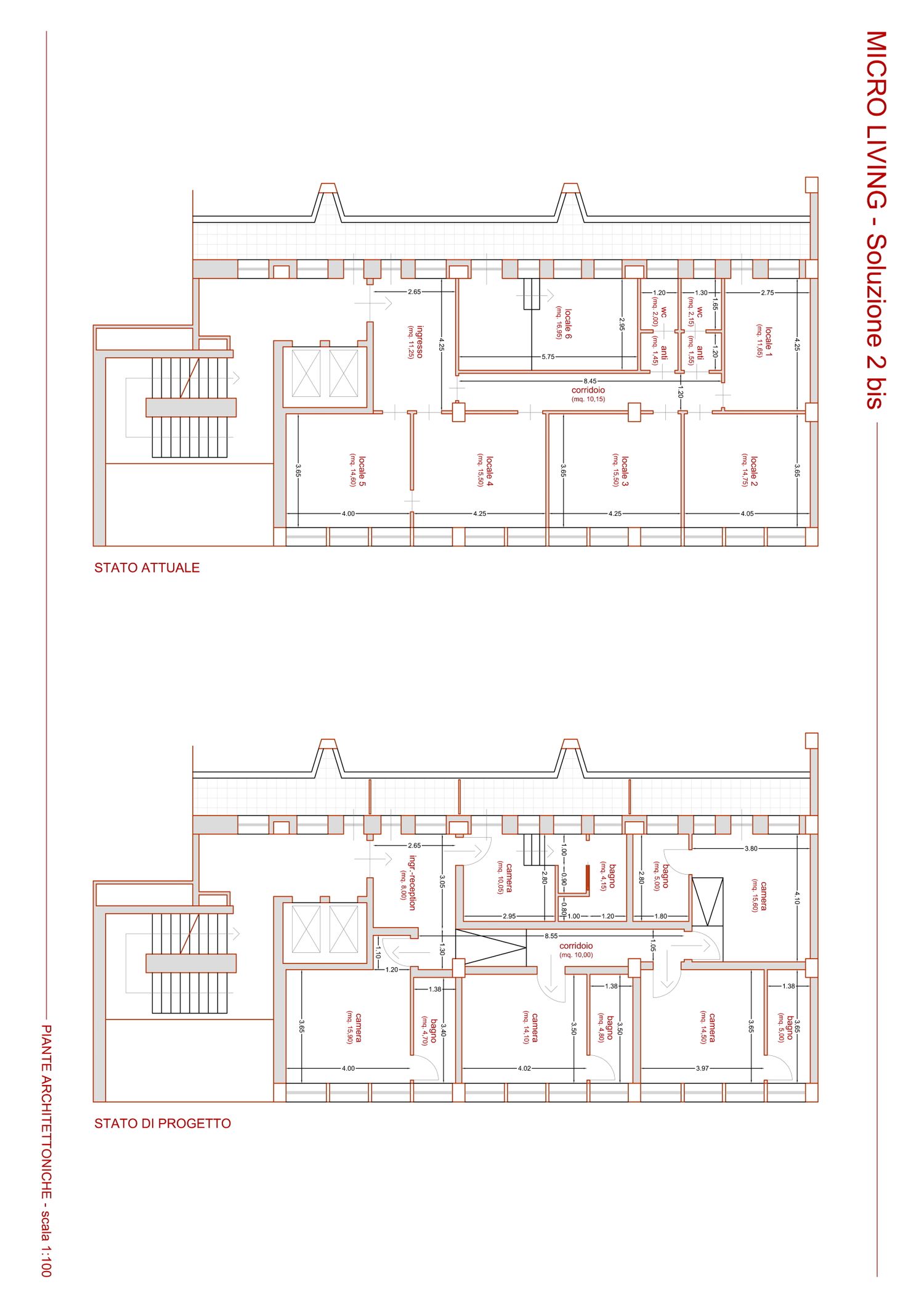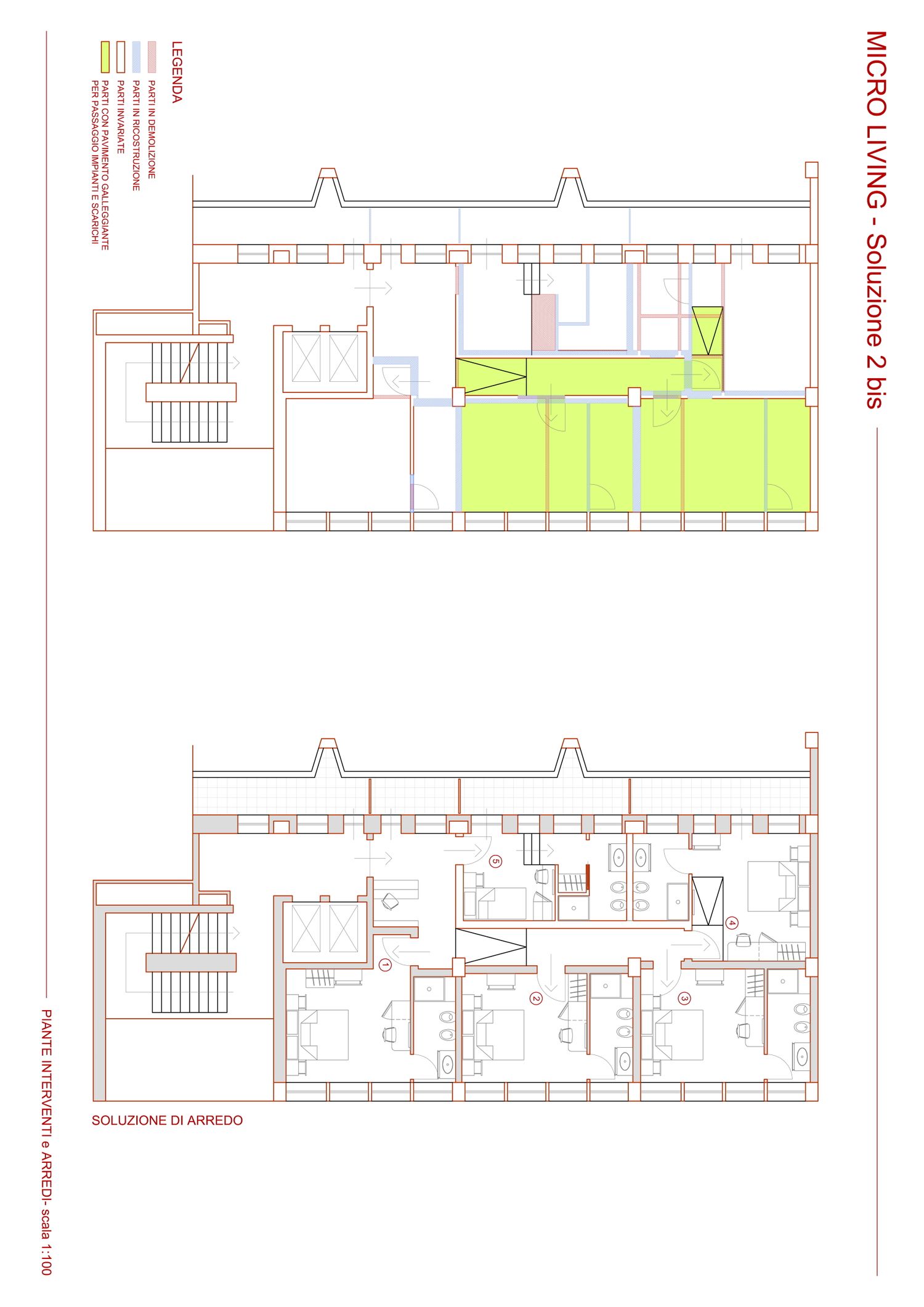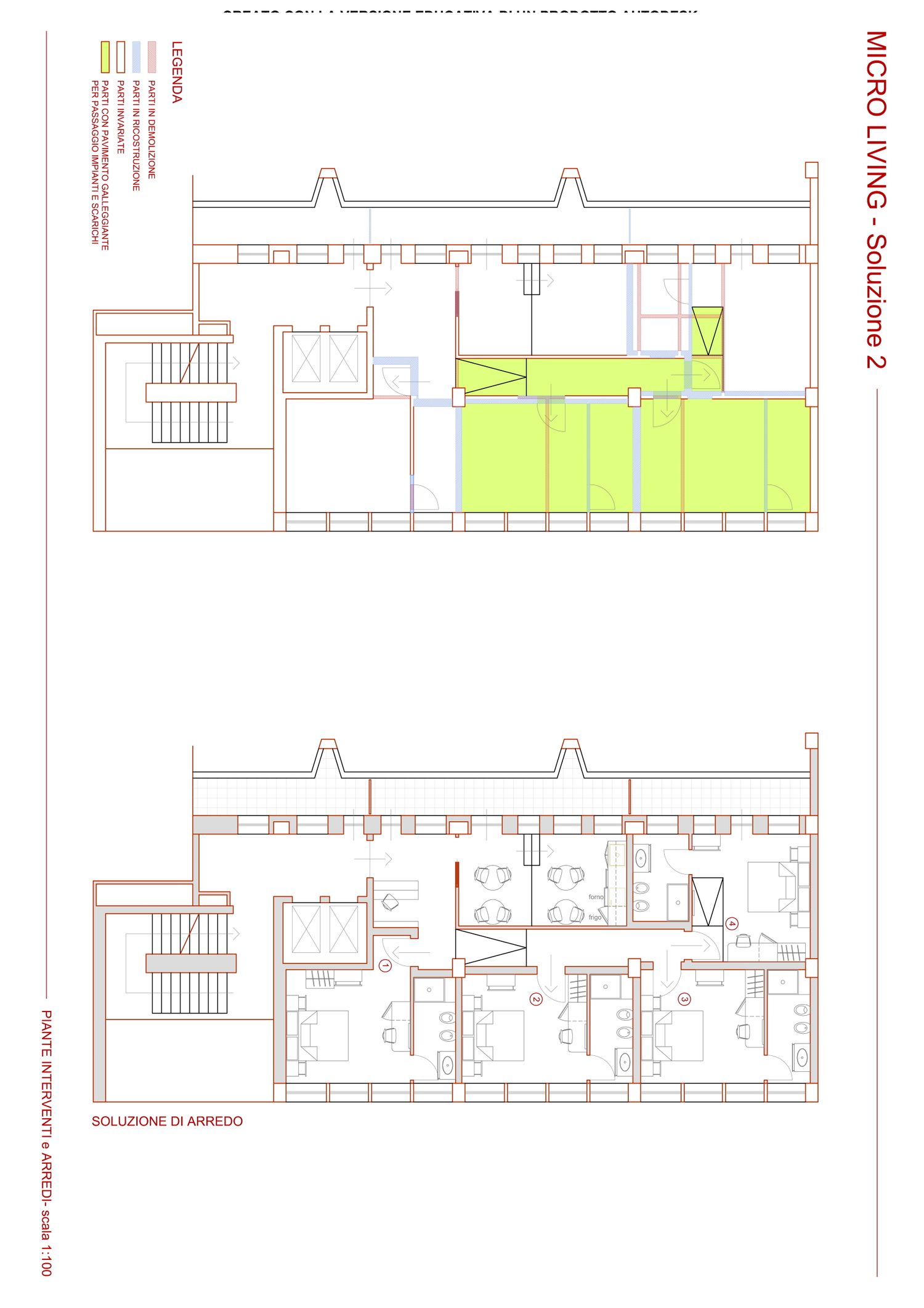 SOLUZIONE 1 (Monolocali): Il progetto prevede la realizzazione di n° 2 monolocali pressoché identici, in luogo delle stanze poste sul lato destro del piano, dotati di spazio soggiorno pranzo, cucina, letto e wc con antibagno. Si prevede altresì di ricavare un appartamento bilocale sugli spazi posti a sinistra del piano comunicanti con l’adiacente balcone; lo stesso sarà dotato di ingresso soggiorno, spazio cucina-pranzo, camera matrimoniale e bagno.