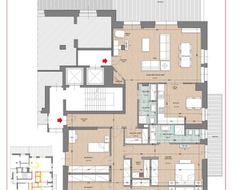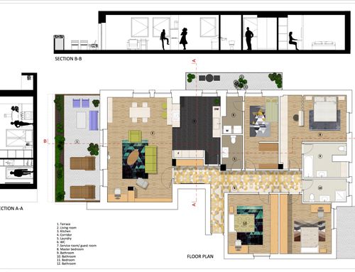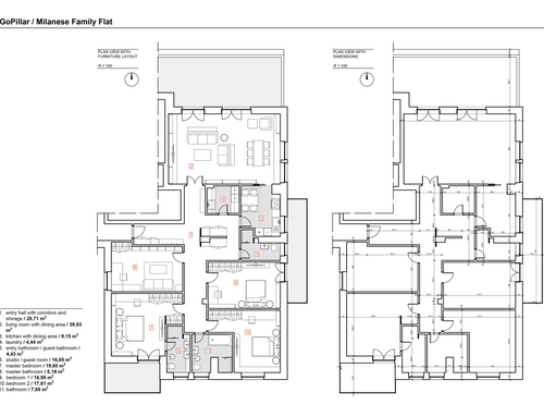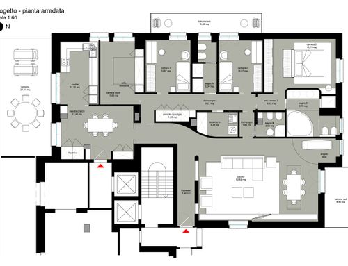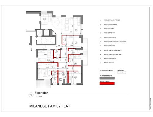 We want to rearrange the spaces/rooms of a portion of the building resulting from a split of a BIG 60s flat apartment. The house will be the home of a family with childrens and has to be totally renovate. The desire would be to have 3 bedrooms, the master one with private bathroom, a large living room with dining room, the kitchen with a table for 4 people and a service area with bathroom and laundry with the opportunity of conversion / use as guests room.