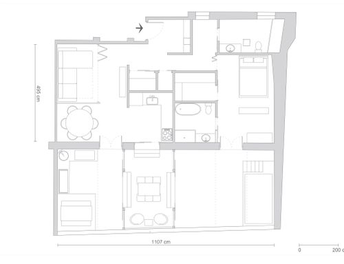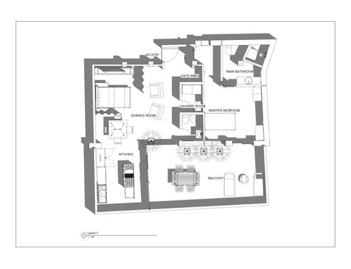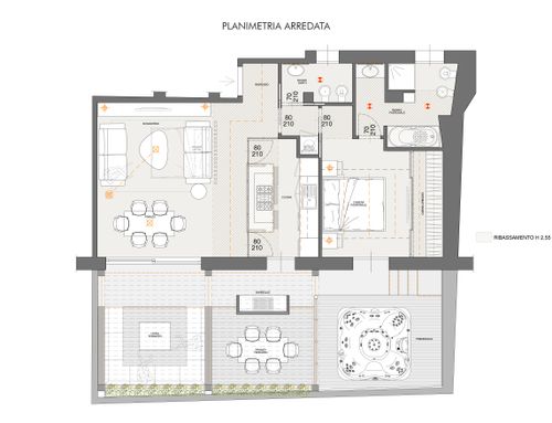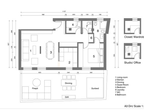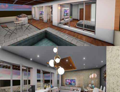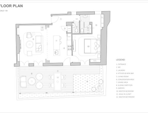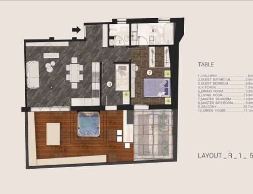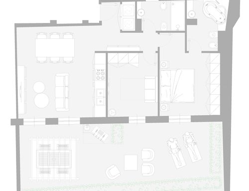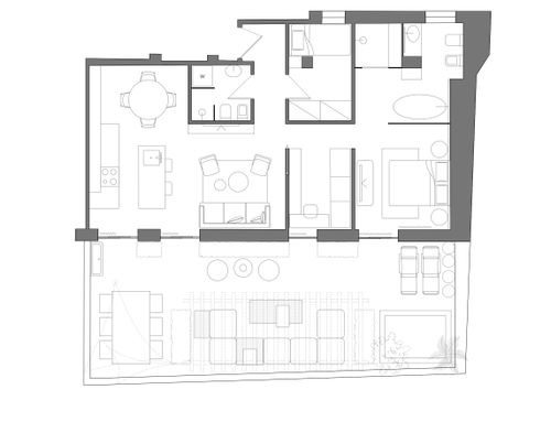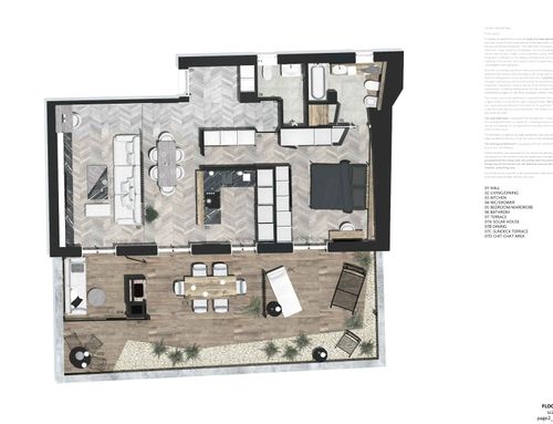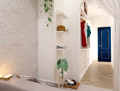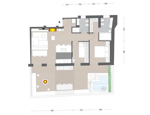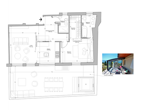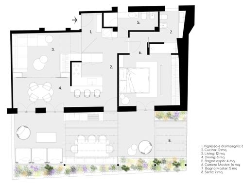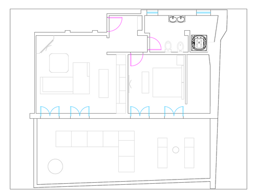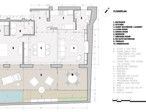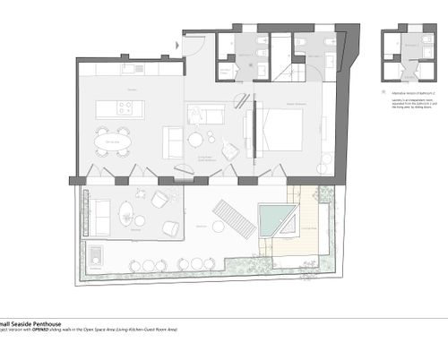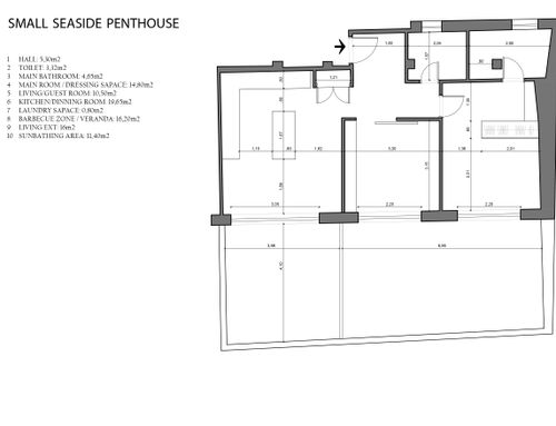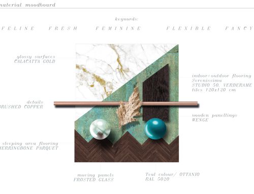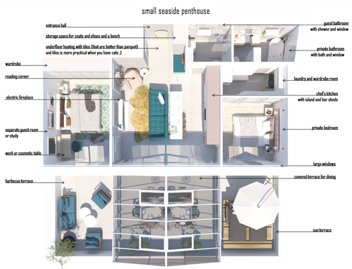 this is my holiday home but not only for holidays. I live alone with 2 cats. I want a feminine, luxurious space, reminiscent of a luxury hotel suite, where I can host friends for dinner and maybe for the weekend. therefore there must be a space for guests either a second bedroom or living room that can be transformed into a second bedroom. there must be two bathrooms, a master one with a large tub / shower and a small guest bathroom with the essentials. the kitchen must be well equipped, I like to cook, but it must be structured so that any mess in the kitchen is not really in plain sight. the outdoor area must include a sunbathing area, a conversation and a dining area , maybe a barbecue and must be designed as a natural extension of the interior. I have many clothes, shoes, bags, therefore wardrobe area must be large and there must also be a tiny laundry space. I love open spaces, with retractable divisions as being almost always alone the house is for my exclusive use, but I have to be able to compartmentalize it if necessary. it is possible to create a solar greenhouse on the terrace.