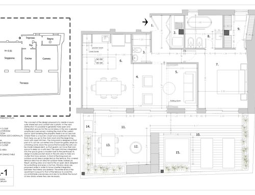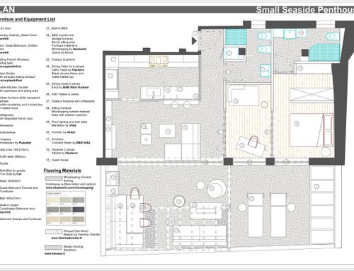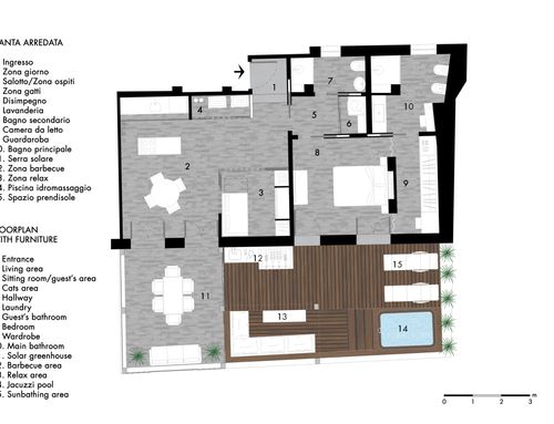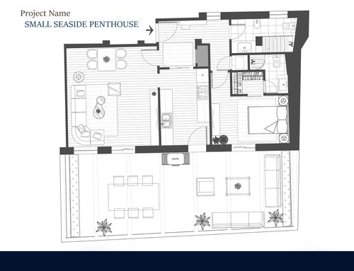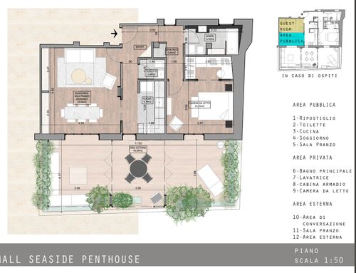 questa è la mia seconda casa, per le vacanze ma non solo. vivo da sola con dei gatti. desidero uno spazio femminile, lussuoso, che ricordi la suite di un hotel di lusso, dove poter ospitare amici a cena e magari per il weekend. quindi deve esserci uno spazio per gli ospiti, o una seconda camera o un soggiorno che si possa trasformare in seconda camera. ci devono essere due bagni, uno padronale con una grande vasca/doccia e un piccolo bagno ospiti con l'indispensabile. la cucina deve essere ben equipaggiata, mi piace cucinare, ma deve essere strutturata in modo che un eventuale disordine in cucina non sia proprio in bella vista. l'area esterna deve comprendere uno spazio prendisole, uno conversazione e uno pranzo con la possibilità magari di fare un barbecue e deve essere progettato come una naturale estensione dell'interno. ho molti abiti, scarpe, borse, quindi l'area guardaroba deve essere capiente e ci deve essere anche uno spazio lavanderia. lo stile non deve essere necessariamente marinaro. amo gli spazi aperti,con divisioni a scomparsa in quando essendo quasi sempre sola la casa è a mio uso esclusivo, ma devo poterla compartimentare se necessario. è possibile realizzare una serra solare sul terrazzo.