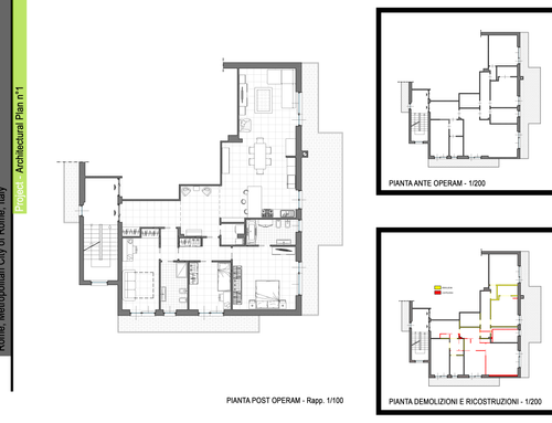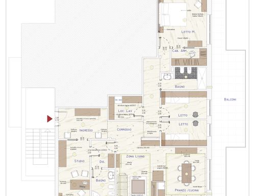 It is an apartment of about 120 square meters from the 70s. A total renovation is needed that reconsiders the various spaces, giving a new vision of the apartment. I would like to create three bedrooms, one double, one for the child and a study / guest room. Definitely 2 bathrooms, one of which with a bathtub. I like it an open and bright living space, also using the various wooden structures that are handmade by craftsmen. The bookcase / divider could be used on the wall and to restore some of the furniture in the picture if it is worth it. The kitchen or living room that looks out onto the larger terrace so you can use it for eating outside. The current closet could be useful to increase the living space but I would still like to have a similar space in the house to use as a closet, laundry room.