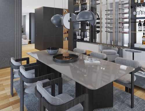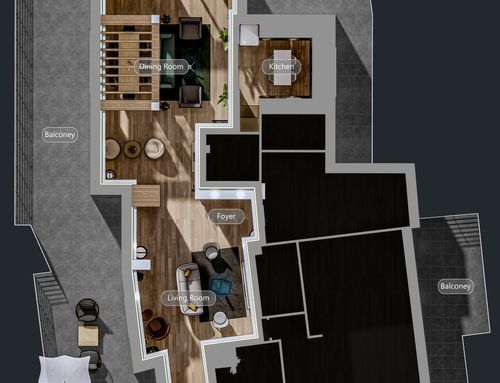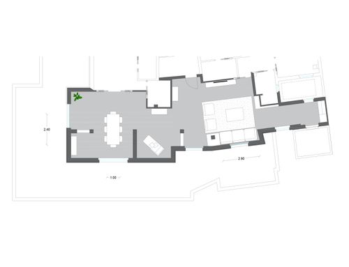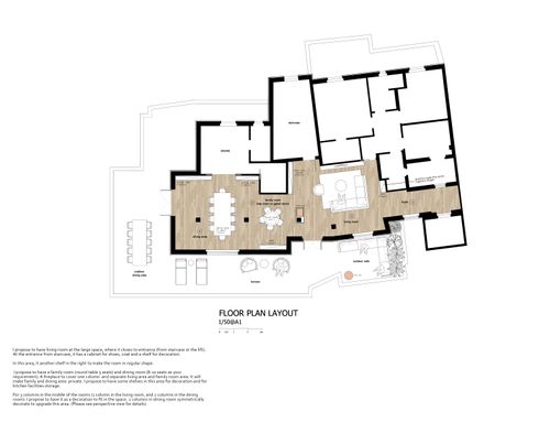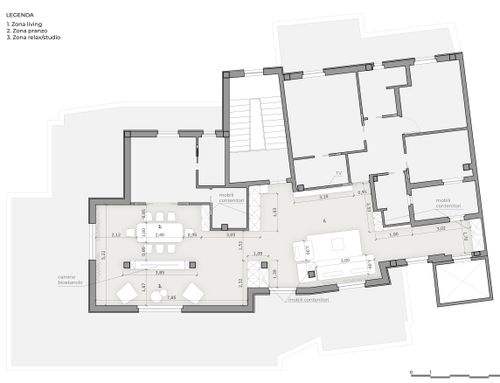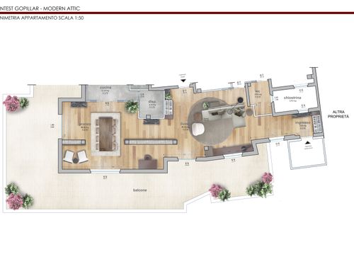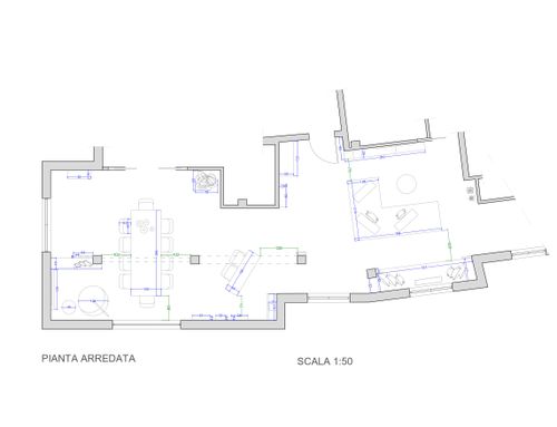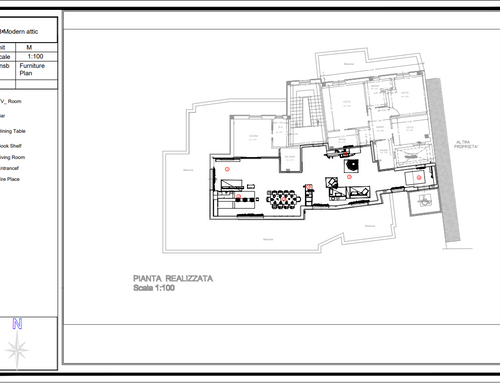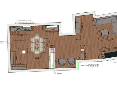 Nella zona giorno , molto ampia e luminosa , si accede direttamente o dall'ascensore o dalle scale. Ho predisposto diversi punti luce ed attacchi per la Tv. Sostanzialmente avrei bisogno di un tavolo ( magari apribile) per il pranzo , 8/10 persone, e spazi a sedere (divani e poltrone ), più mobili contenitori ( credenze e/o altro). Da due porte finestre della zona giorno si accede ad un ampio terrazzo che circonda l'attico per 180 gradi.
