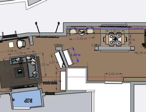 Nella zona giorno , ci sono 4 pilastri( riportati sulla pianta in celeste), che vorrei nascondere quanto più possibile con l'arredamento.