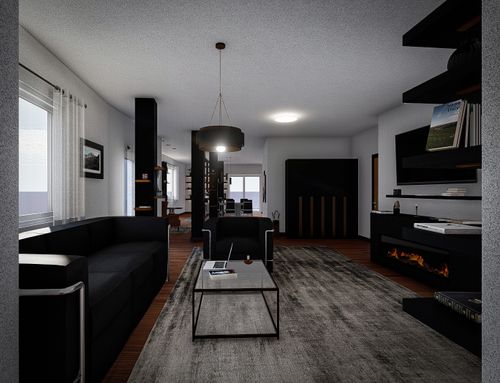 In the living area, there are 4 pillars (shown on the plan in light blue), which I would like to hide as much as possible with the furniture.