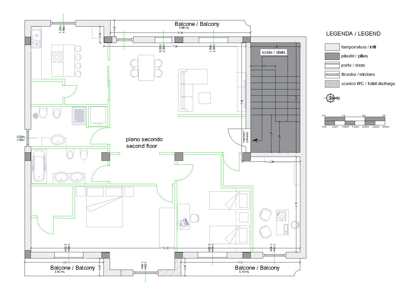 A parte opposta dell’ingresso e al centro della parete è situata l’unica colonna di scarico, sul lato sinistro vi sono due balconi e uno sul lato destro che rendono la casa molto luminosa.