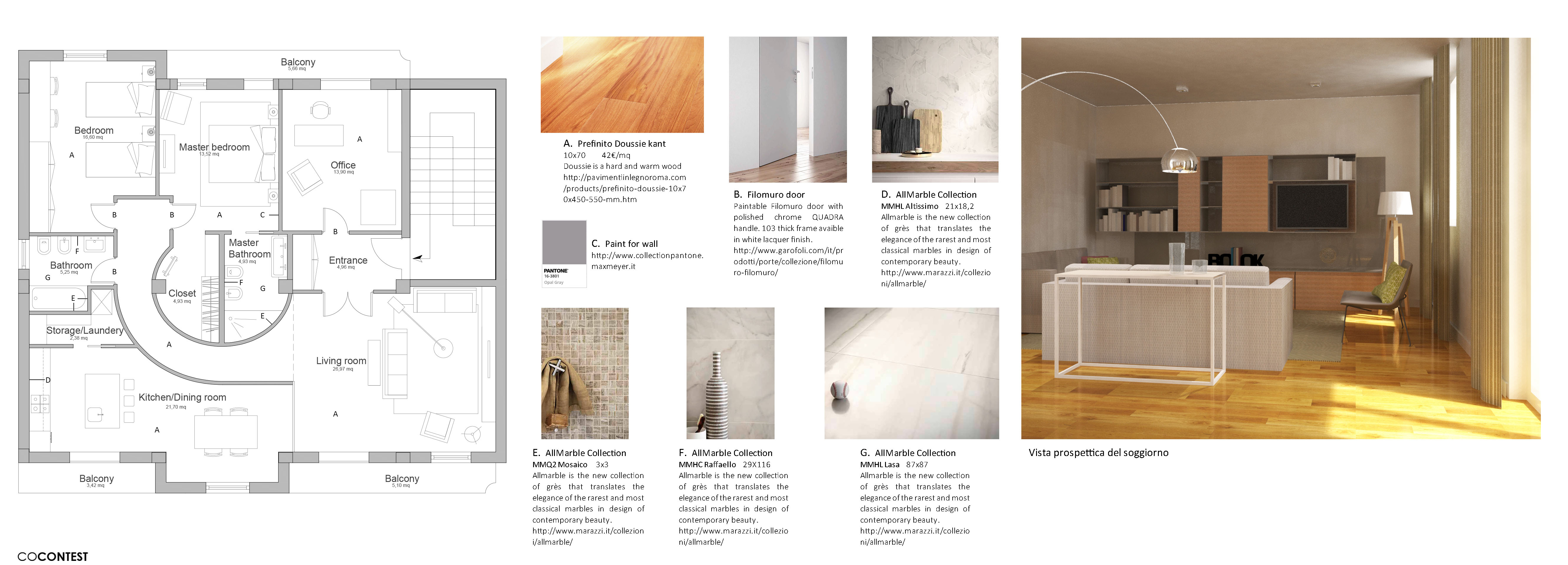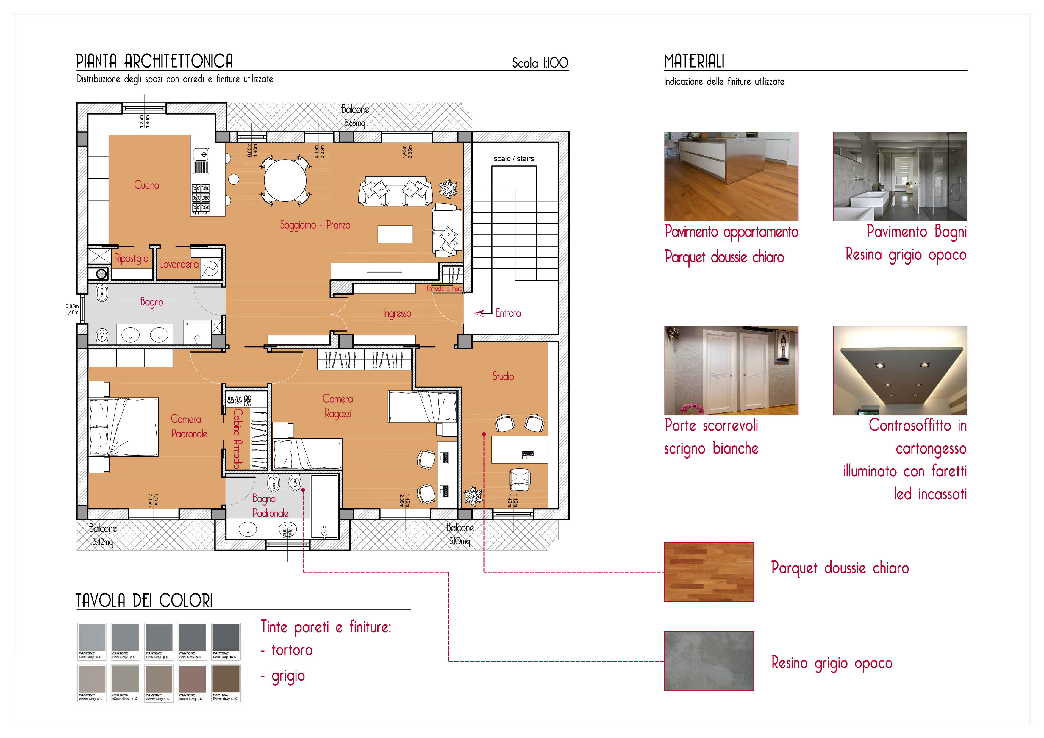 • Muri: prevalentemente bianchi con alcune pareti e/o pilastri con tonalità diverse in modo da creare un contrasto;