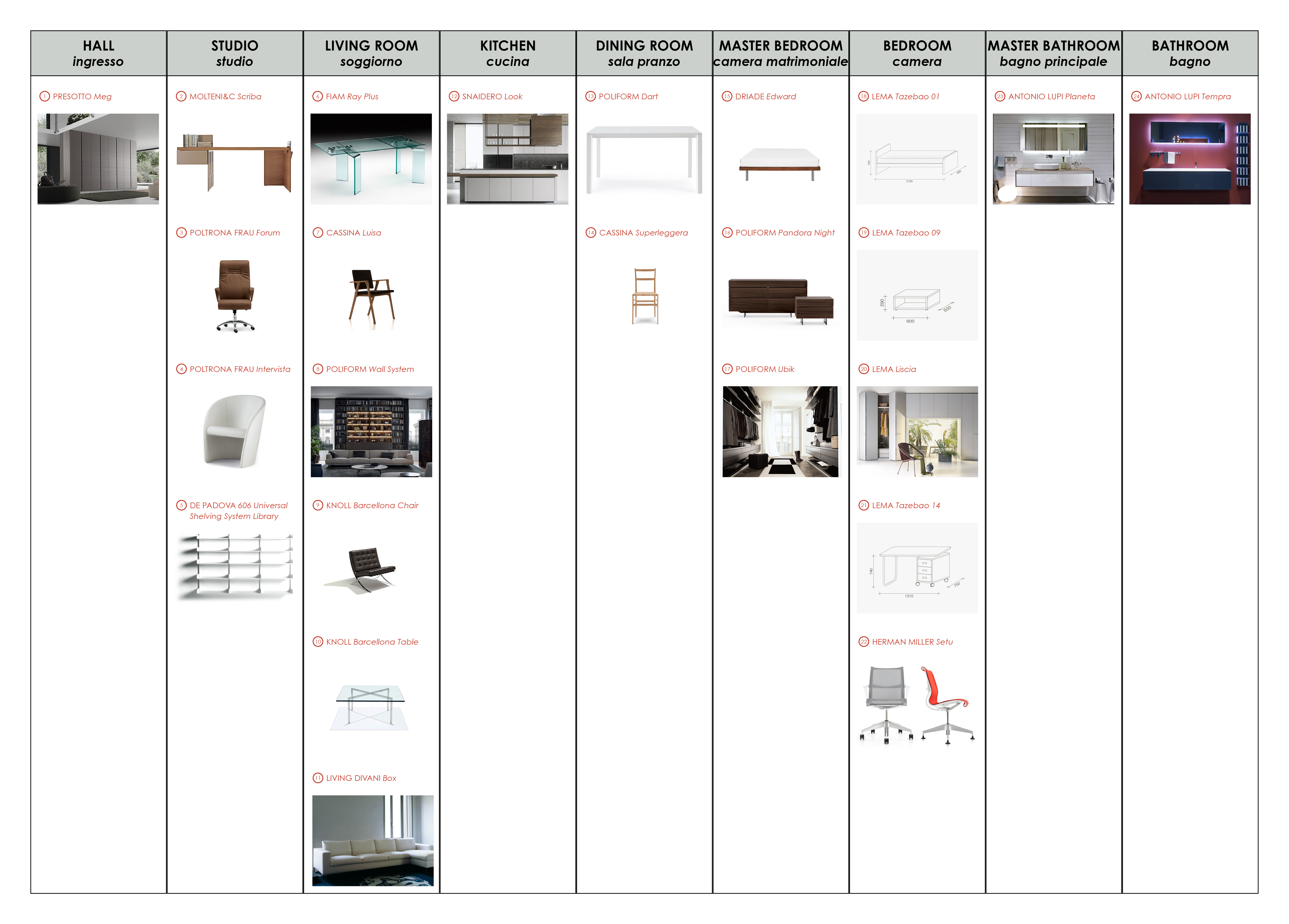 - cucina (preferibilmente su lato sinistro dell’appartamento) con isola e tavolo;